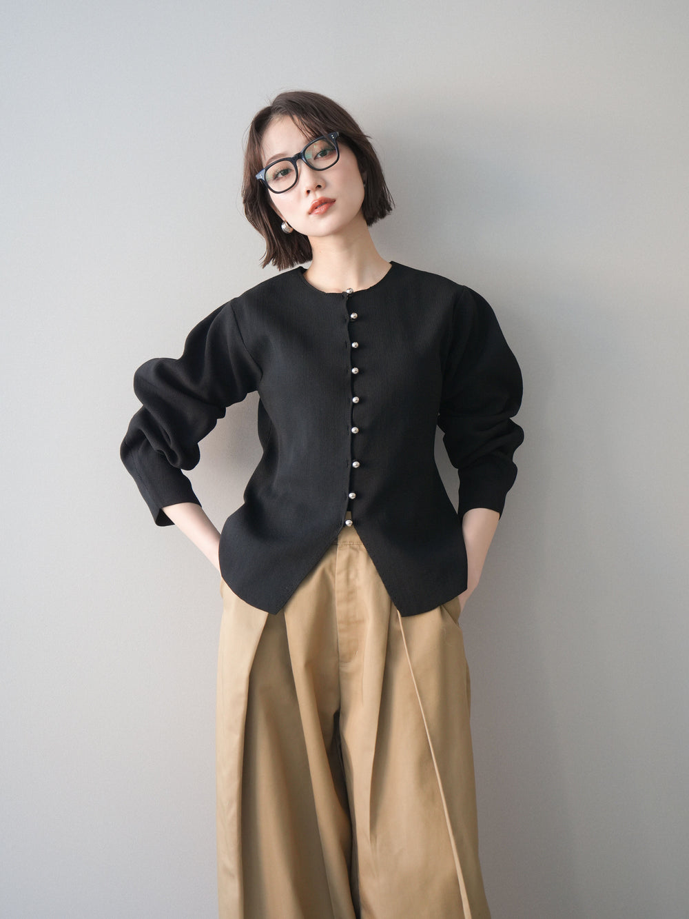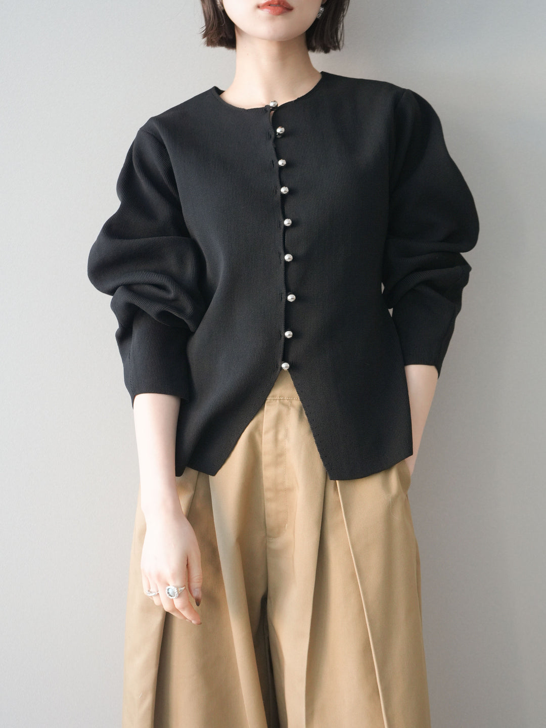 [予約]フロントスリットシルバーボタンニットカーディガン/black