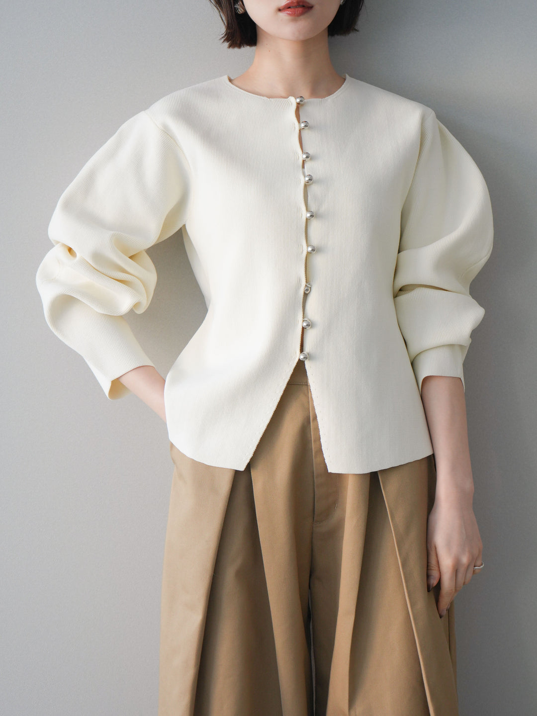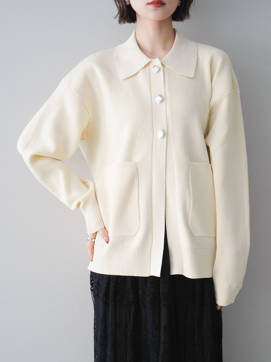 [予約]フロントスリットシルバーボタンニットカーディガン/off