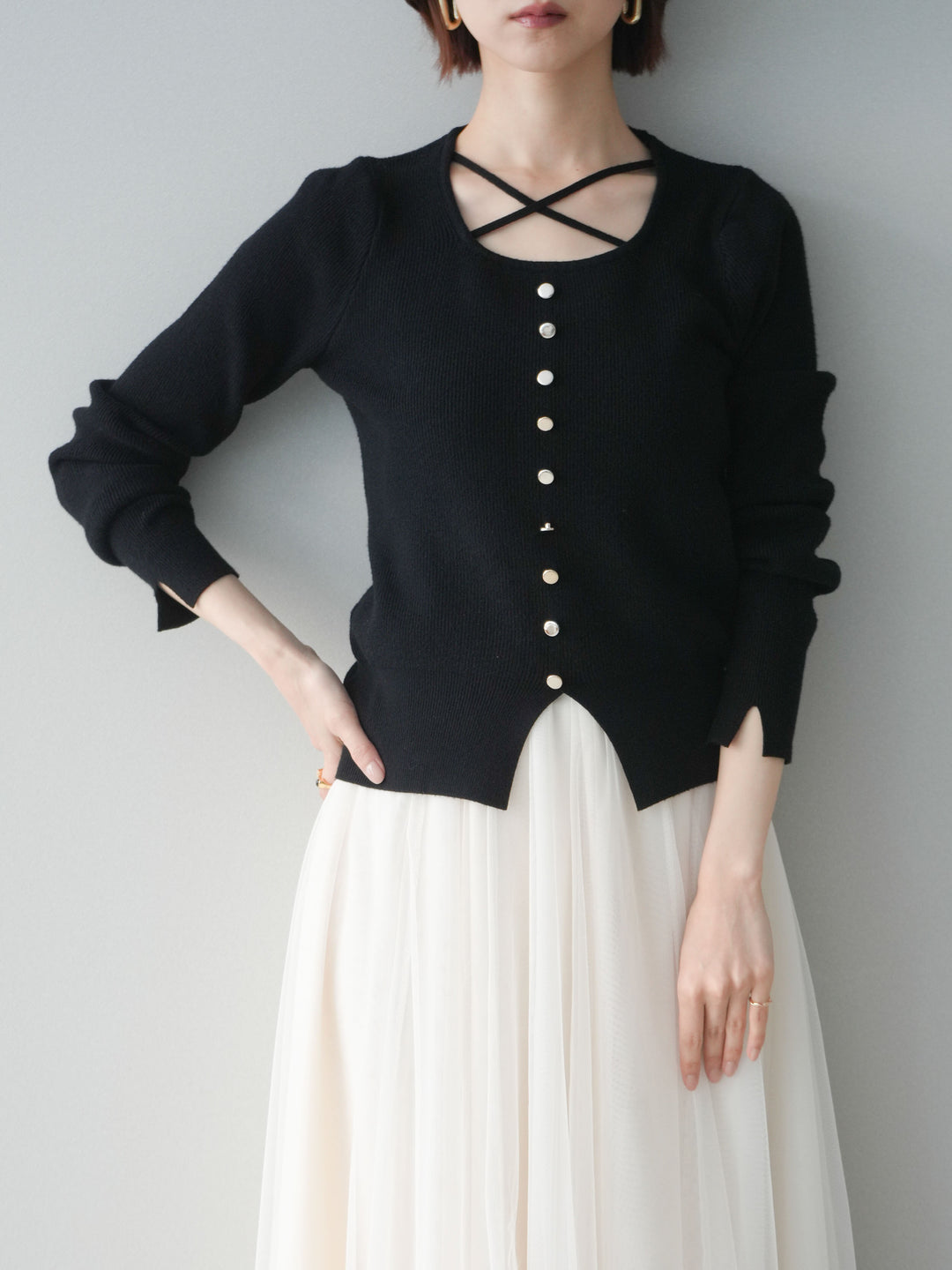 [予約]クロスデザインネックシルバーボタンニット/black