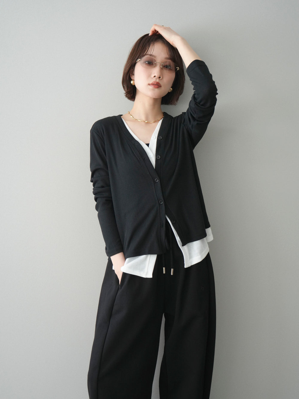 [予約]配色レイヤードカットリブカーディガン/black