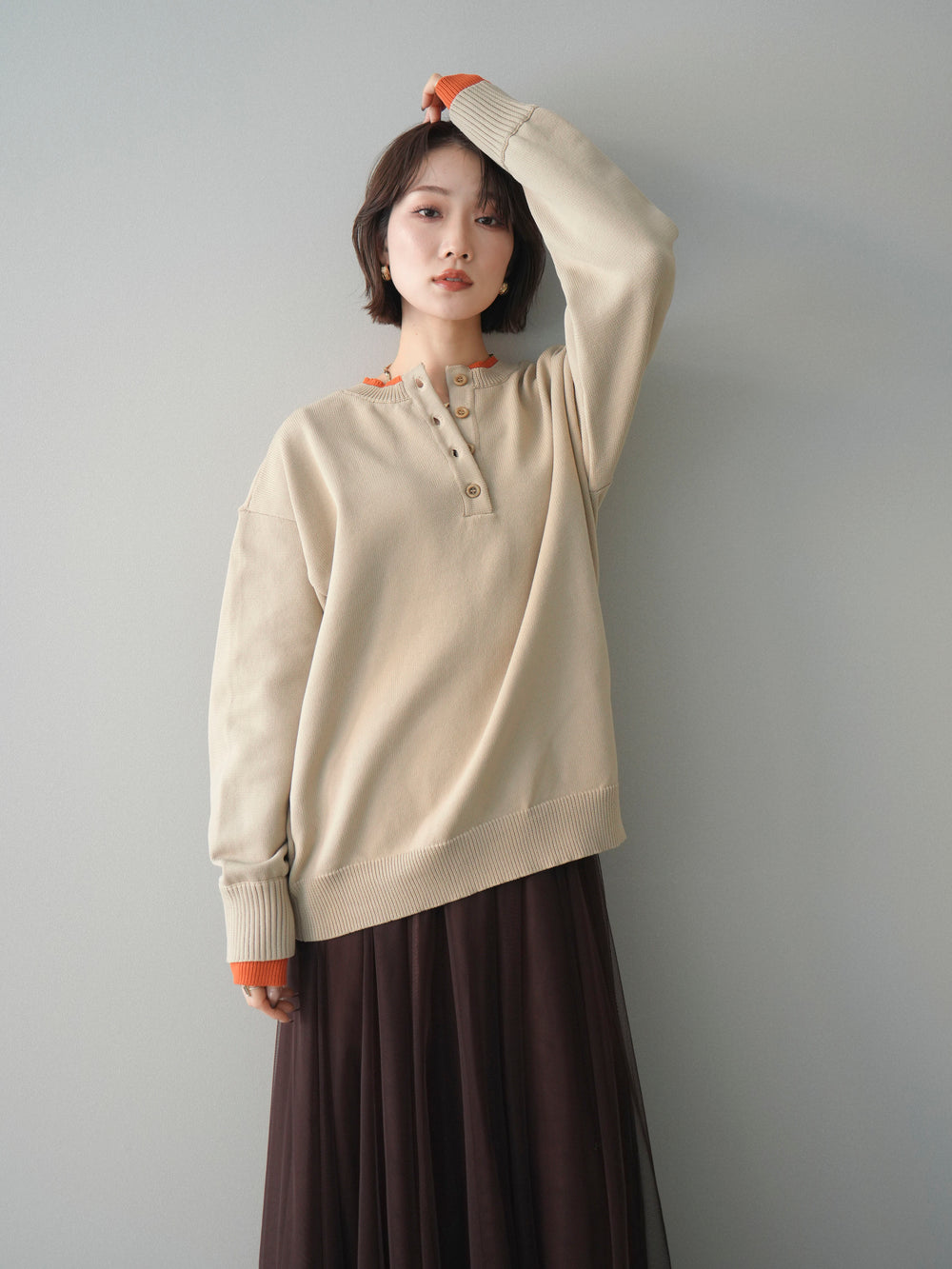 [予約]2WAYネック配色レイヤードニットプルオーバー/beige