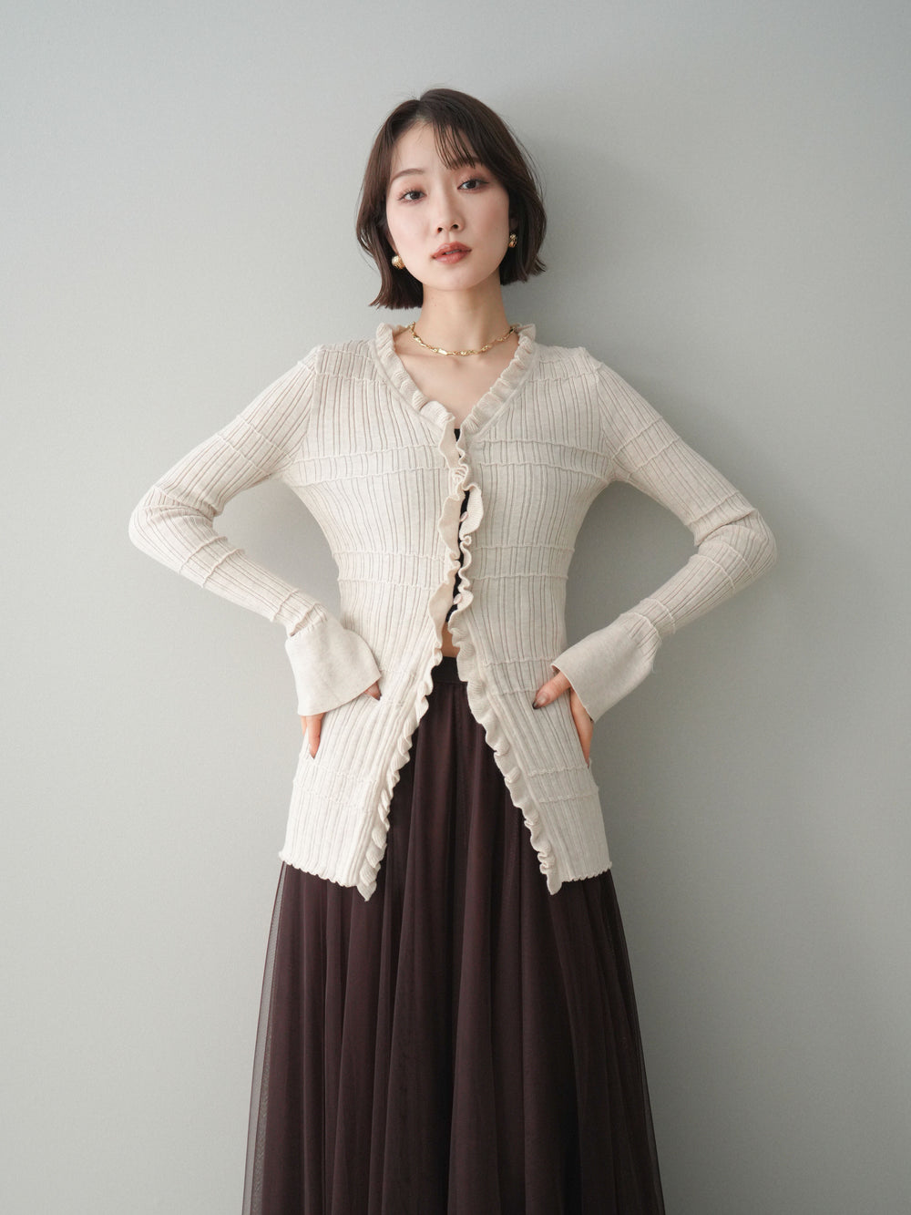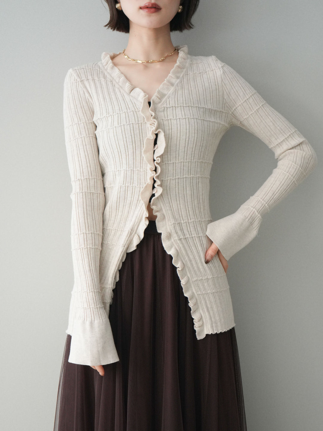 [予約]フロントフリルリブニットカーディガン/beige