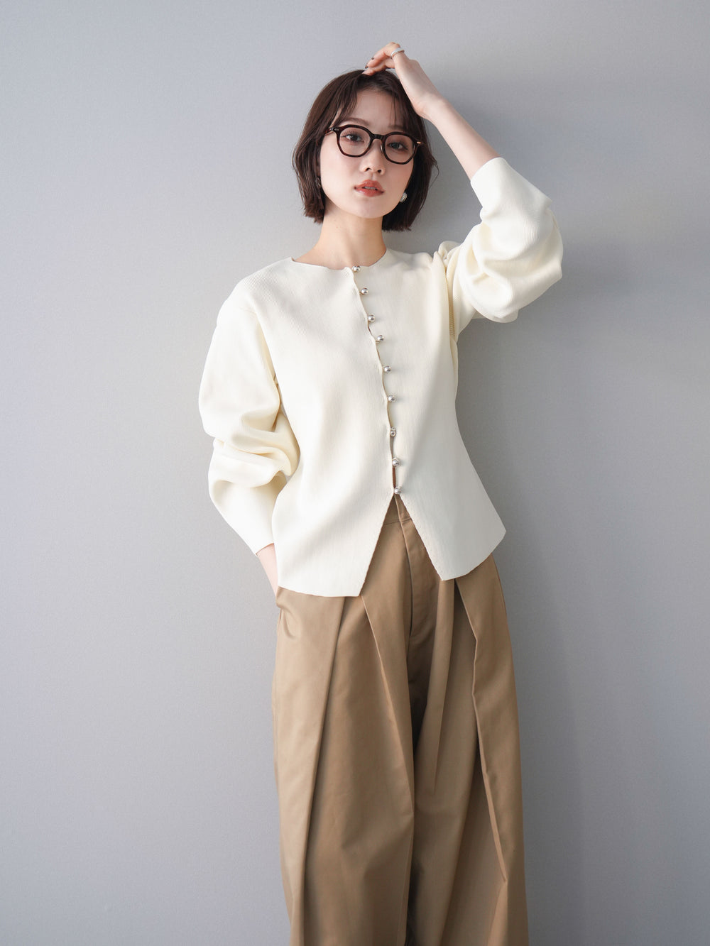 [予約]メタルボタン襟付きポリエステルニットカーディガン/ivory