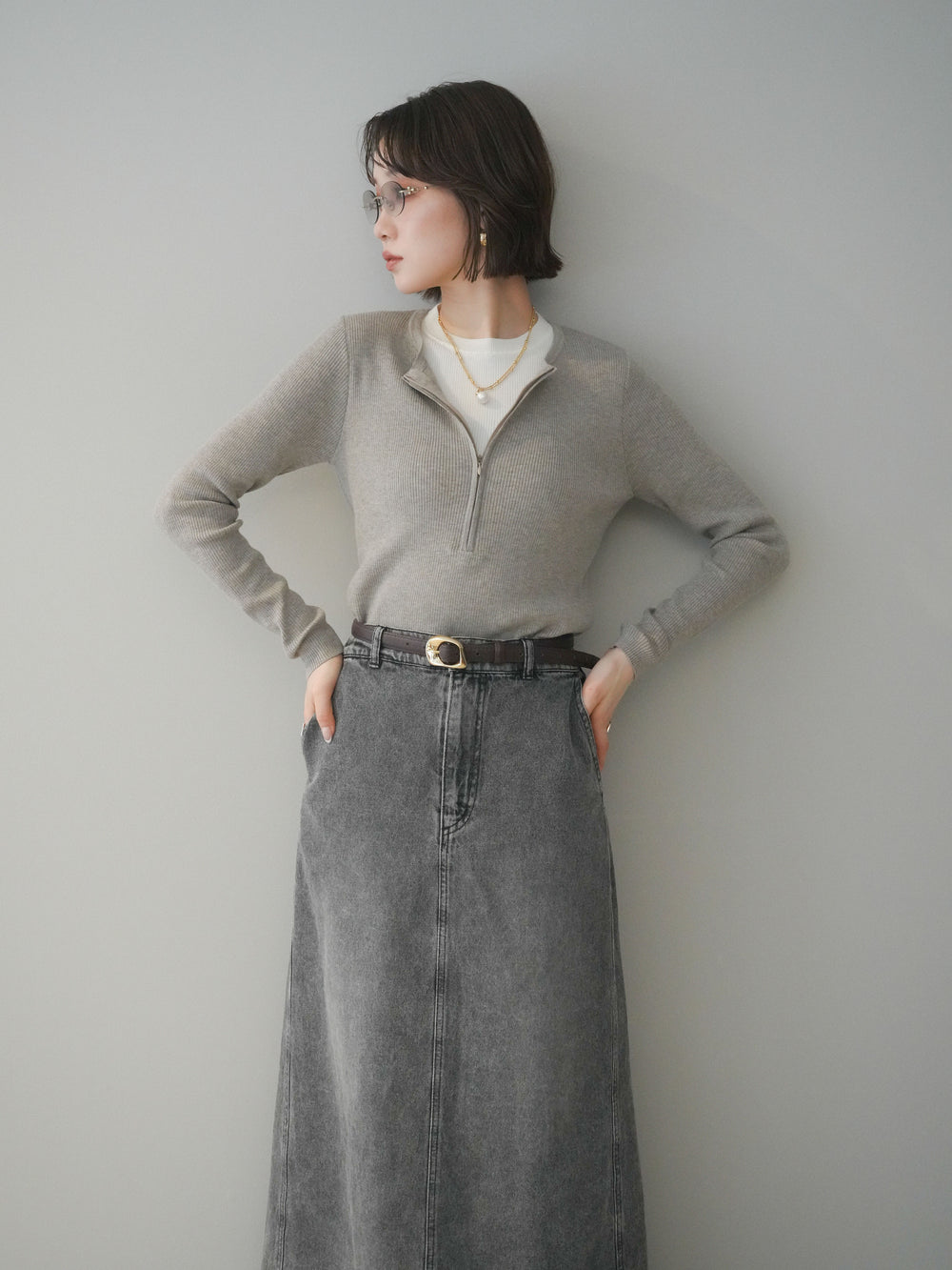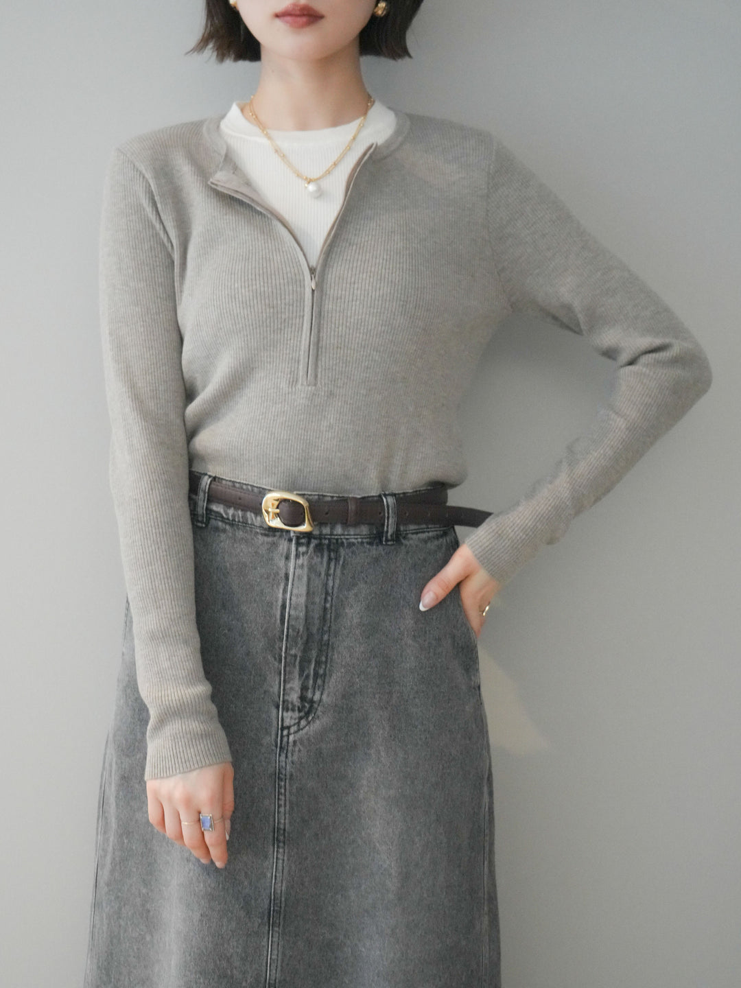 [予約]フロントジップ配色レイヤードニットトップス/gray