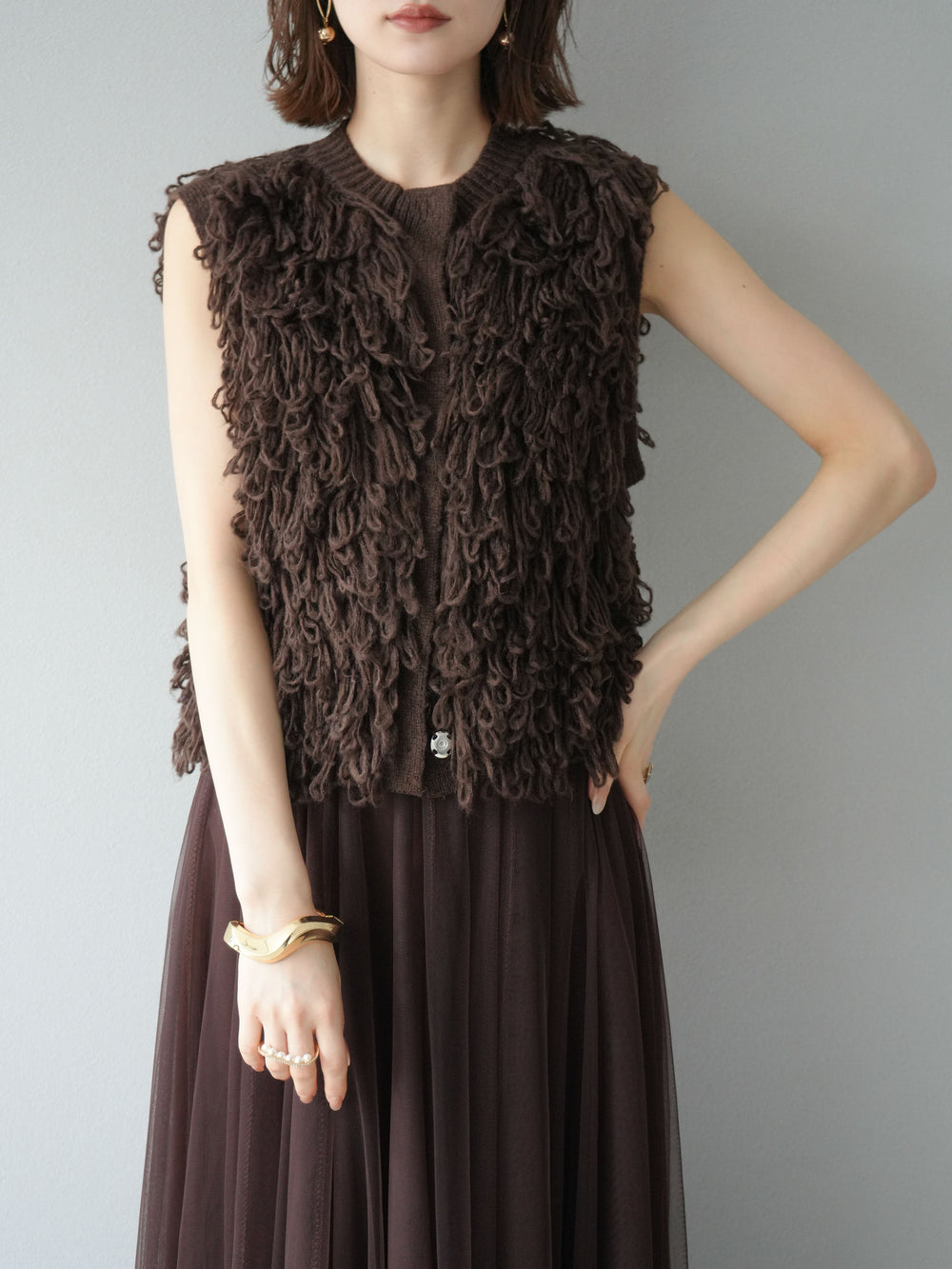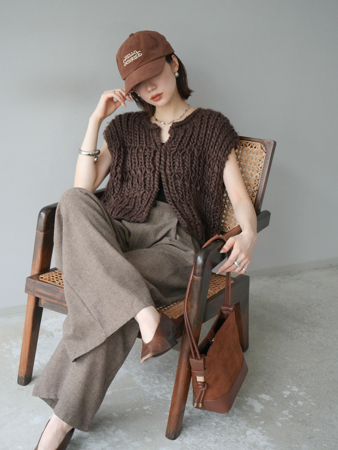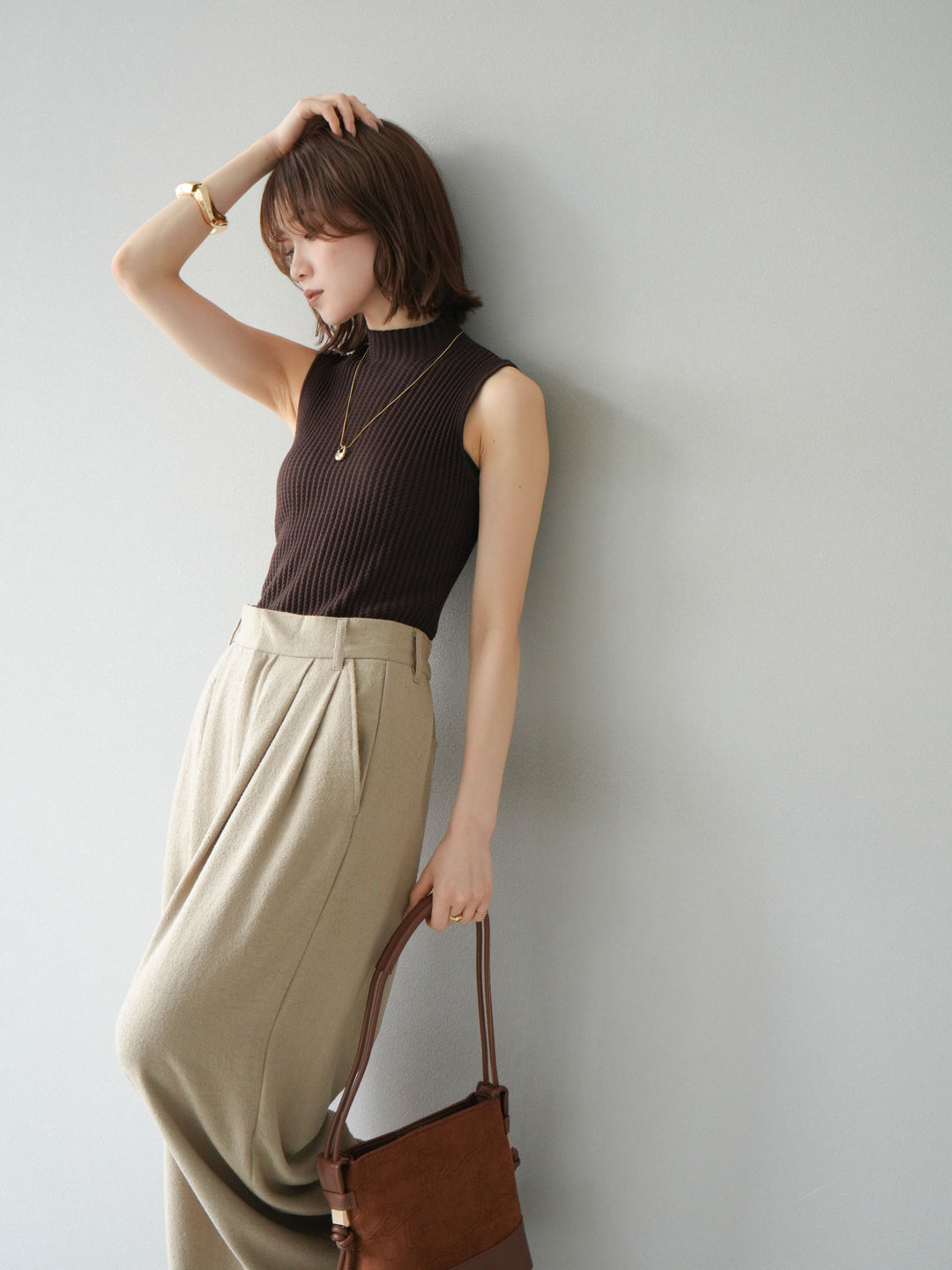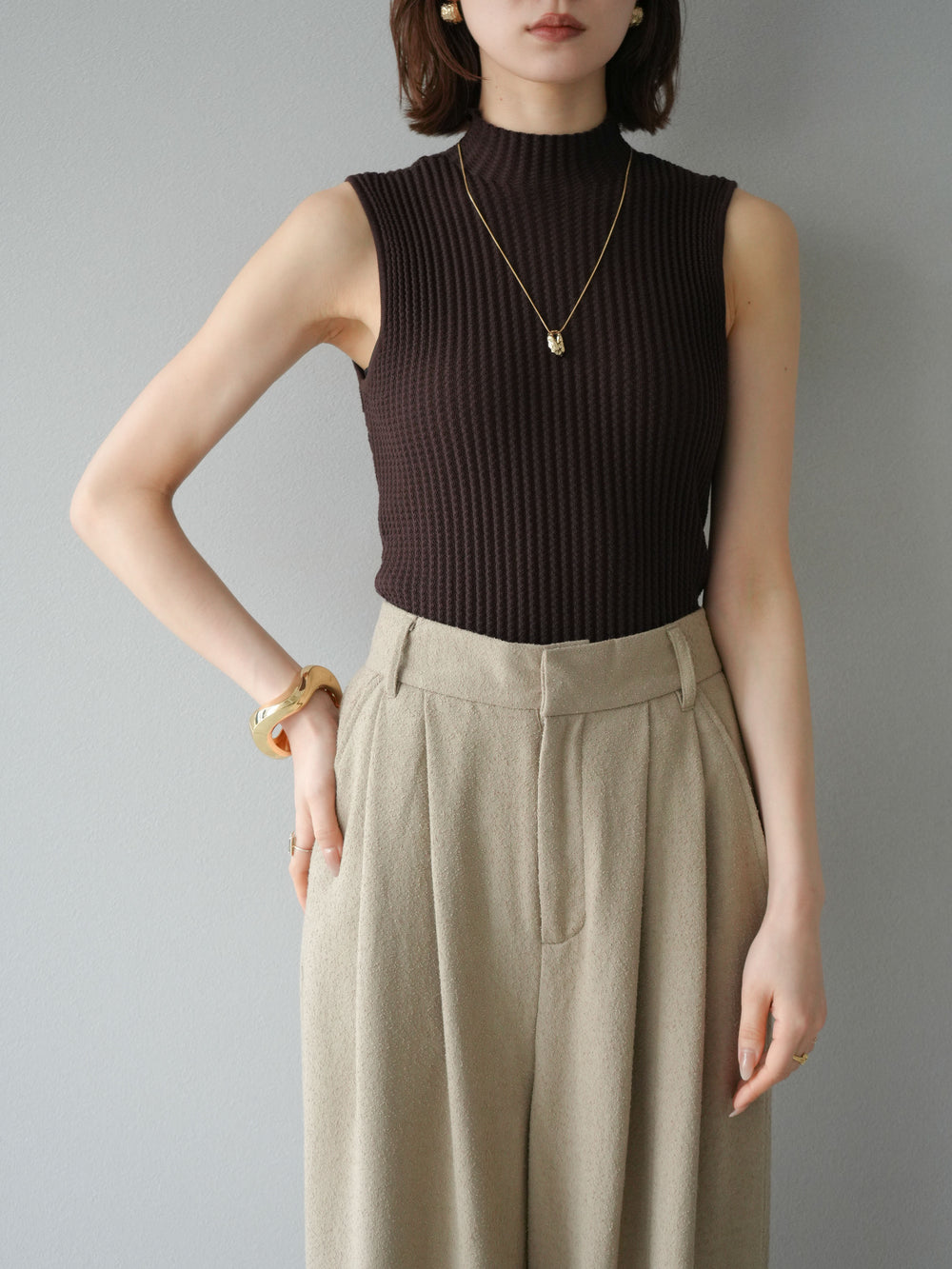 [予約]ボトルネックワッフル編みノースリーブニットトップス/ブラウン