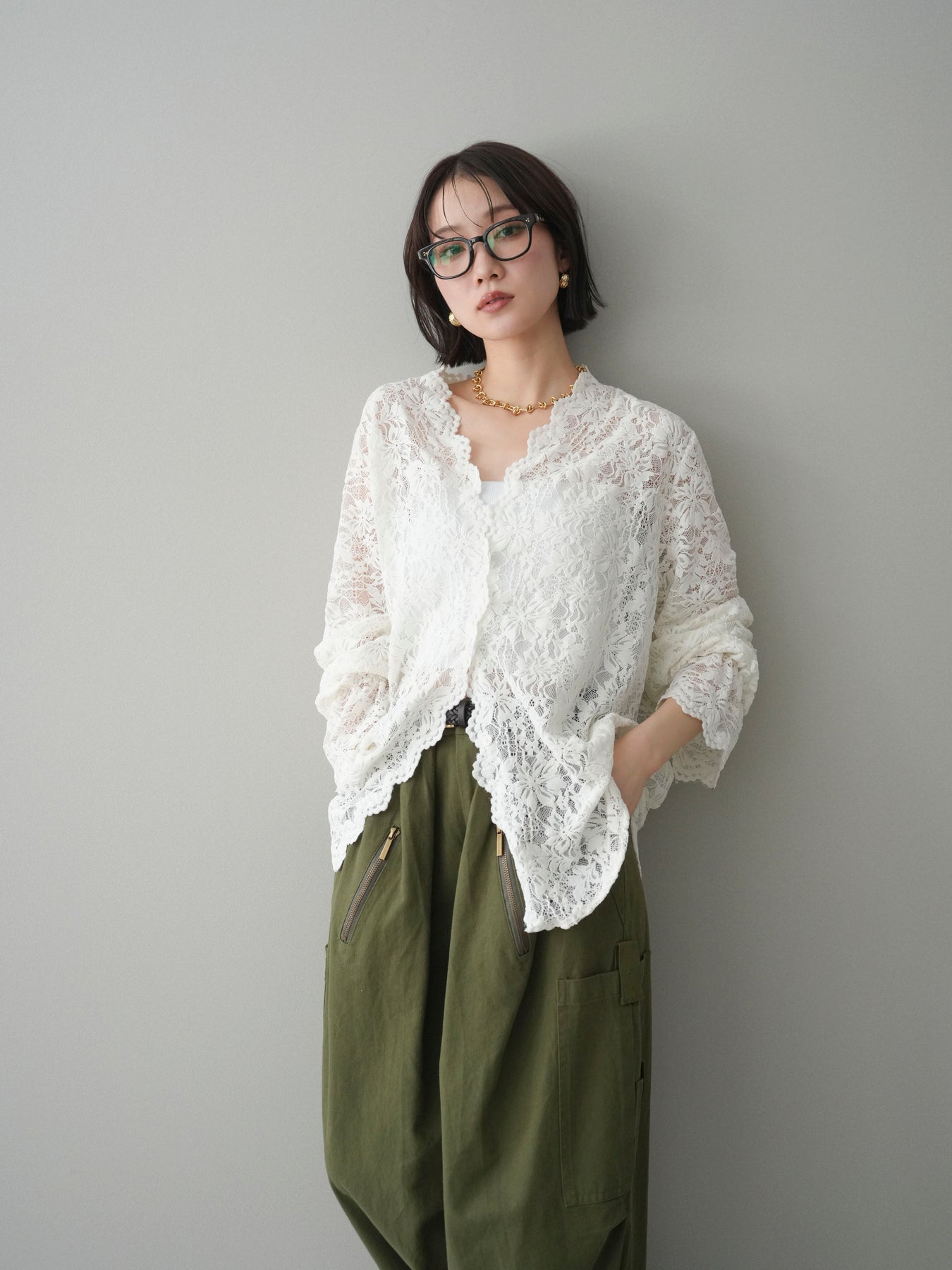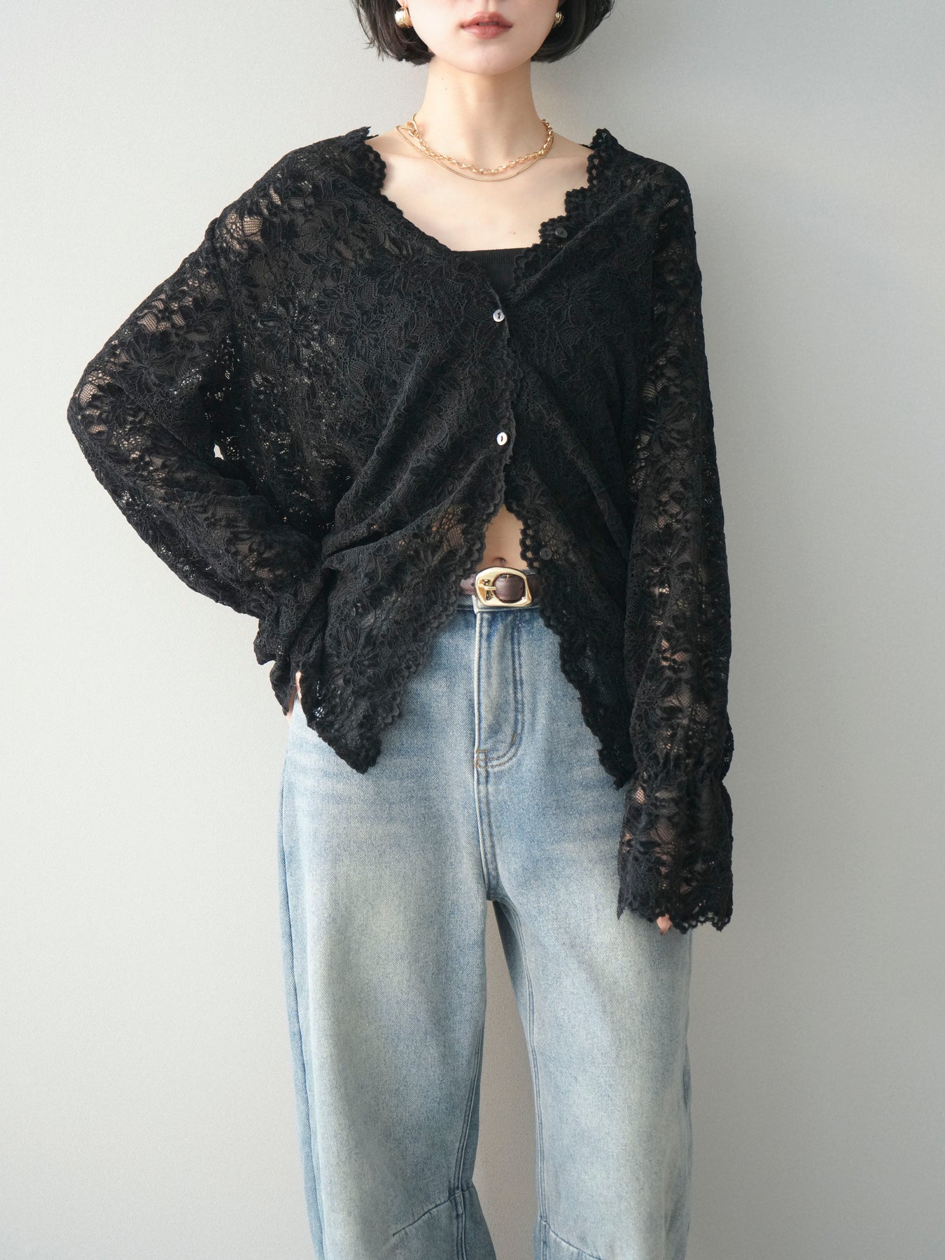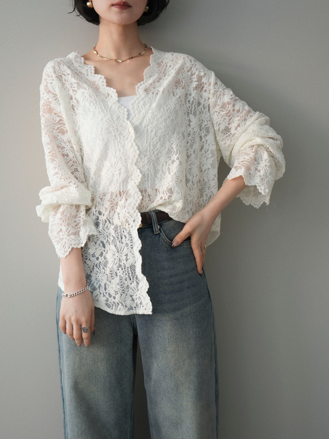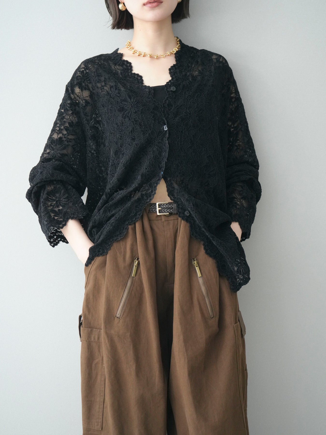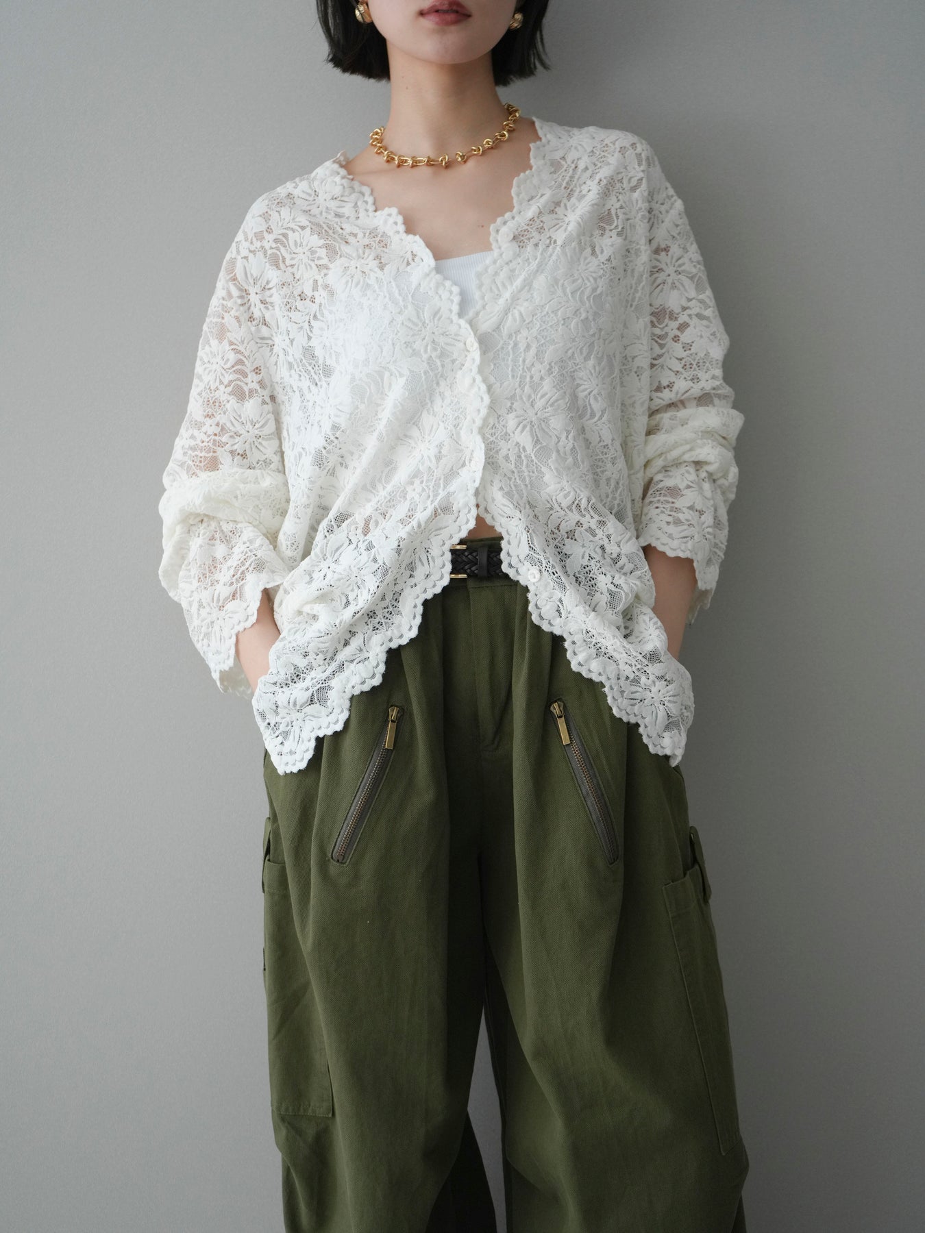 繊細な総レース素材が印象的なVネックカーディガン。程よく透け感のあるレースが、軽やかで女性らしい雰囲気を演出し、スタイリングに奥行きをプラスします。Vネックデザインが顔まわりをすっきりと見せ、前を閉じてトップスとしても、羽織りとしてもバランス良く着用可能。シンプルなインナーに重ねるだけで華やかさが引き立ち、デイリーからきれいめシーンまで幅広く活躍する一着です。 ※ボトムス、キャミソール(インナー)以外の商品は一律でインナーは付属していません。