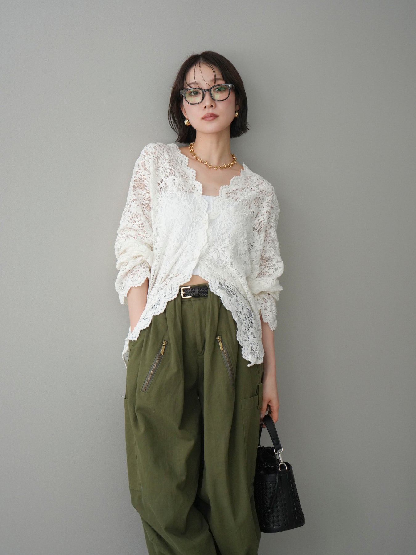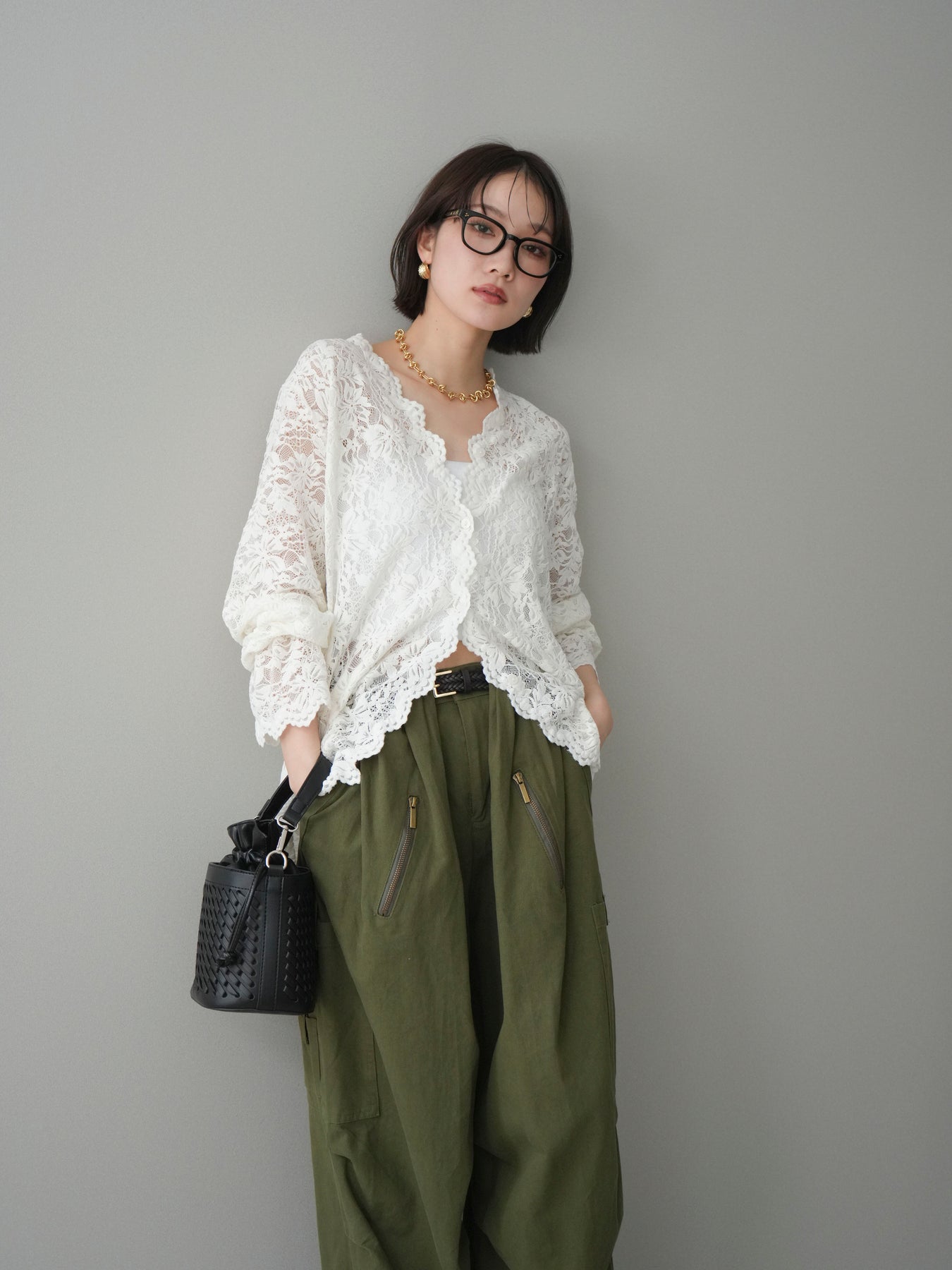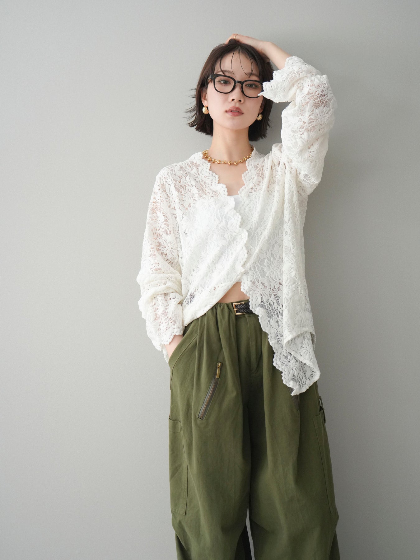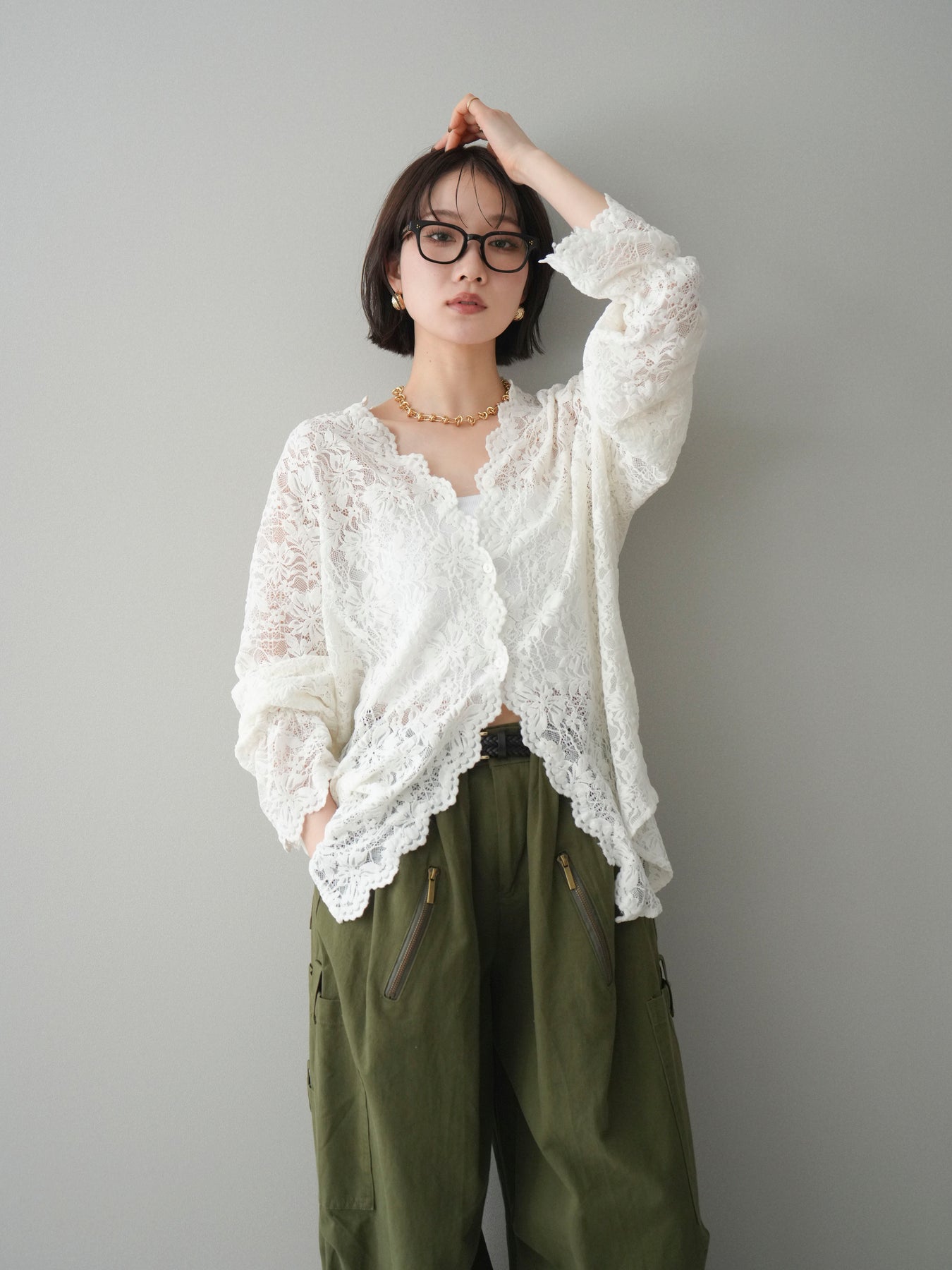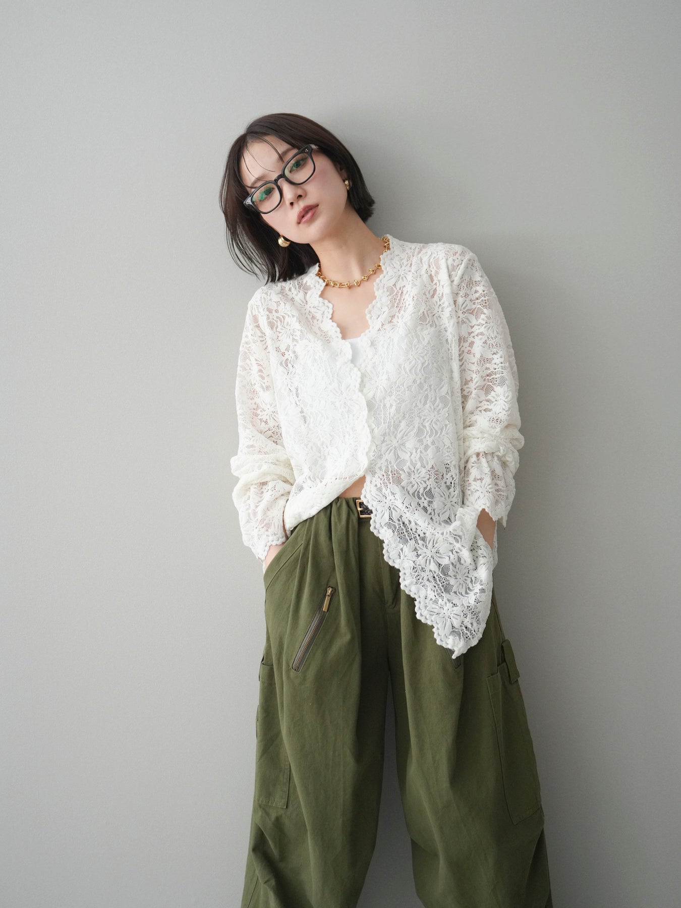 繊細な総レース素材が印象的なVネックカーディガン。程よく透け感のあるレースが、軽やかで女性らしい雰囲気を演出し、スタイリングに奥行きをプラスします。Vネックデザインが顔まわりをすっきりと見せ、前を閉じてトップスとしても、羽織りとしてもバランス良く着用可能。シンプルなインナーに重ねるだけで華やかさが引き立ち、デイリーからきれいめシーンまで幅広く活躍する一着です。 ※ボトムス、キャミソール(インナー)以外の商品は一律でインナーは付属していません。
