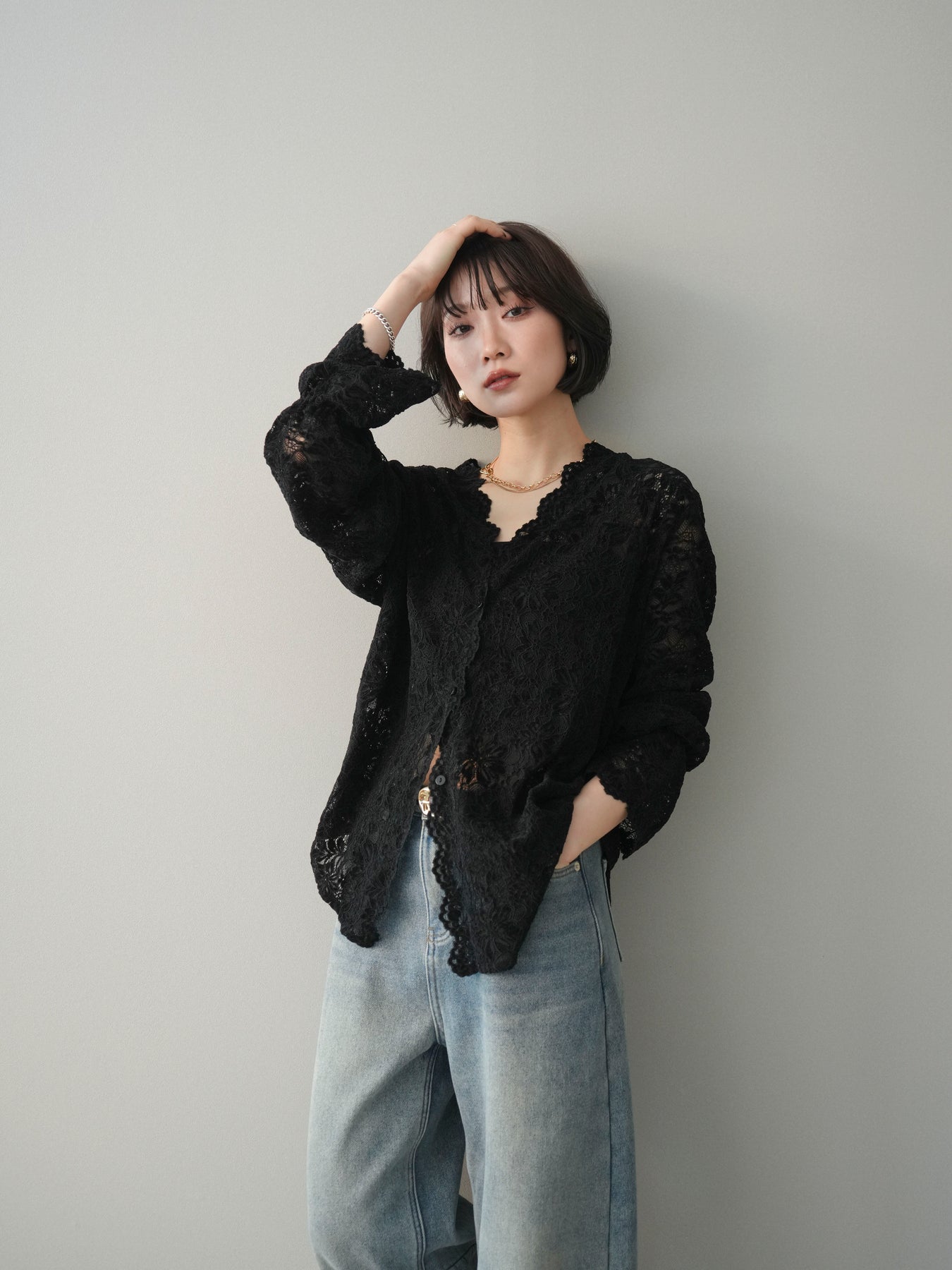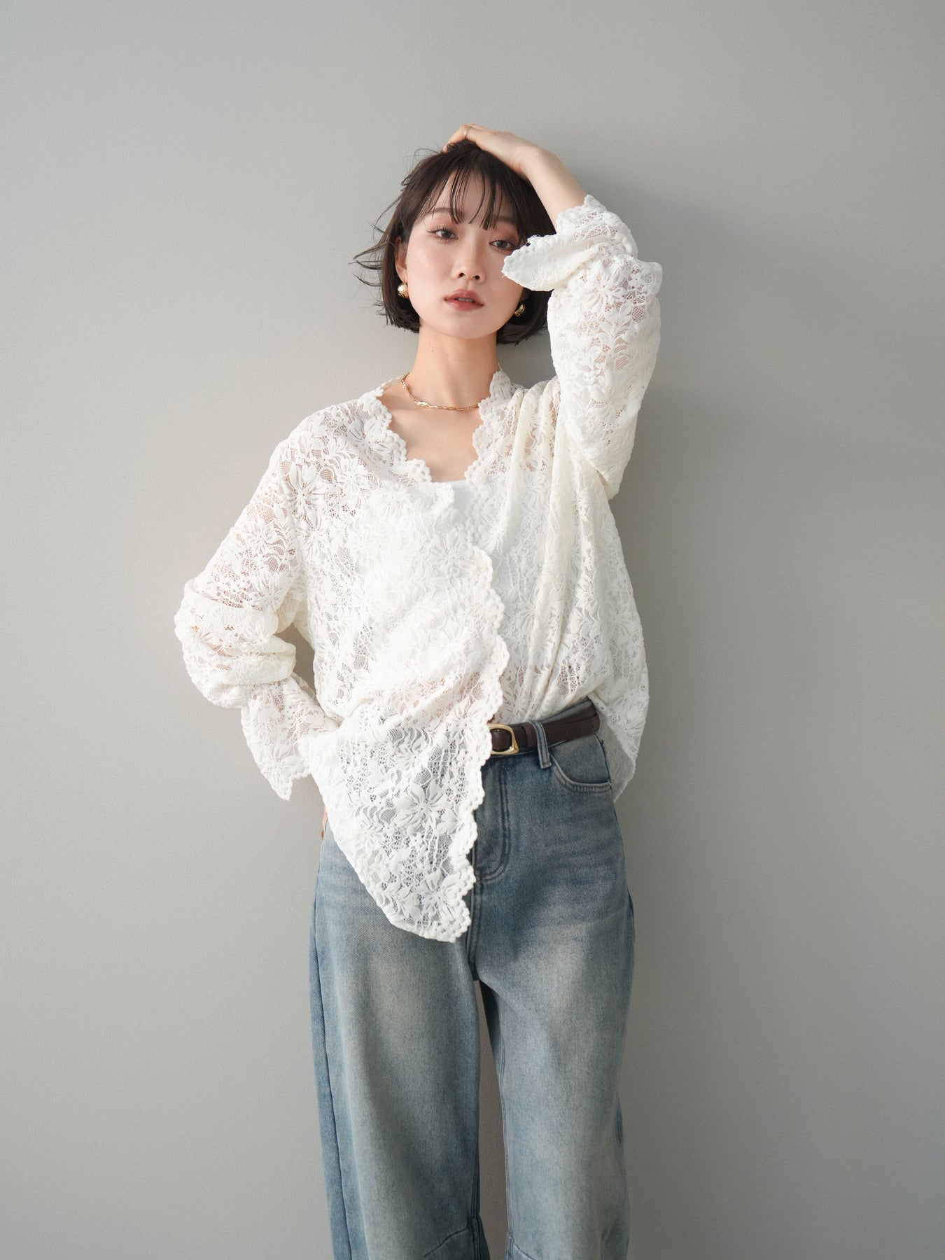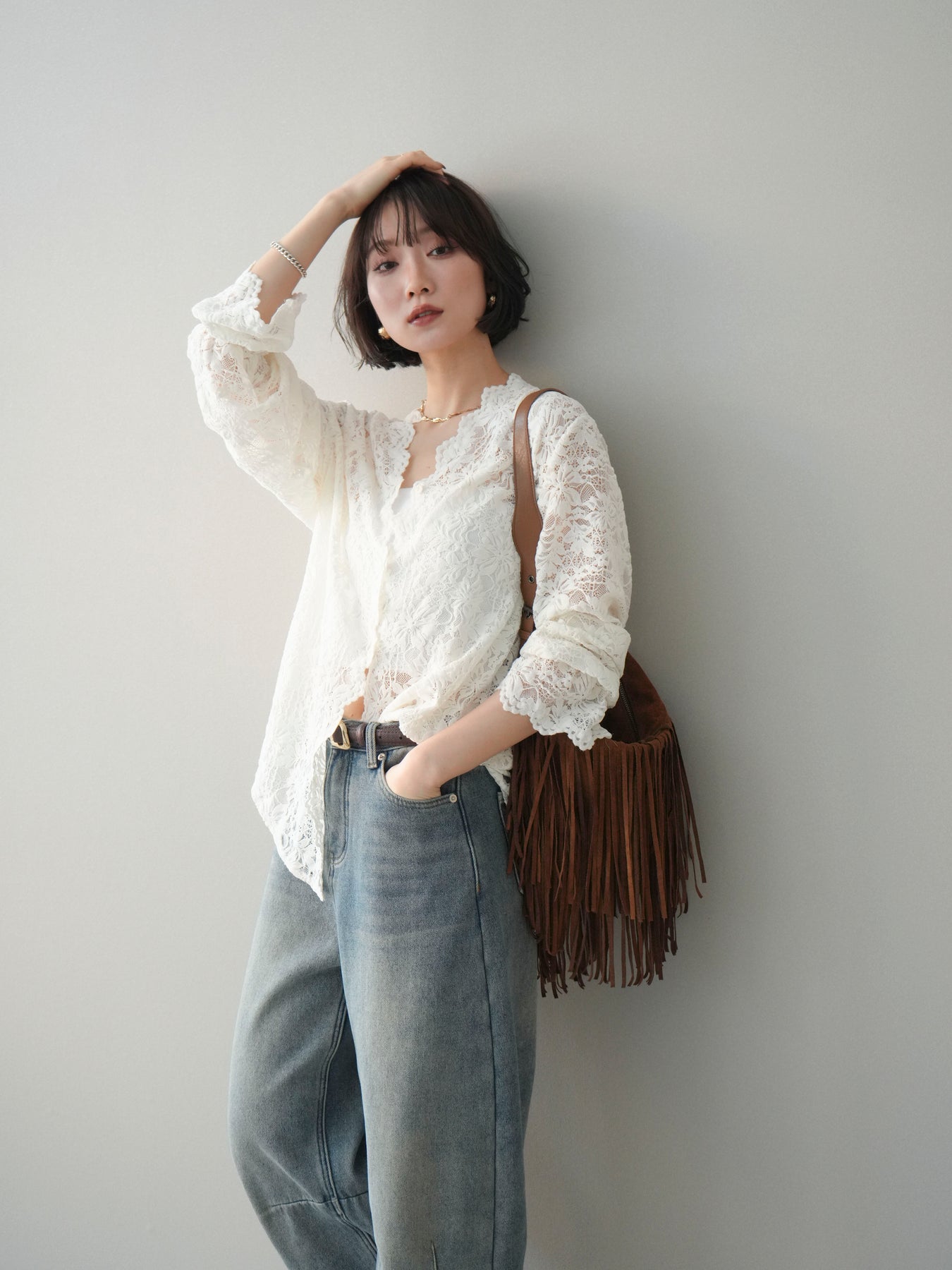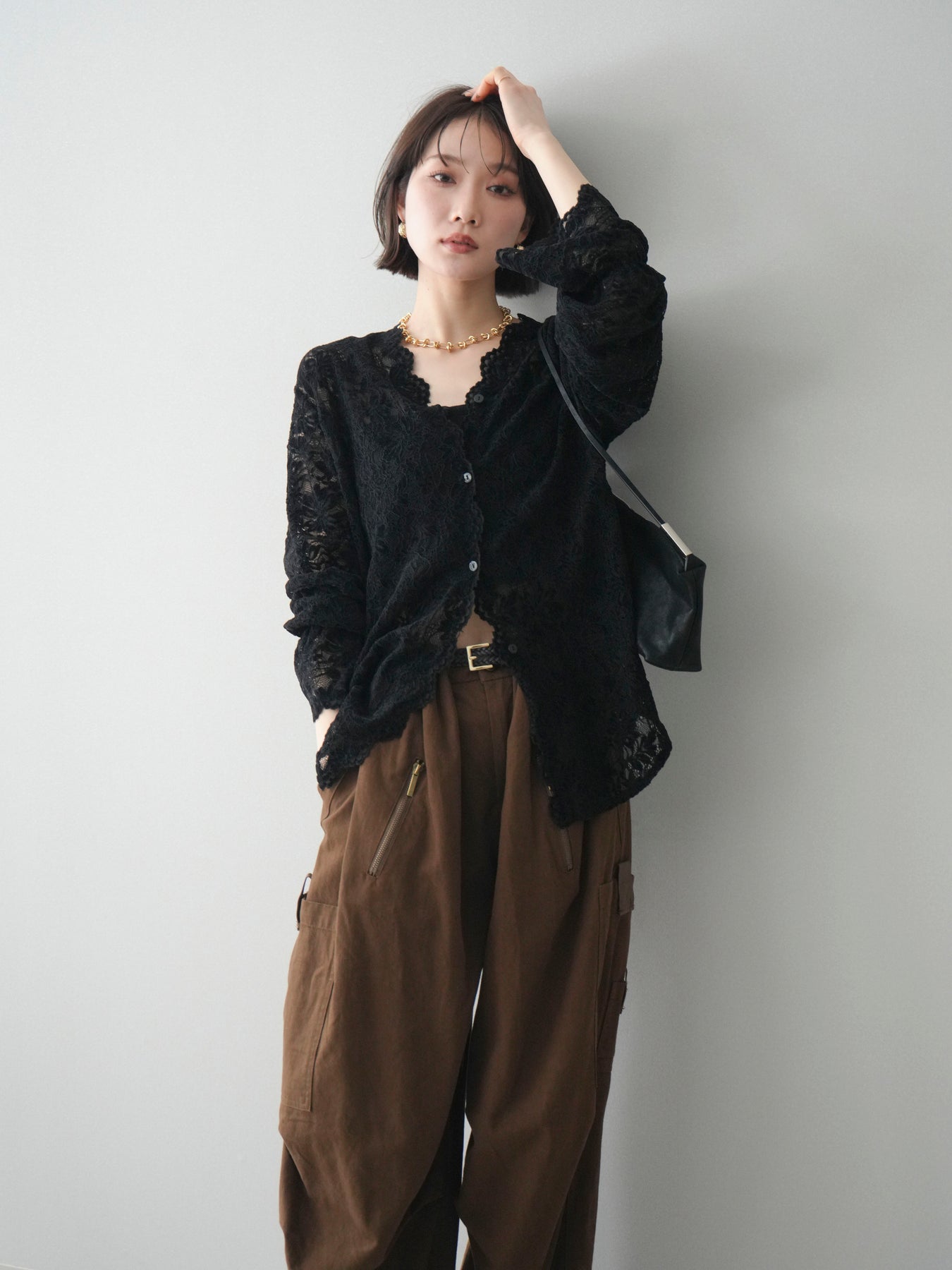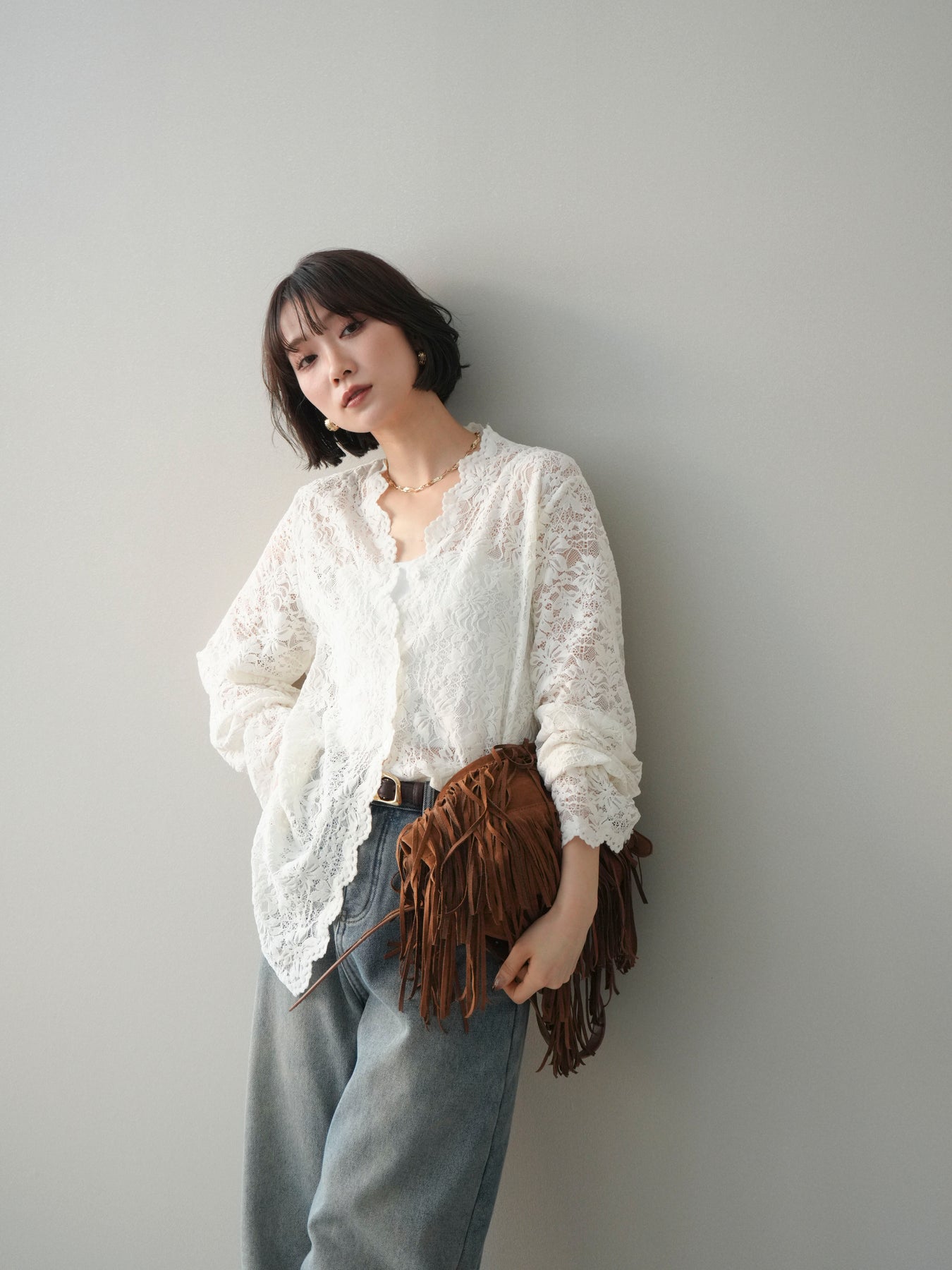 繊細な総レース素材が印象的なVネックカーディガン。程よく透け感のあるレースが、軽やかで女性らしい雰囲気を演出し、スタイリングに奥行きをプラスします。Vネックデザインが顔まわりをすっきりと見せ、前を閉じてトップスとしても、羽織りとしてもバランス良く着用可能。シンプルなインナーに重ねるだけで華やかさが引き立ち、デイリーからきれいめシーンまで幅広く活躍する一着です。 ※ボトムス、キャミソール(インナー)以外の商品は一律でインナーは付属していません。