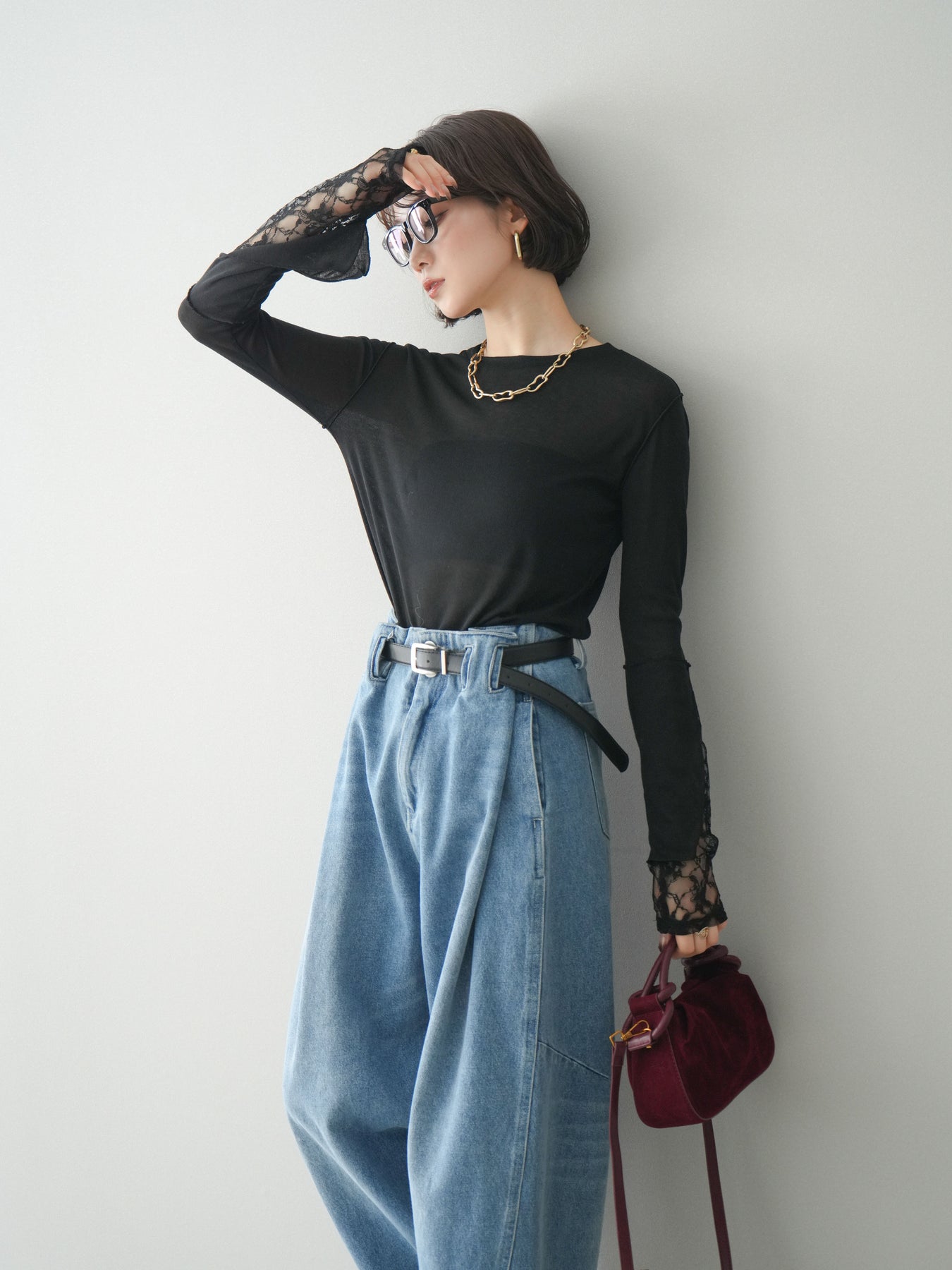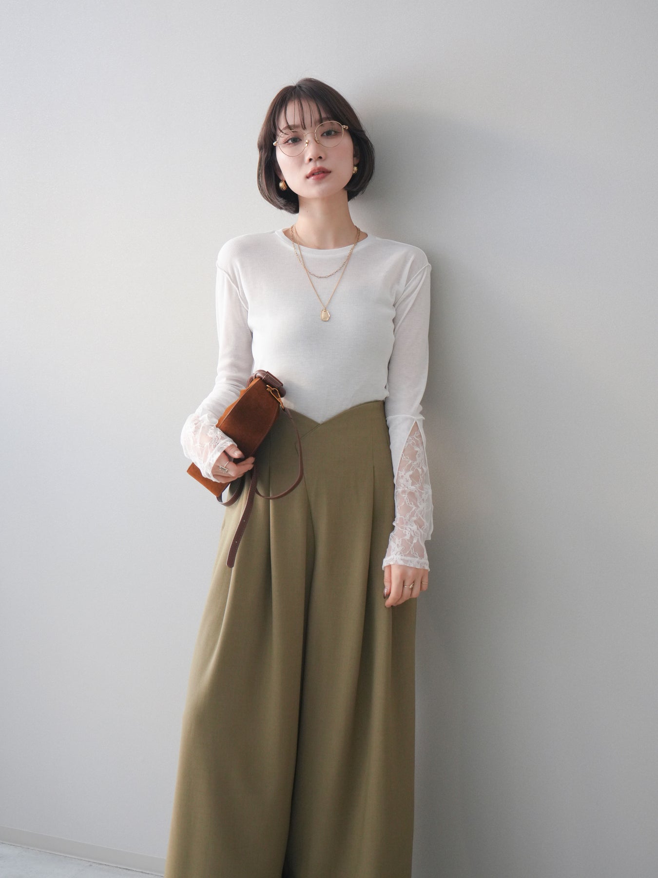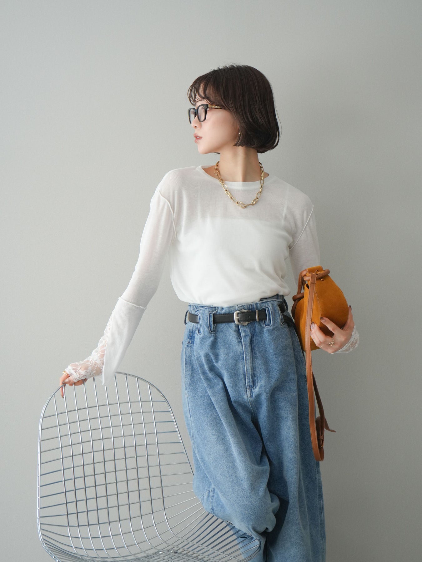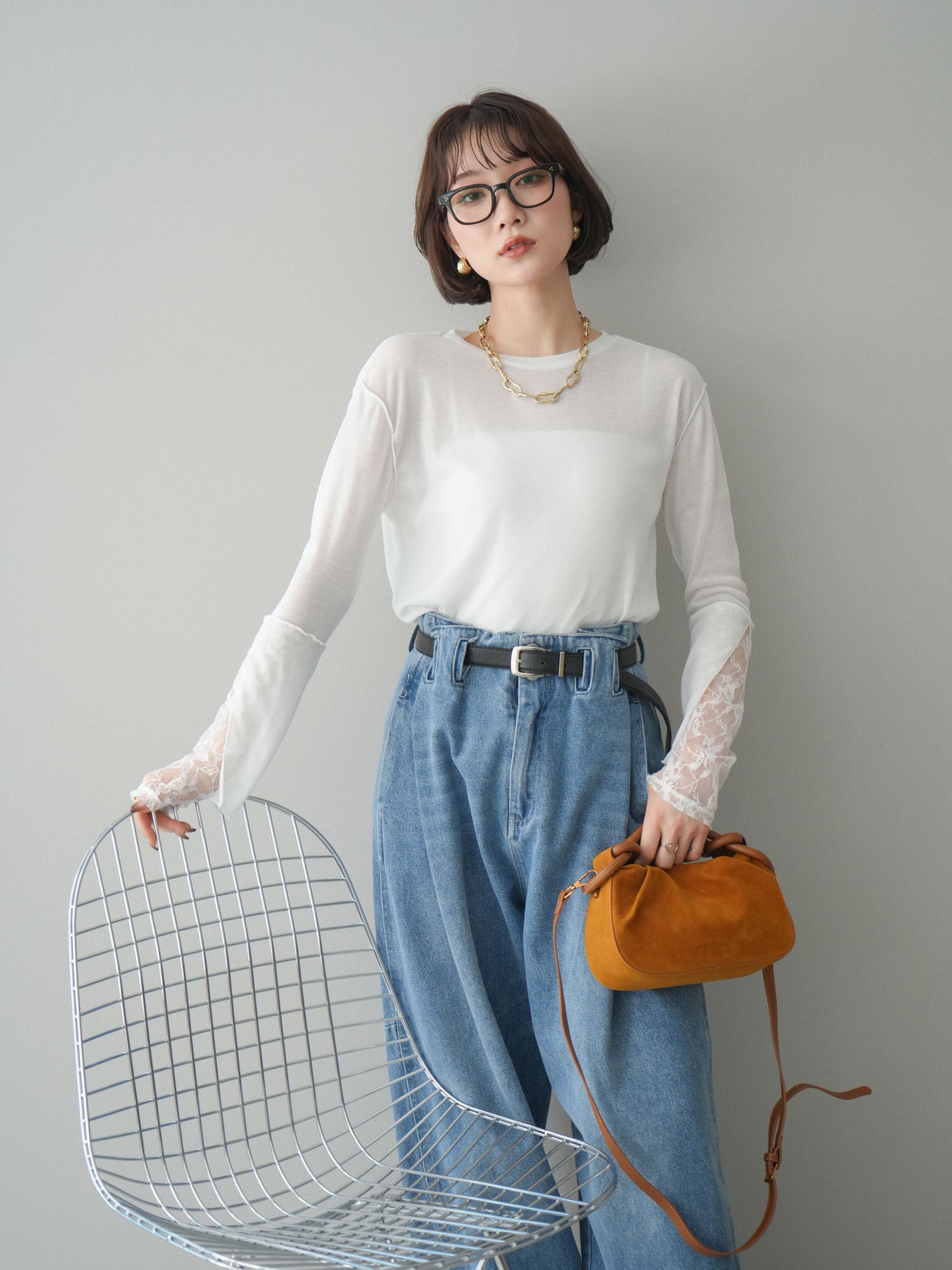 袖口にレースをレイヤードしたデザインが印象的なメロートップス。シンプルな身頃に、異素材を重ねた袖デザインがさりげない華やかさと奥行きをプラスします。程よく透け感のある素材で、軽やかな着心地も魅力。メローディテールが全体を柔らかな印象にまとめ、1枚ではもちろん、ベストやジャケットのインナーとしても着映えする一着です。デイリーからきれいめスタイルまで幅広く活躍します。 ※ボトムス、キャミソール(インナー)以外の商品は一律でインナーは付属していません。