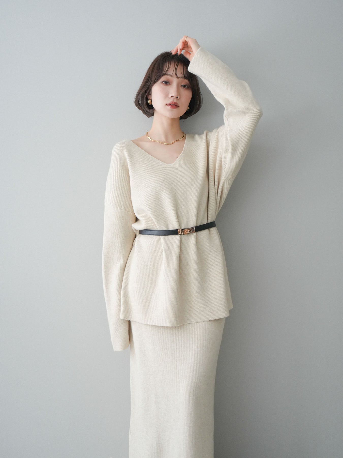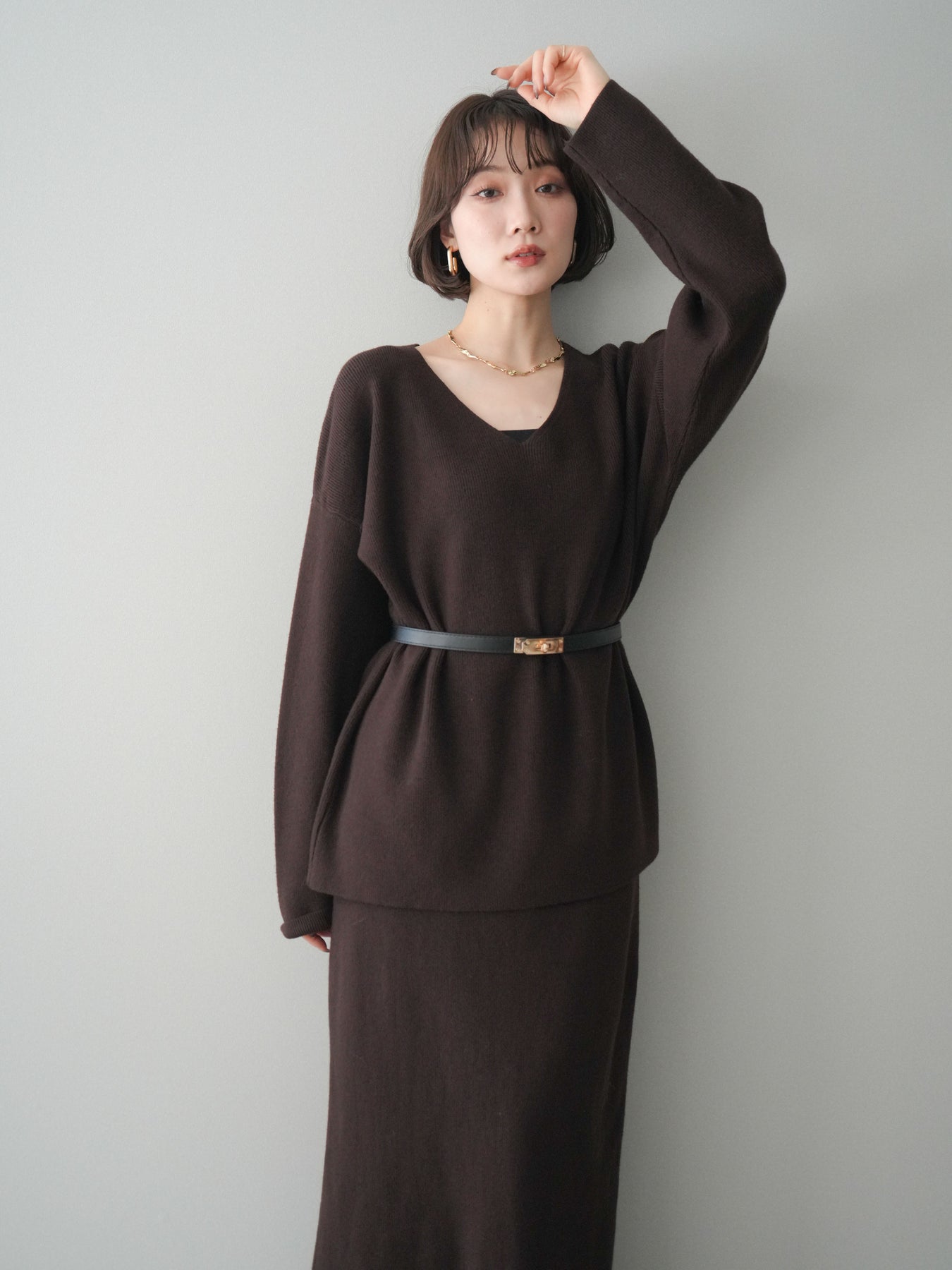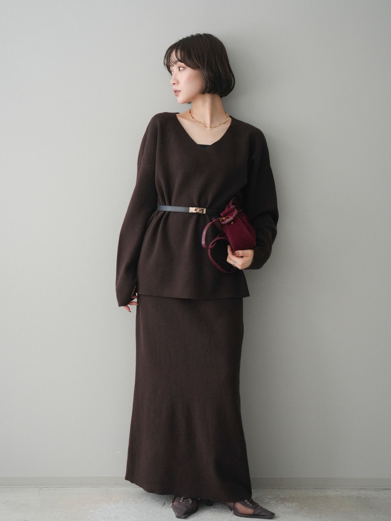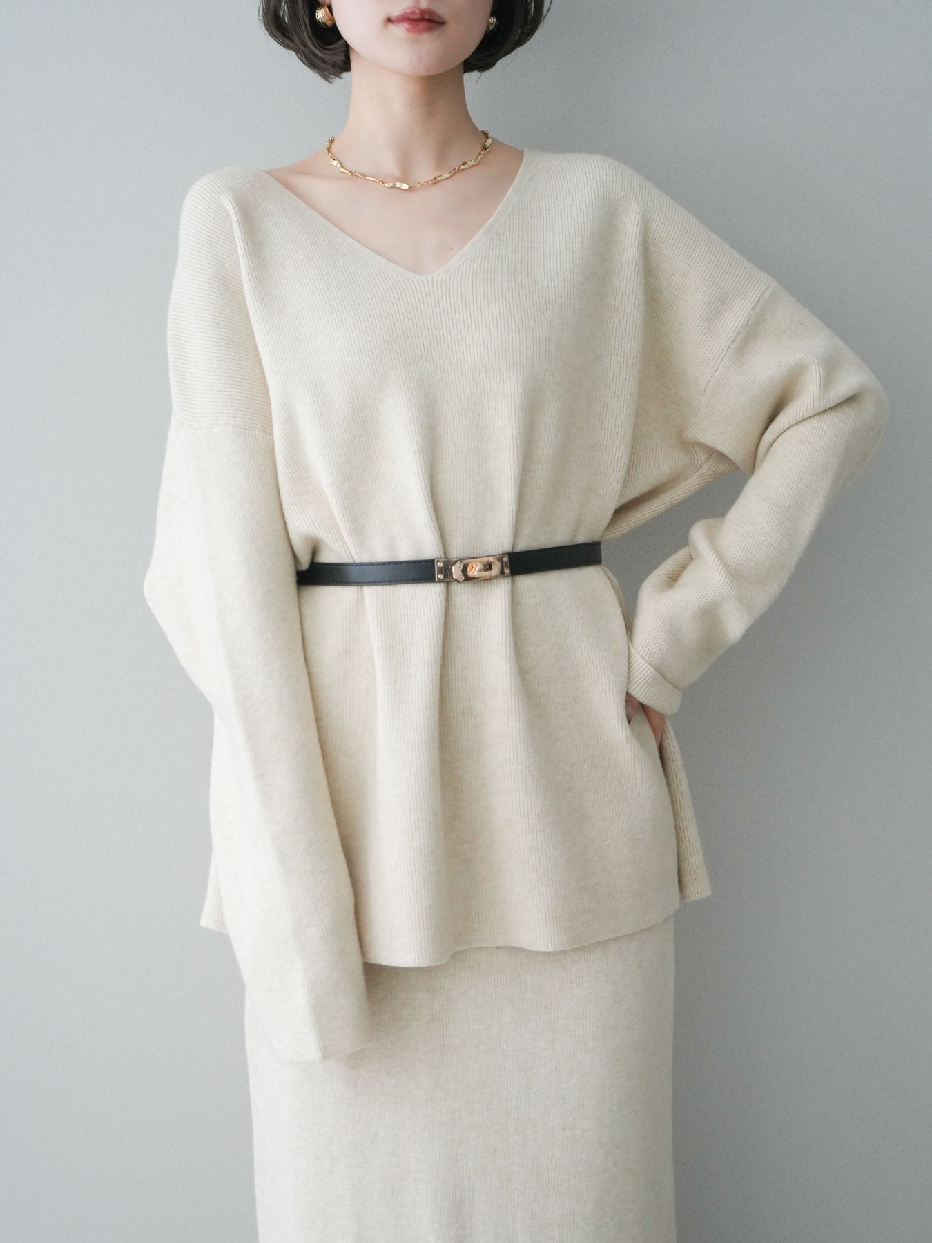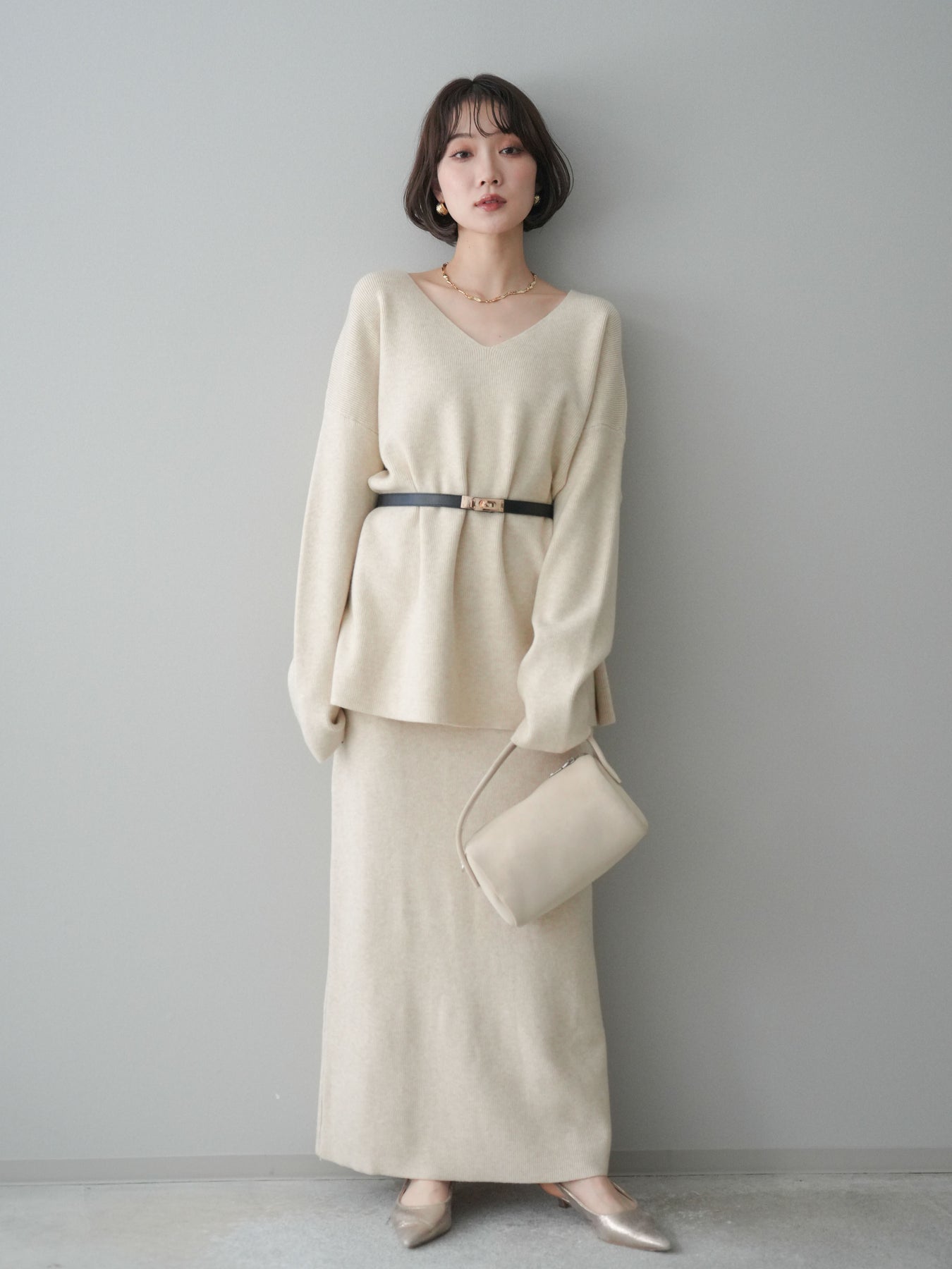 [SET]ベルト付Vネックニット&スカートSET UP+選べるアクセセット(2set)