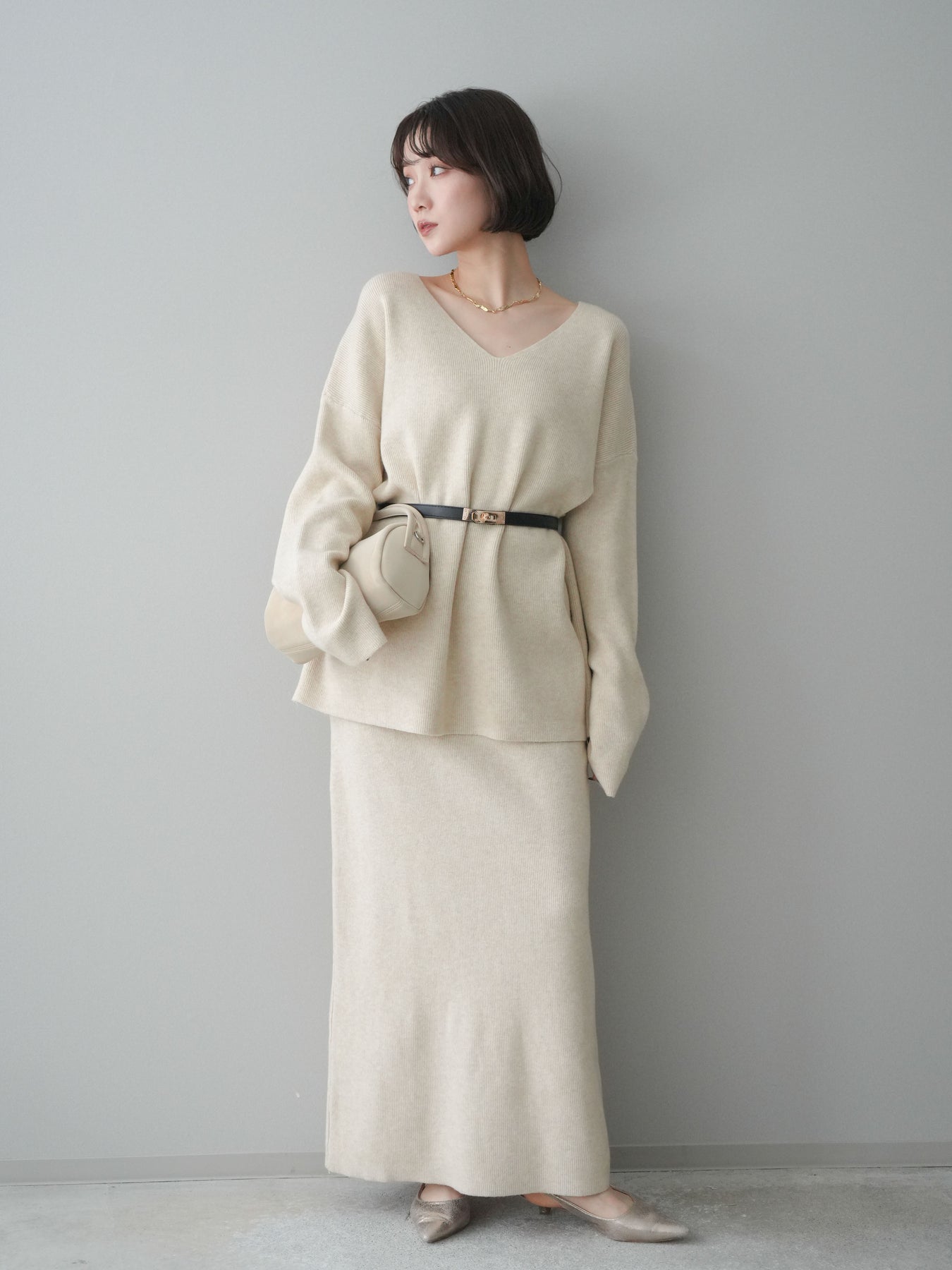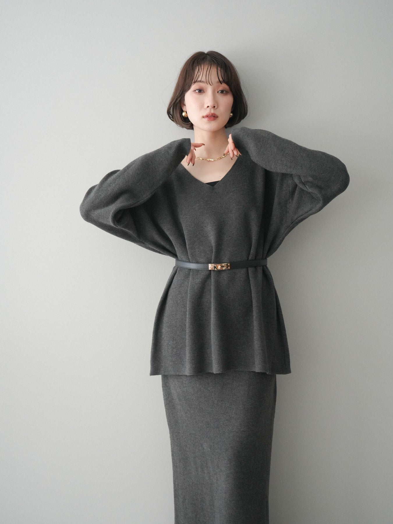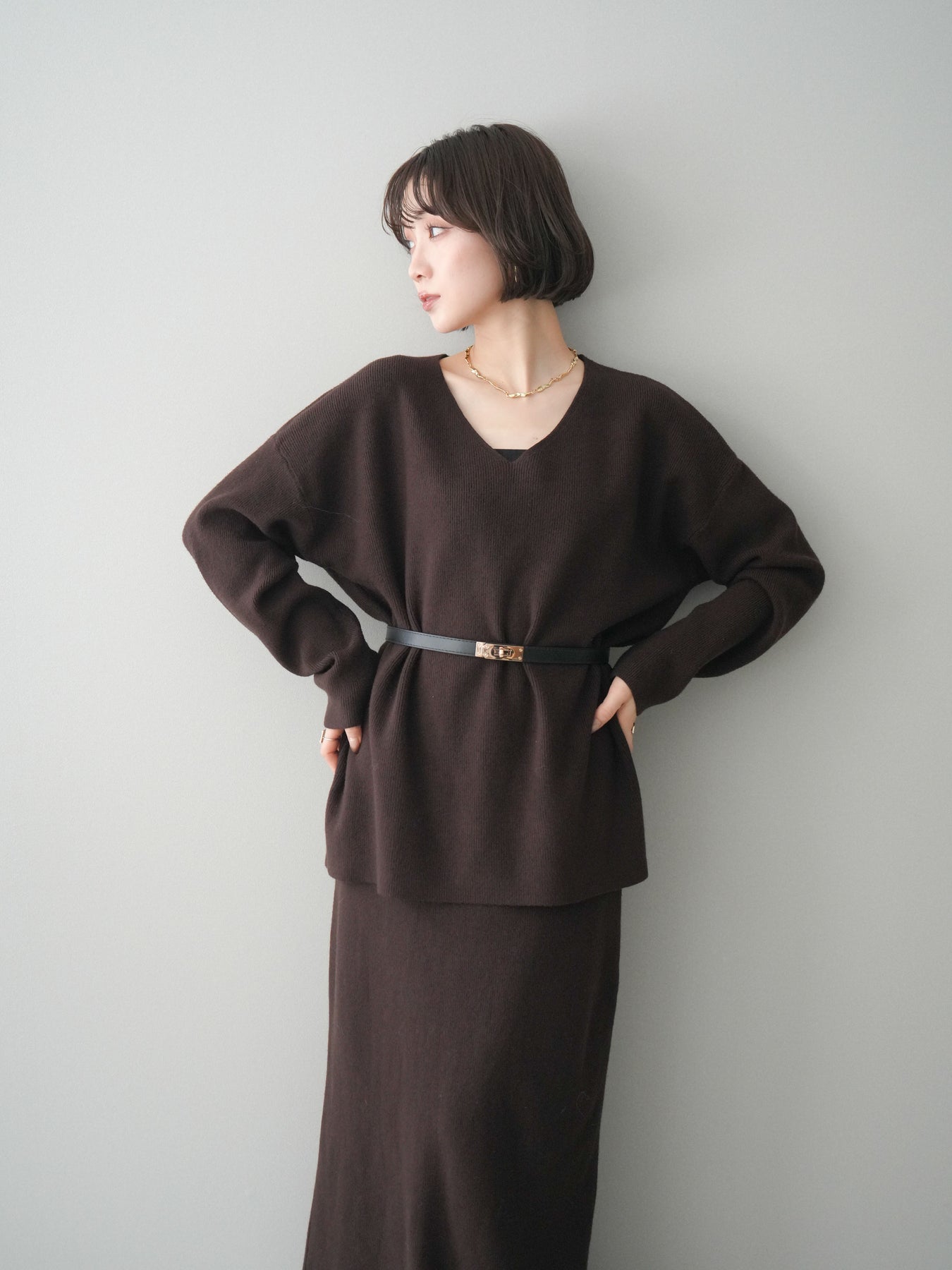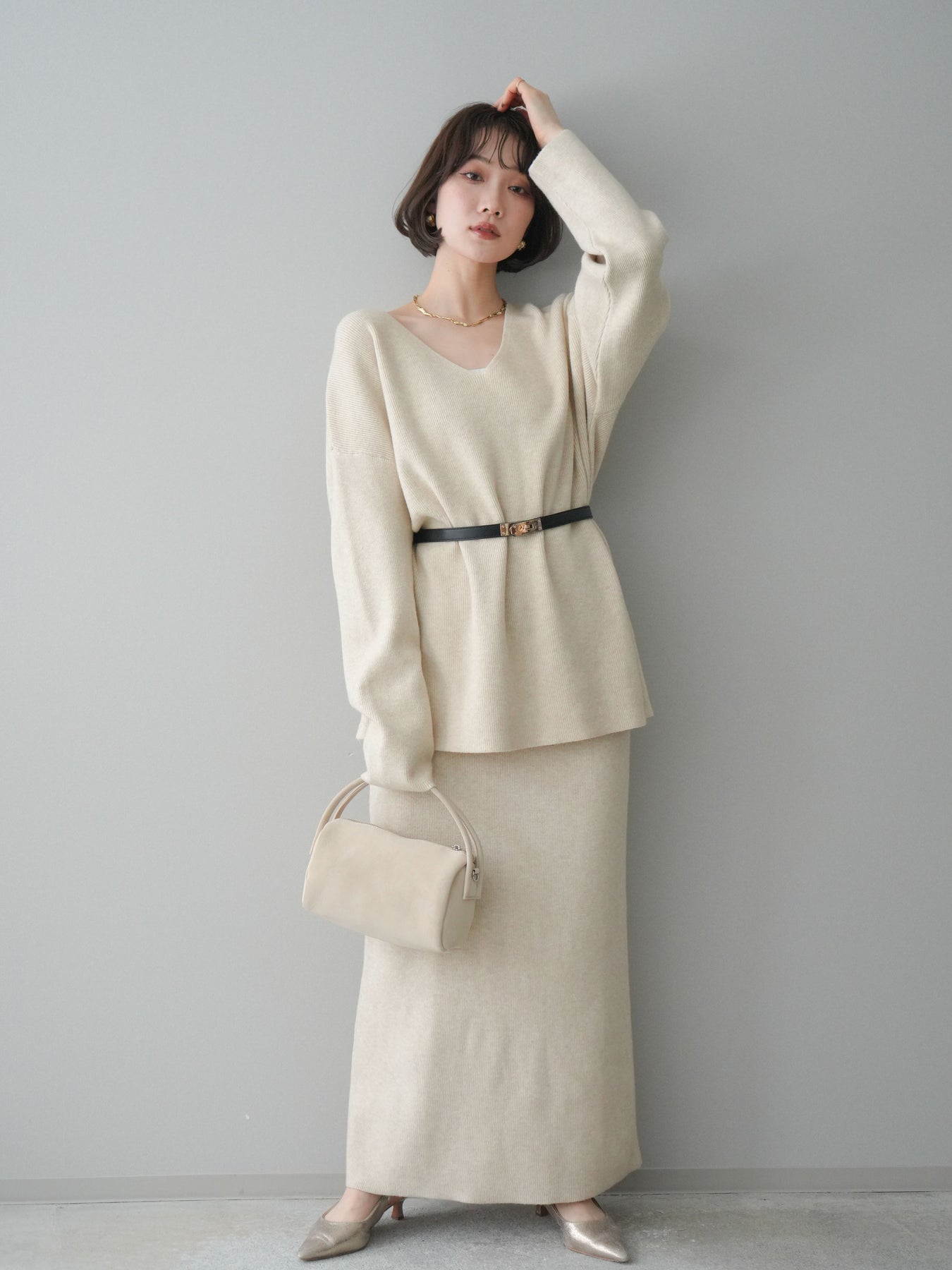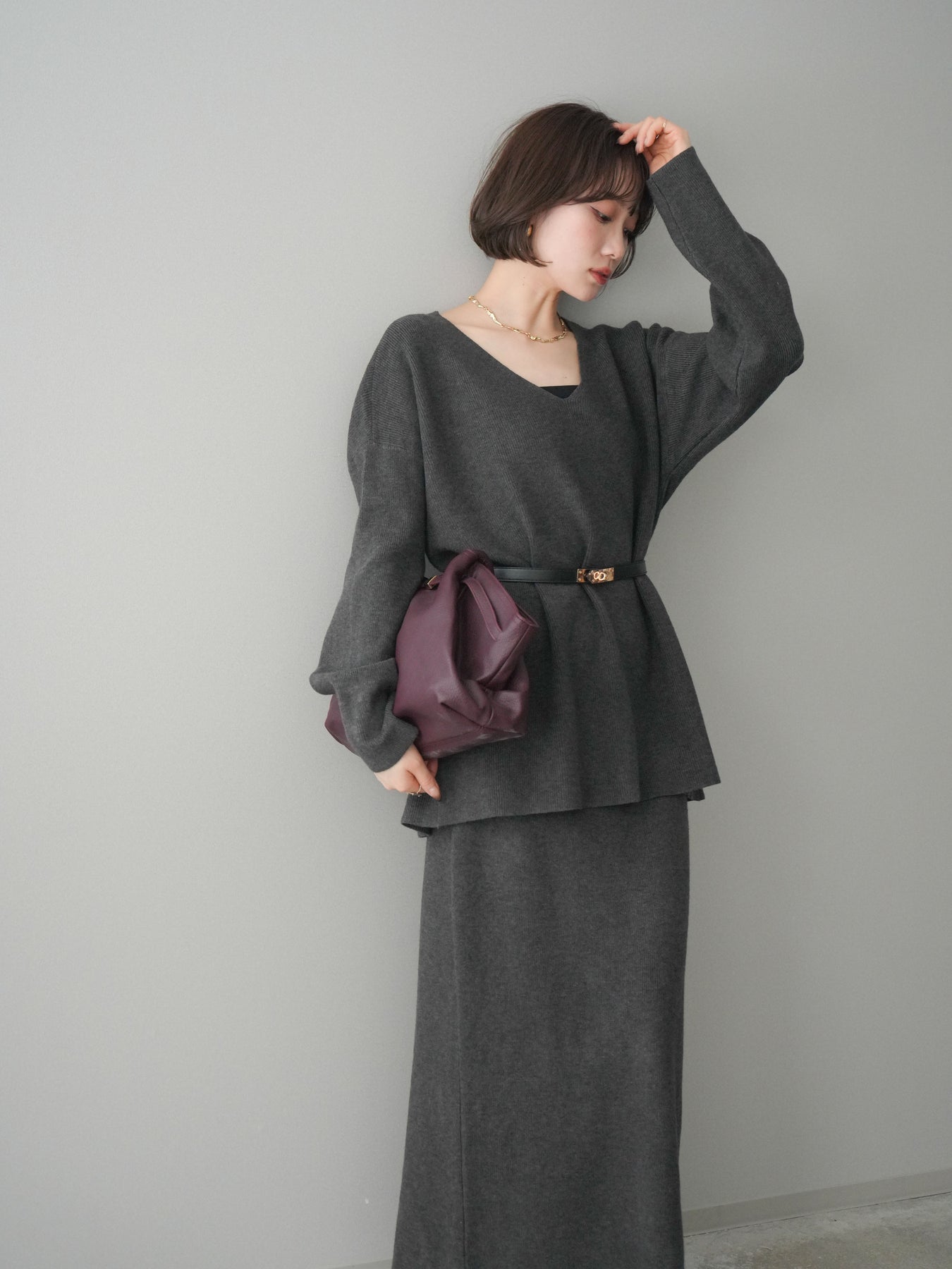 [SET]ベルト付Vネックニット&スカートSET UP+選べるアクセセット(2set)