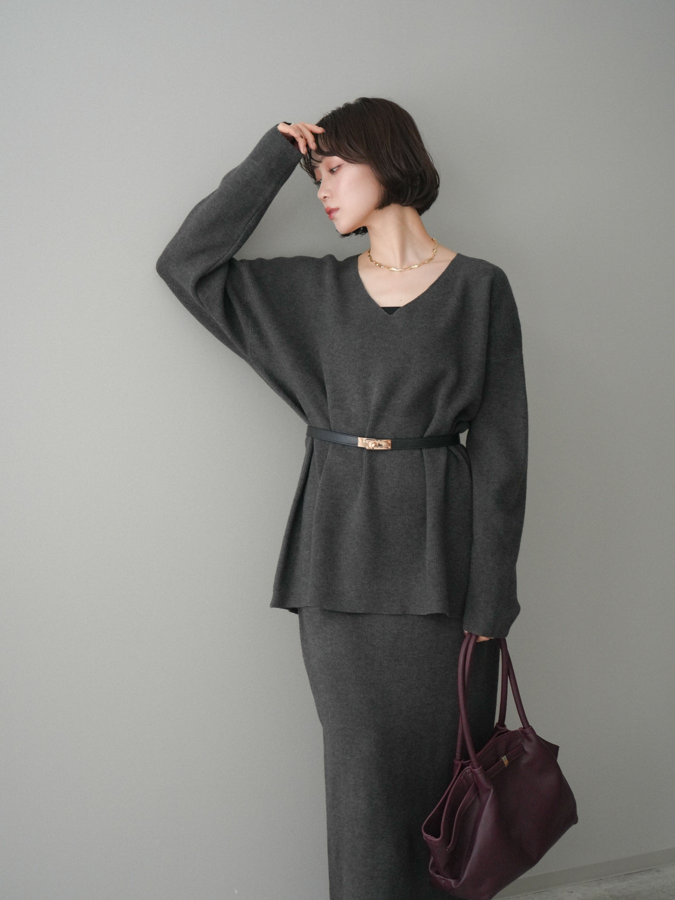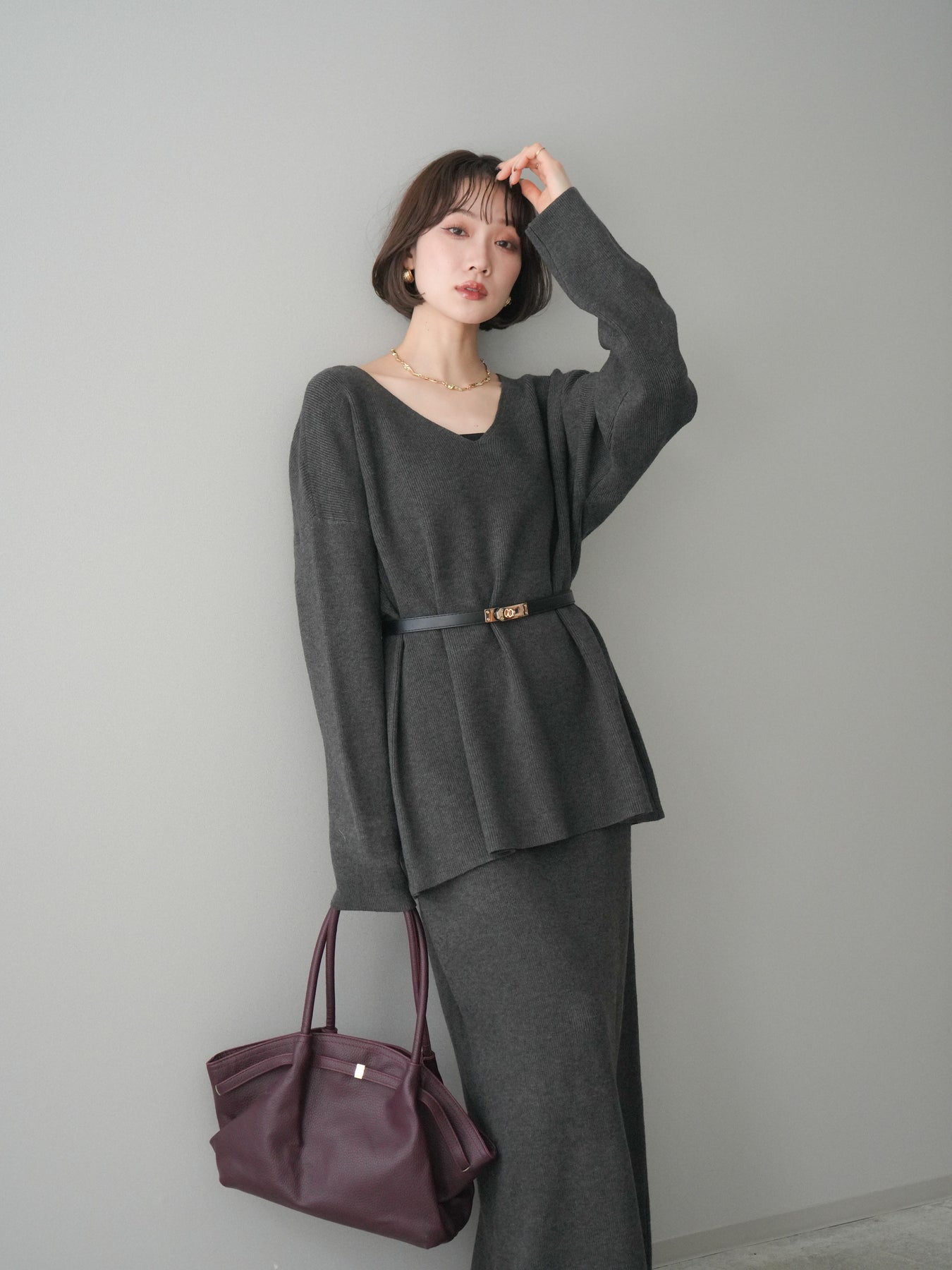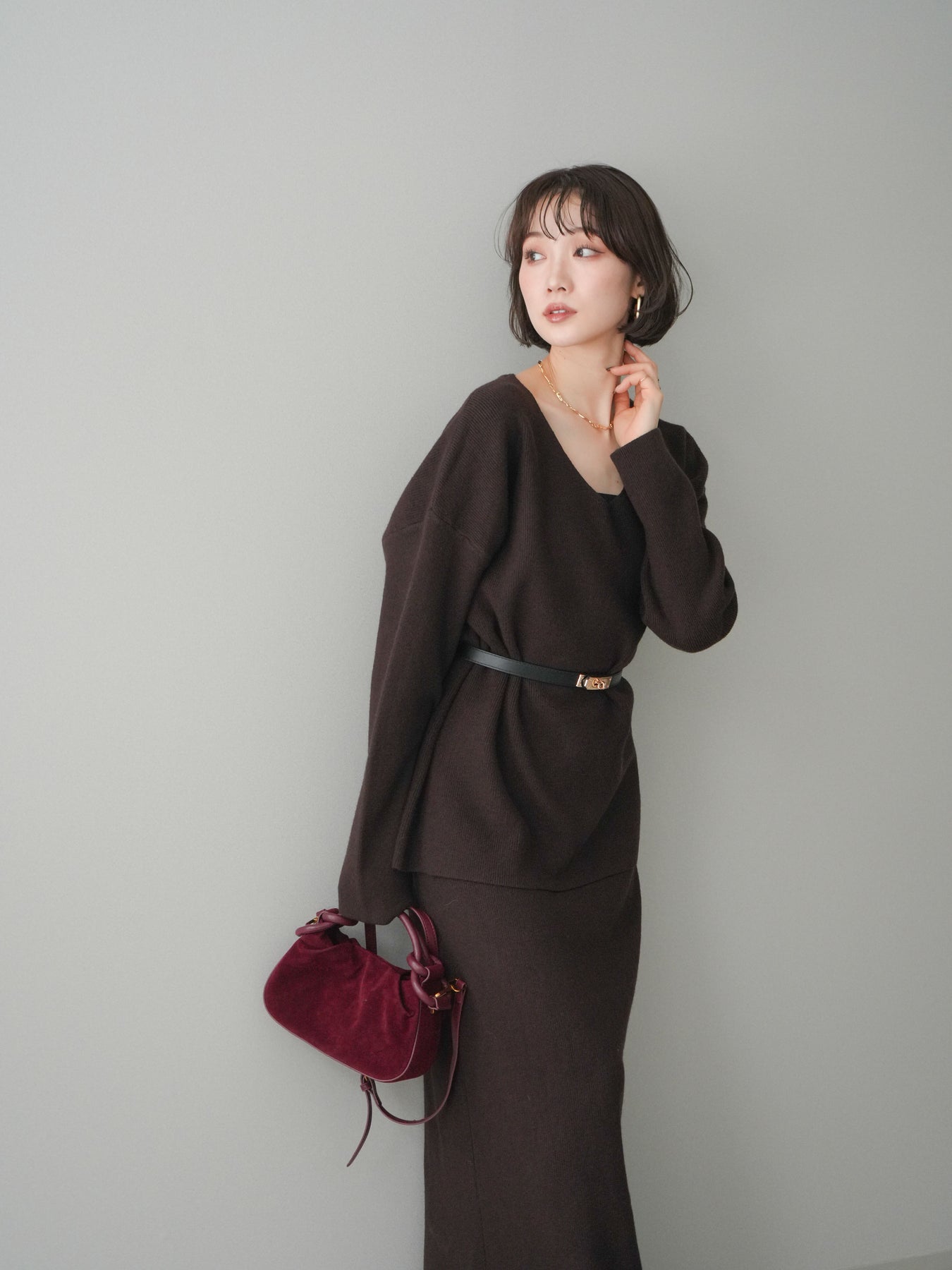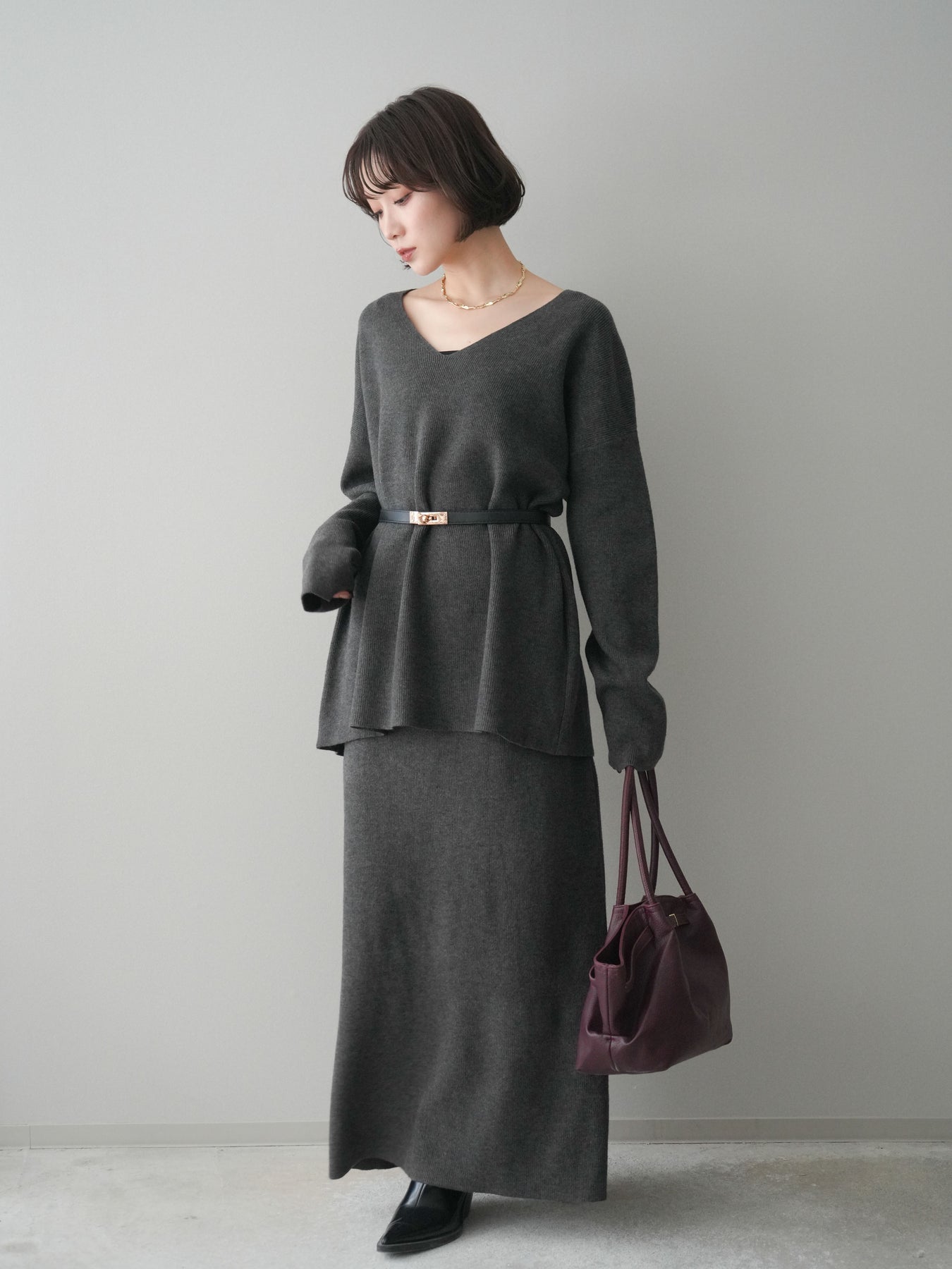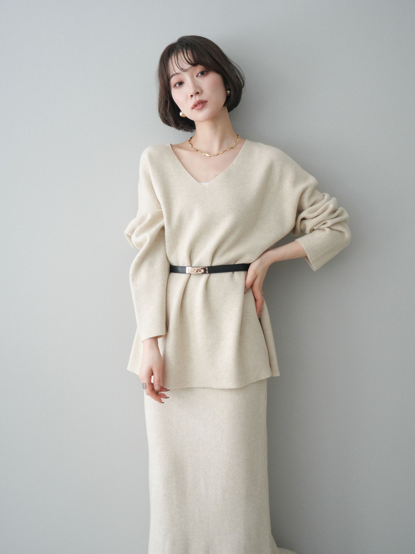 [SET]ベルト付Vネックニット&スカートSET UP+選べるアクセセット(2set)