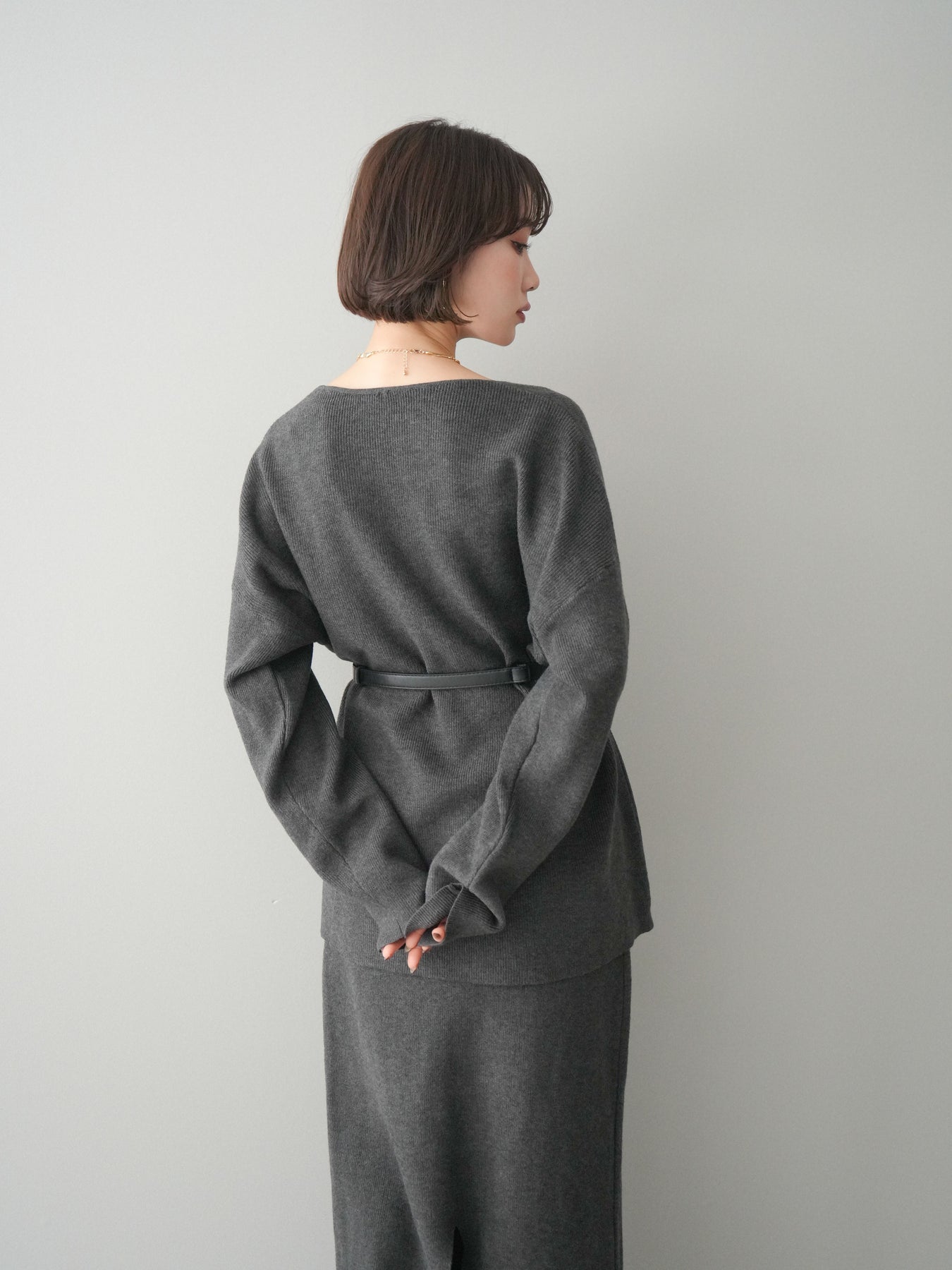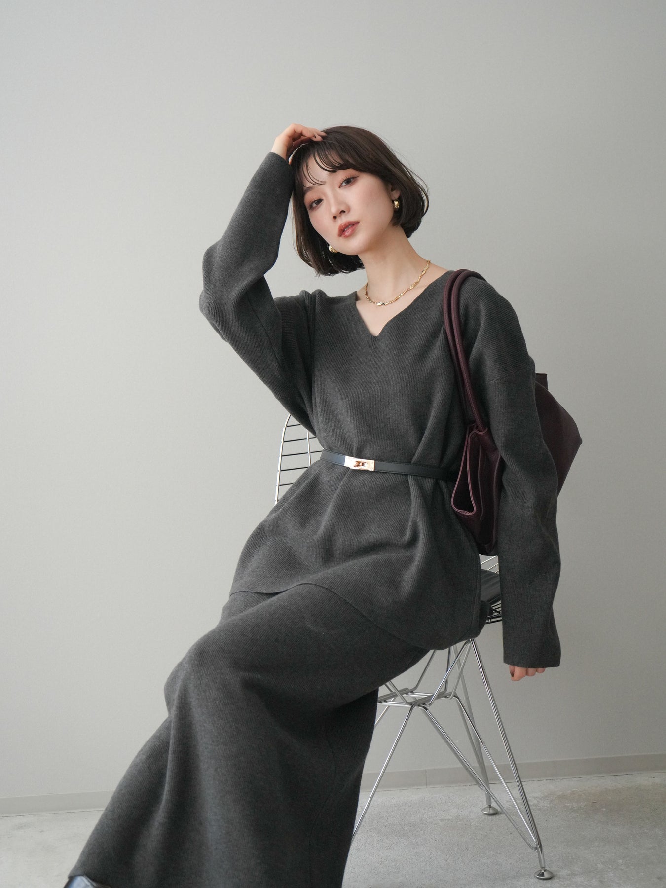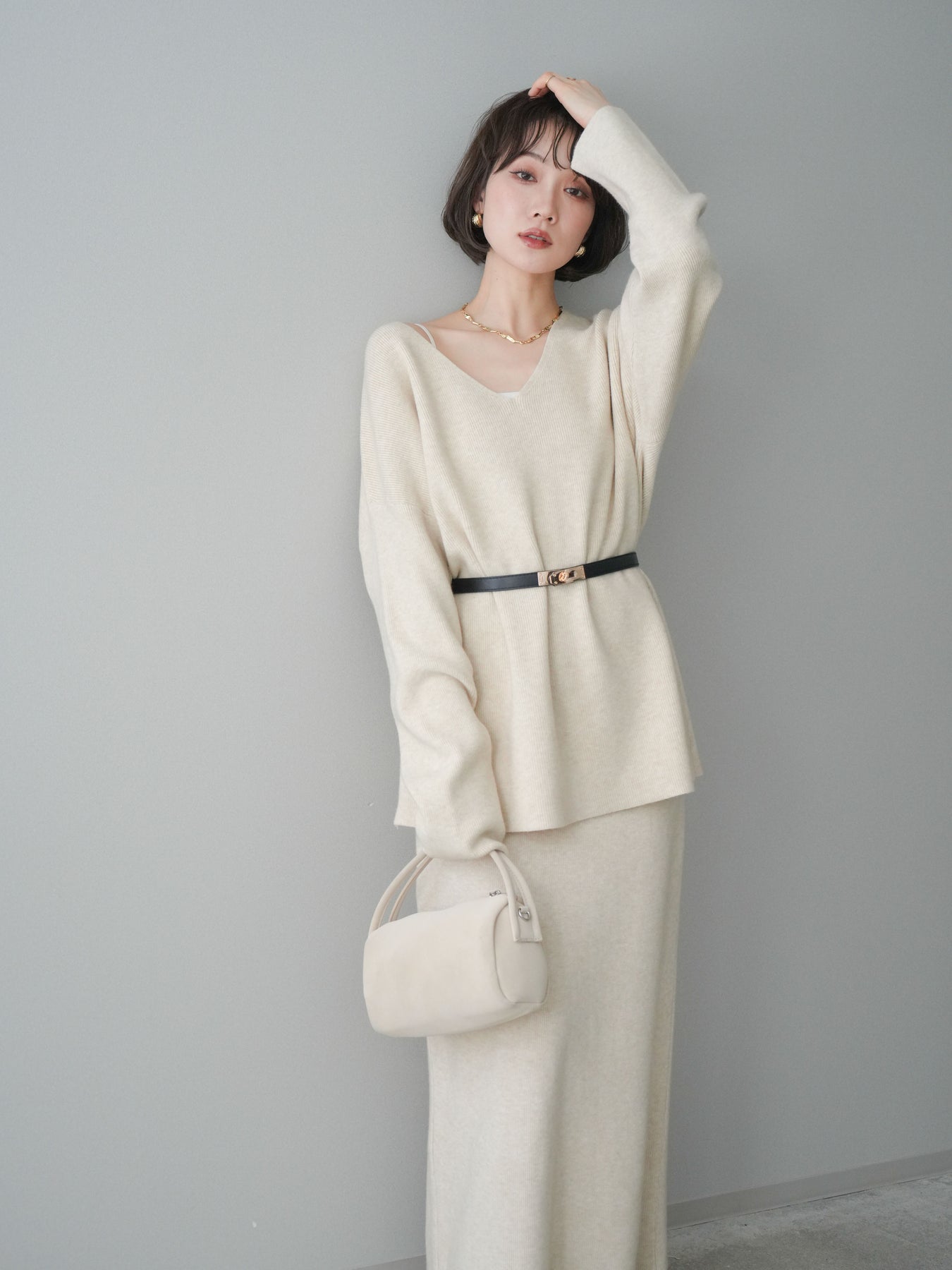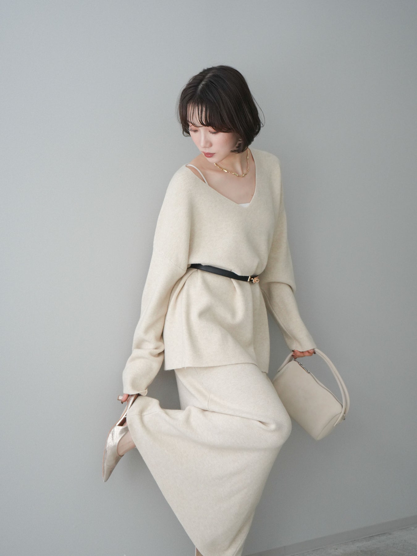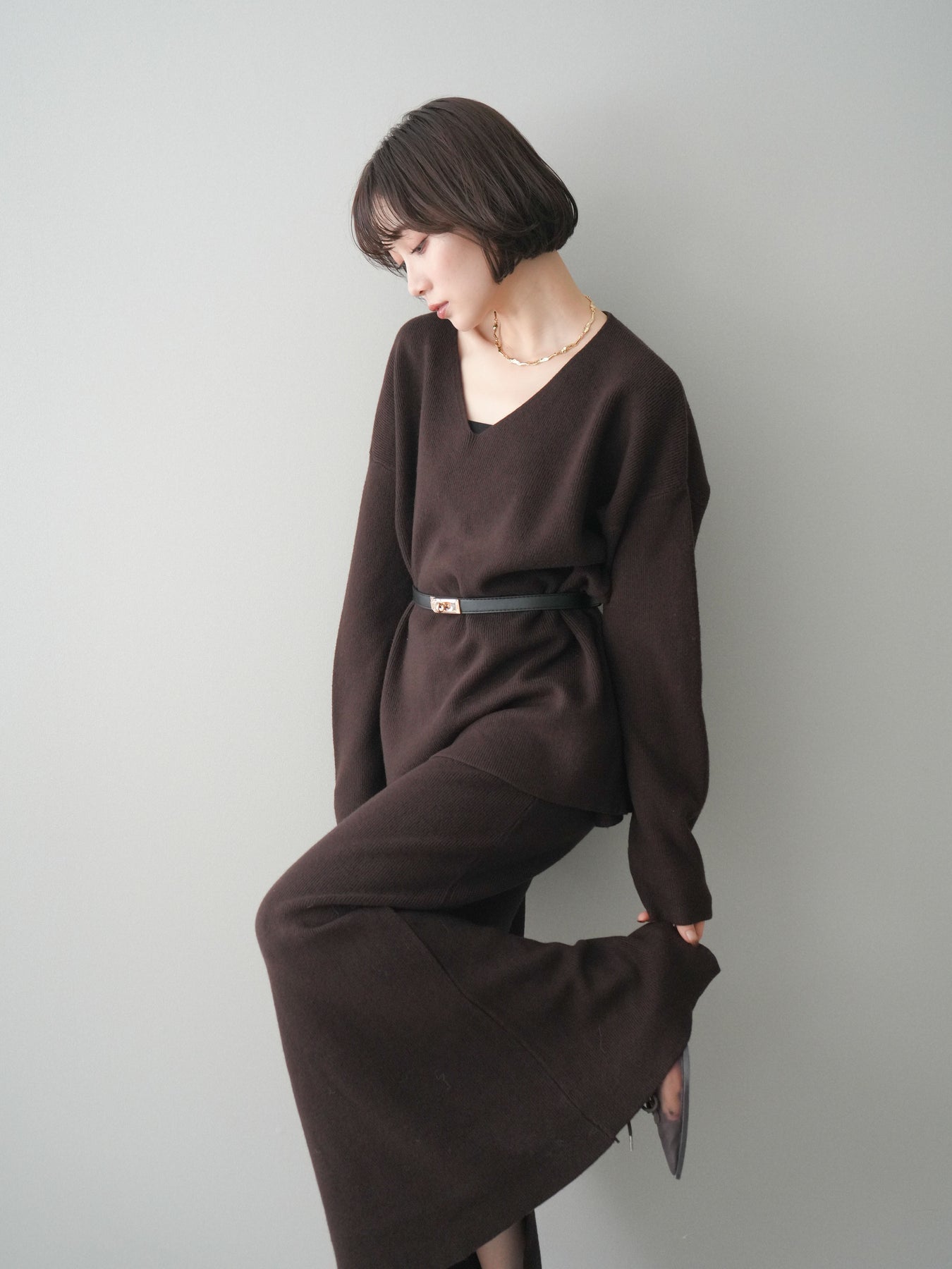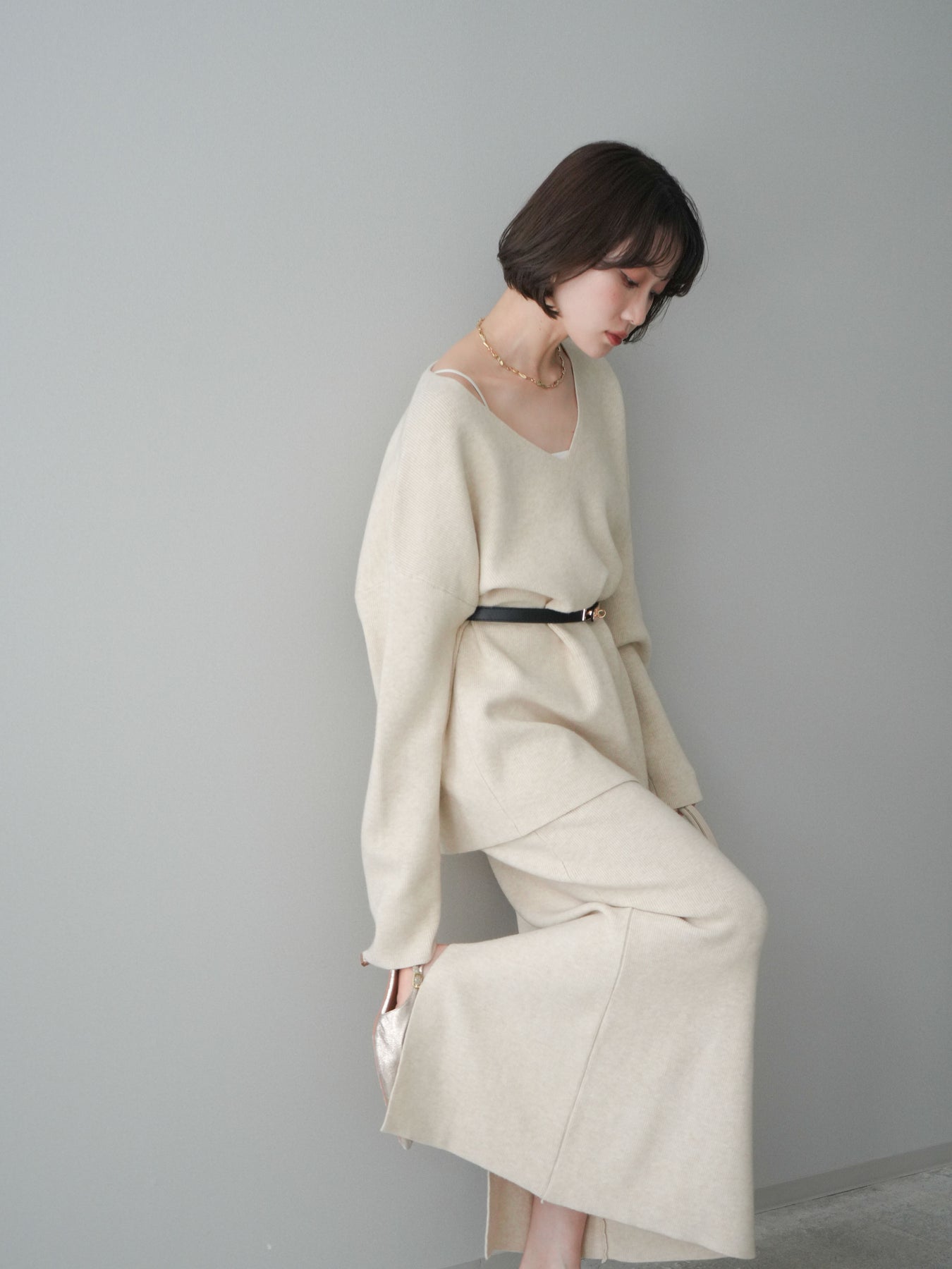[SET]ベルト付Vネックニット&スカートSET UP+選べるアクセセット(2set)