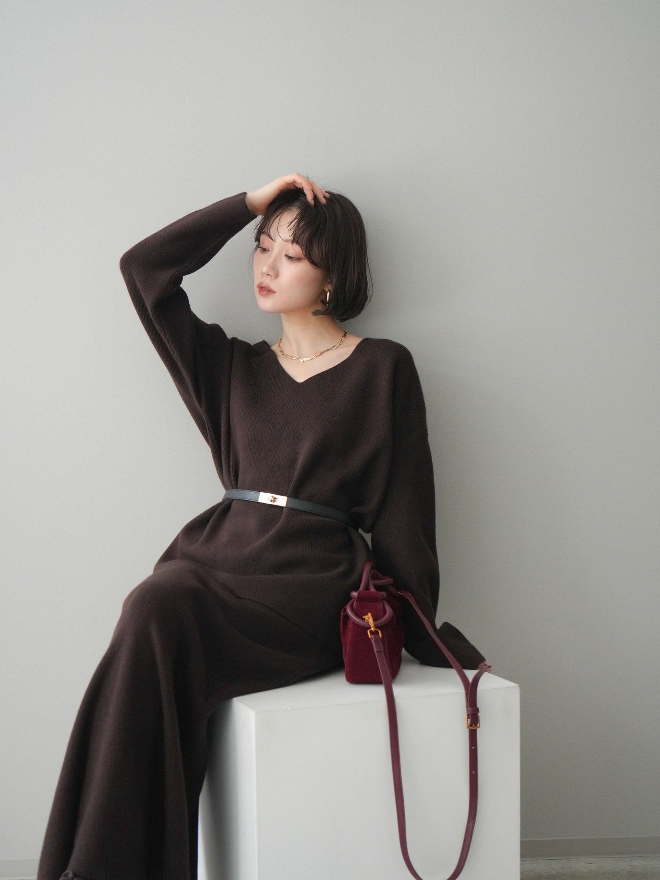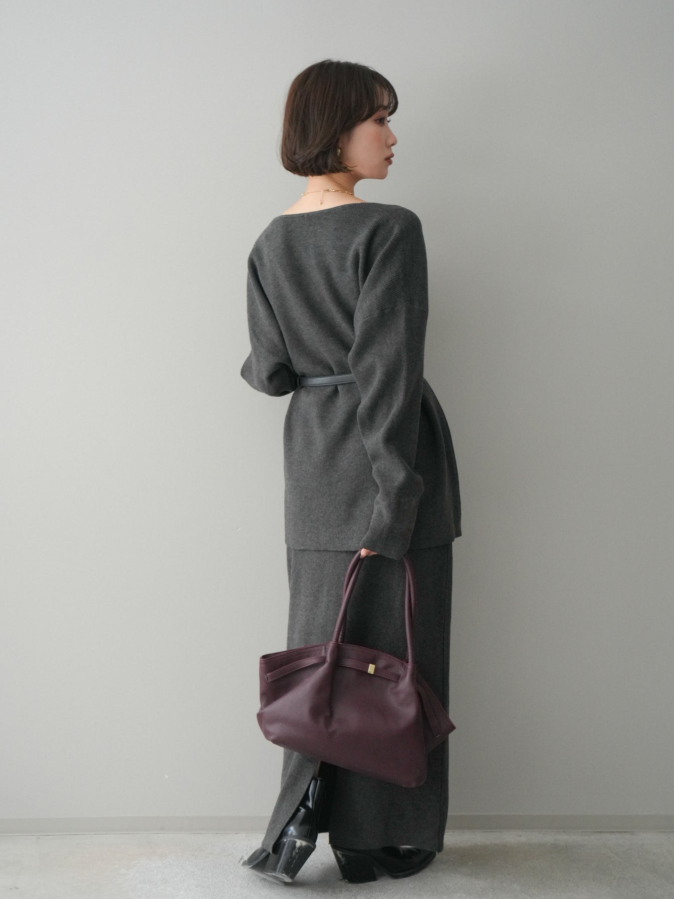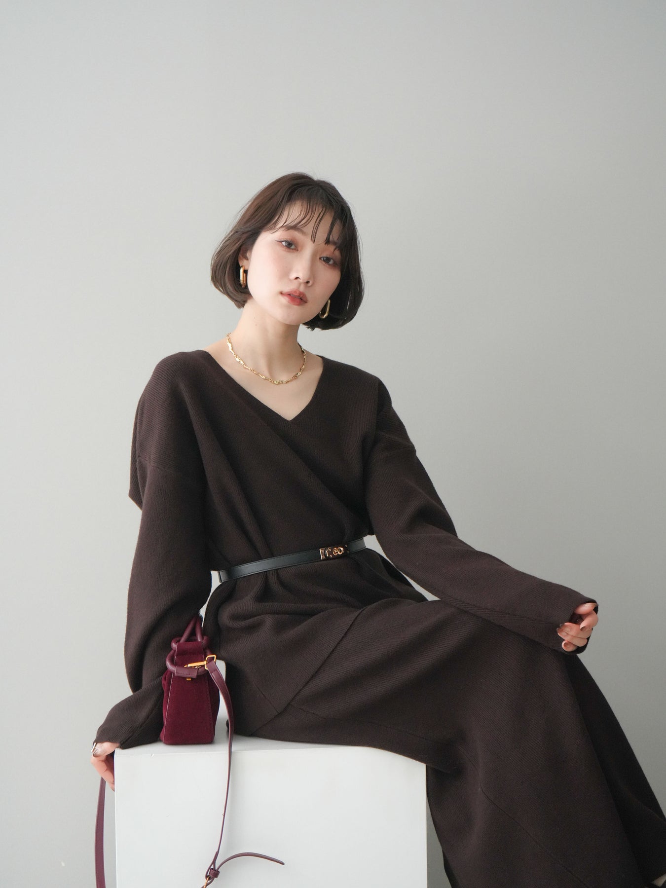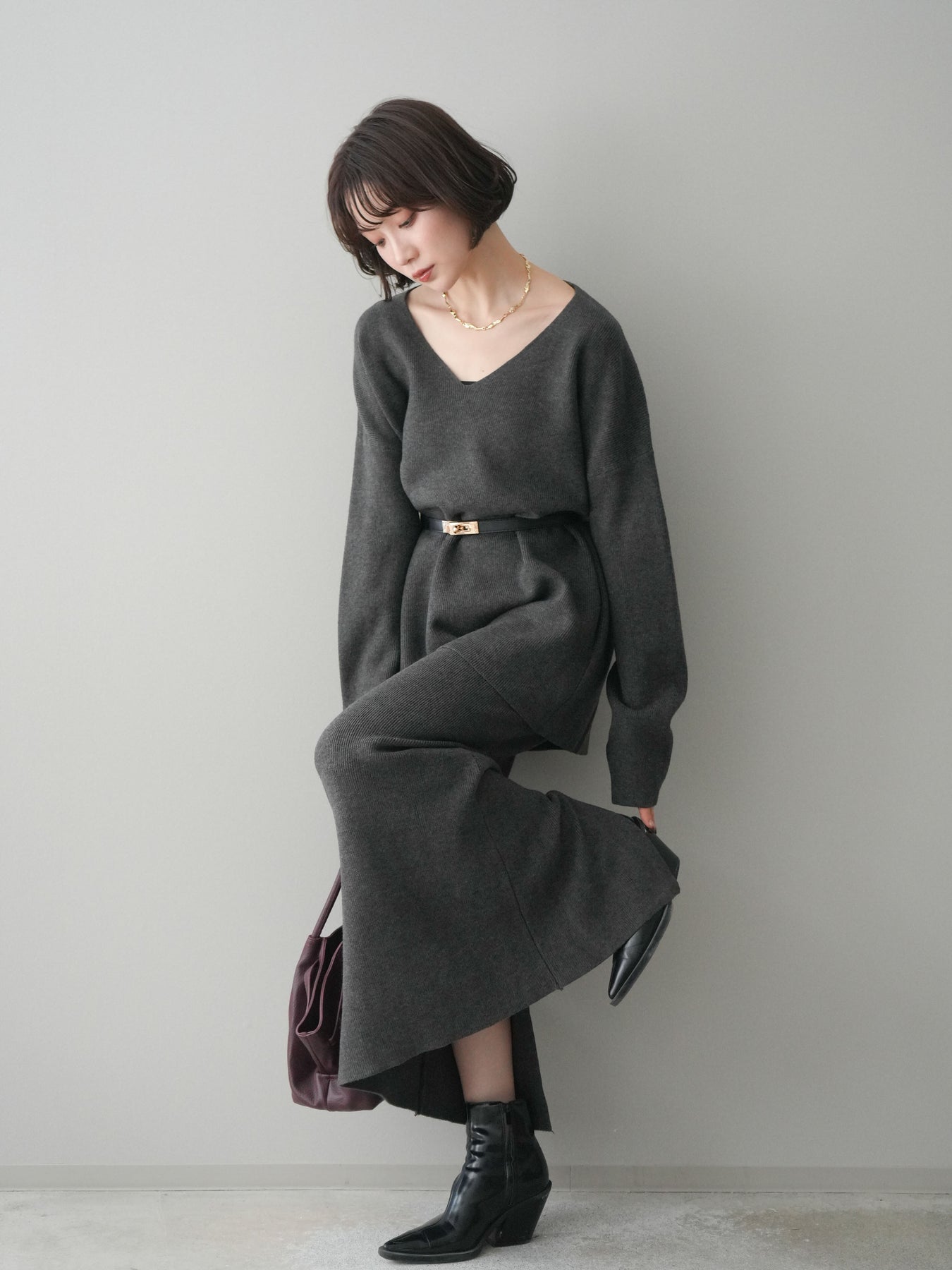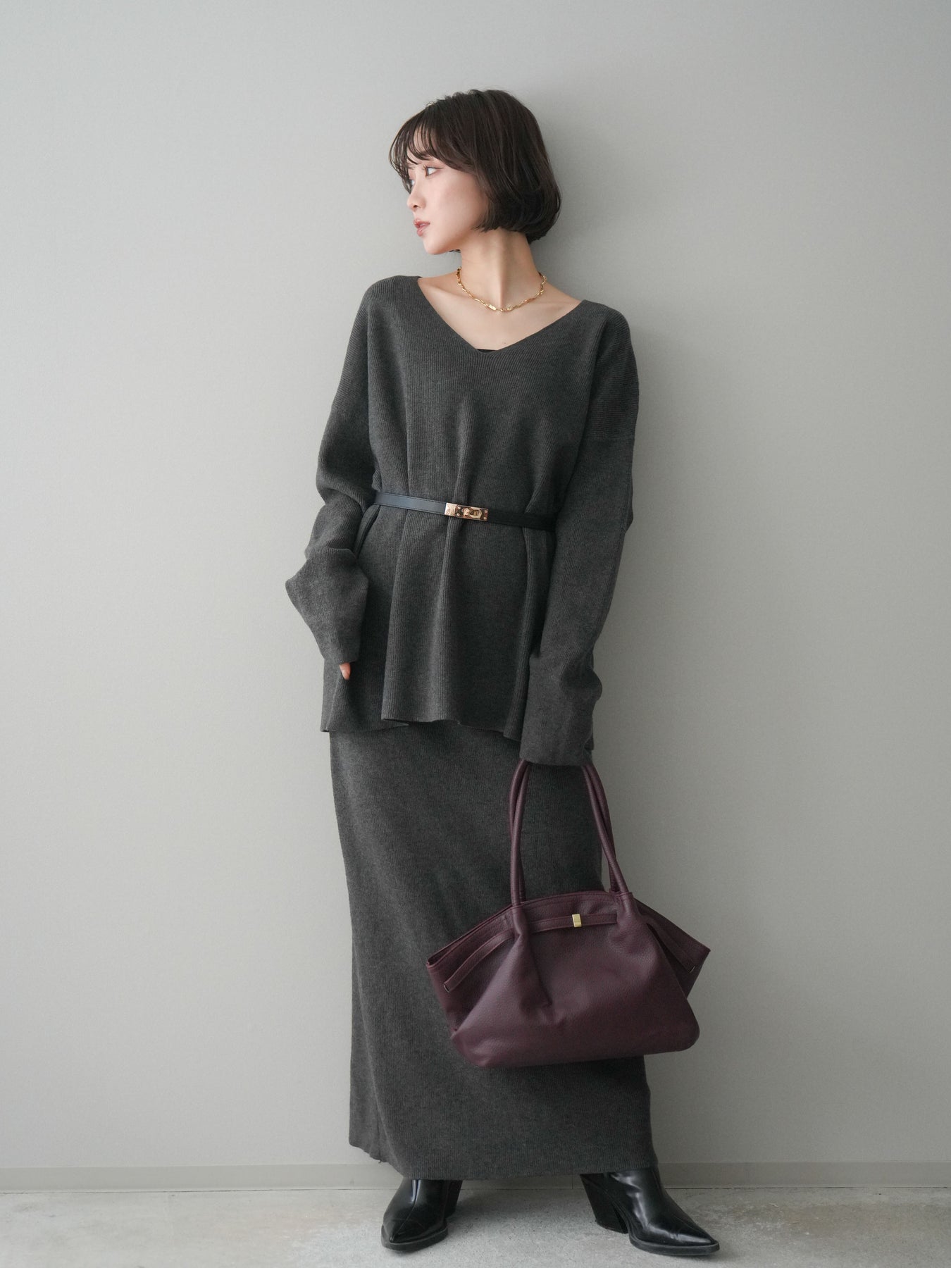 [SET]ベルト付Vネックニット&スカートSET UP+選べるアクセセット(2set)