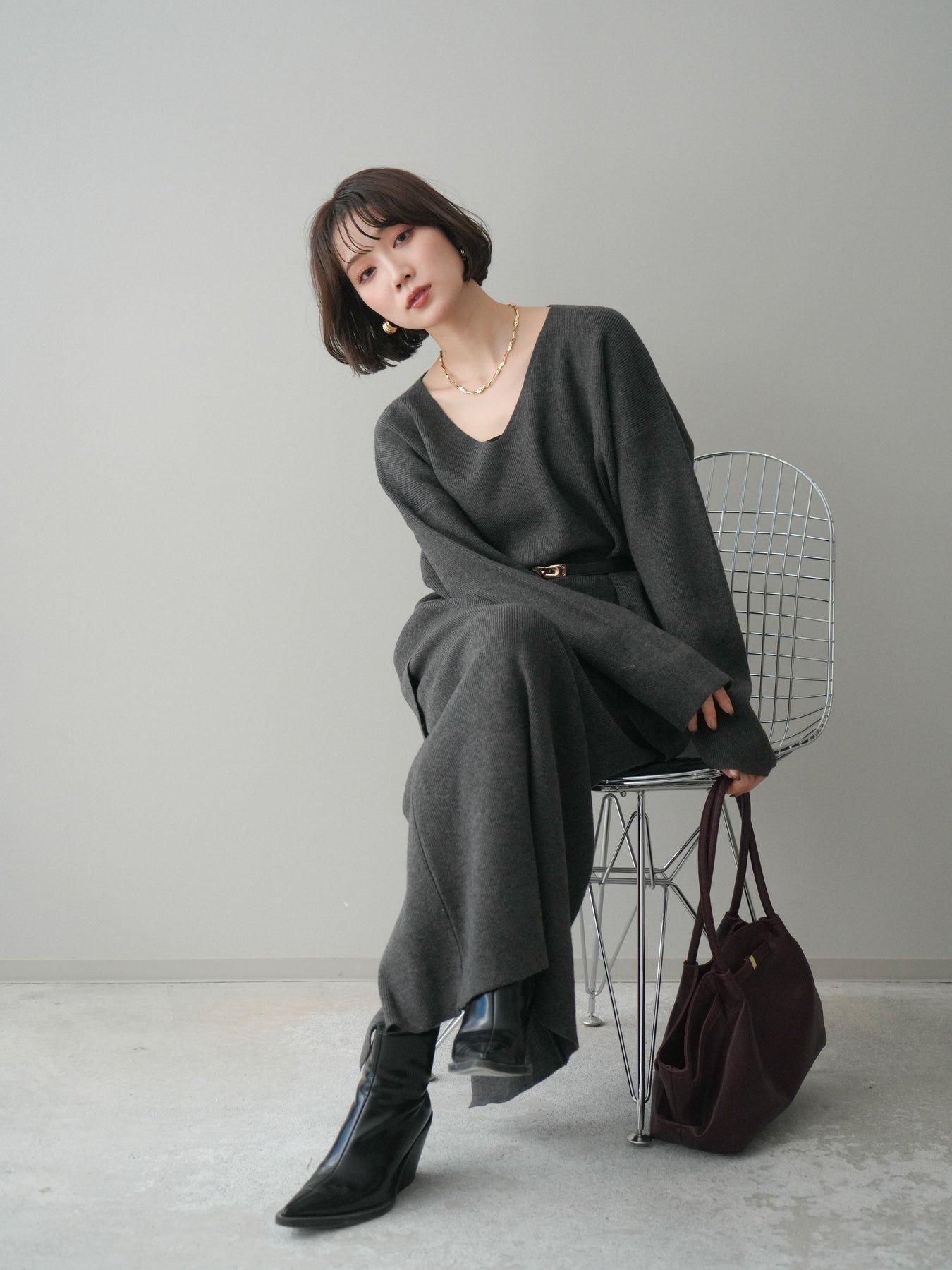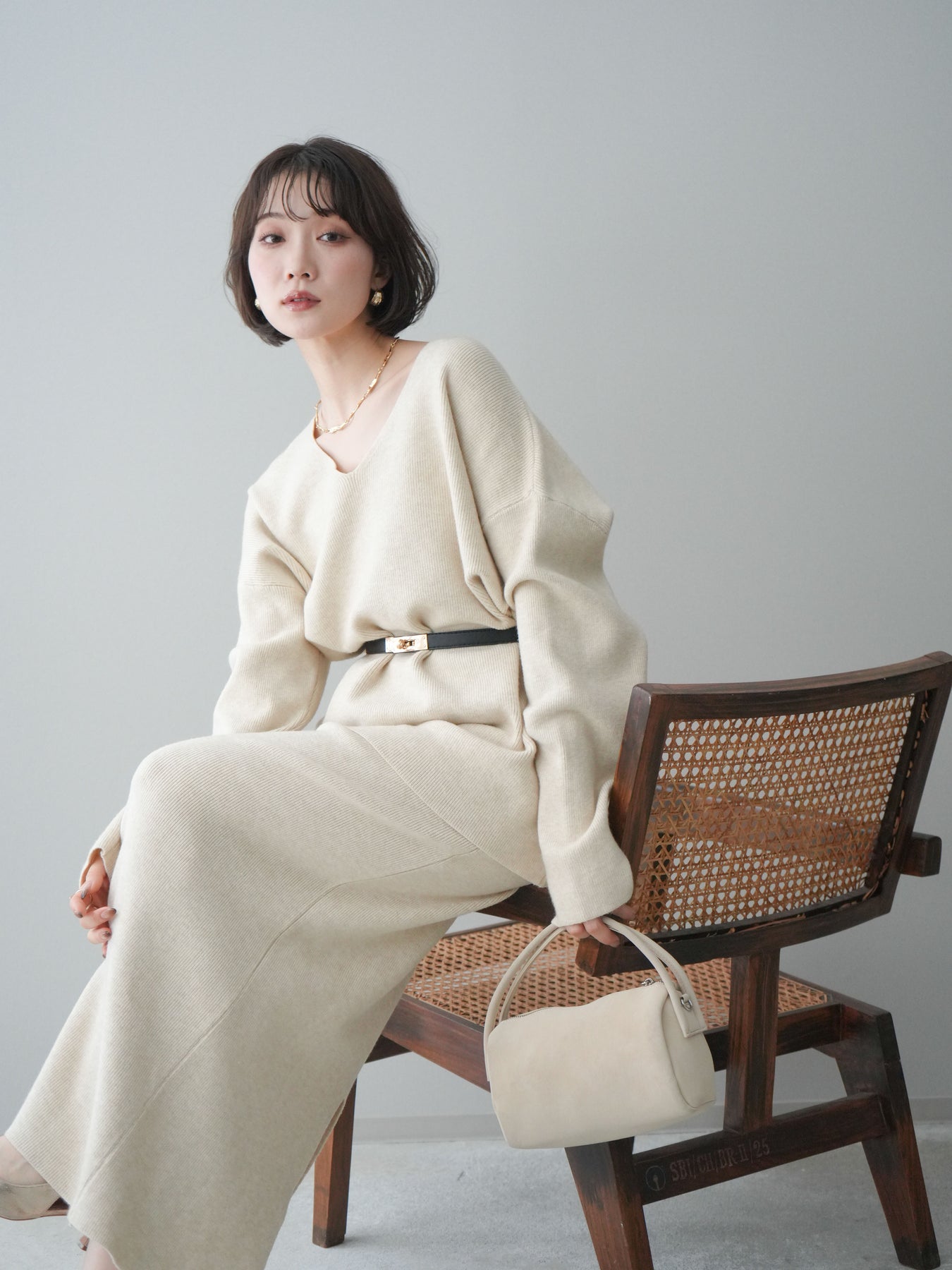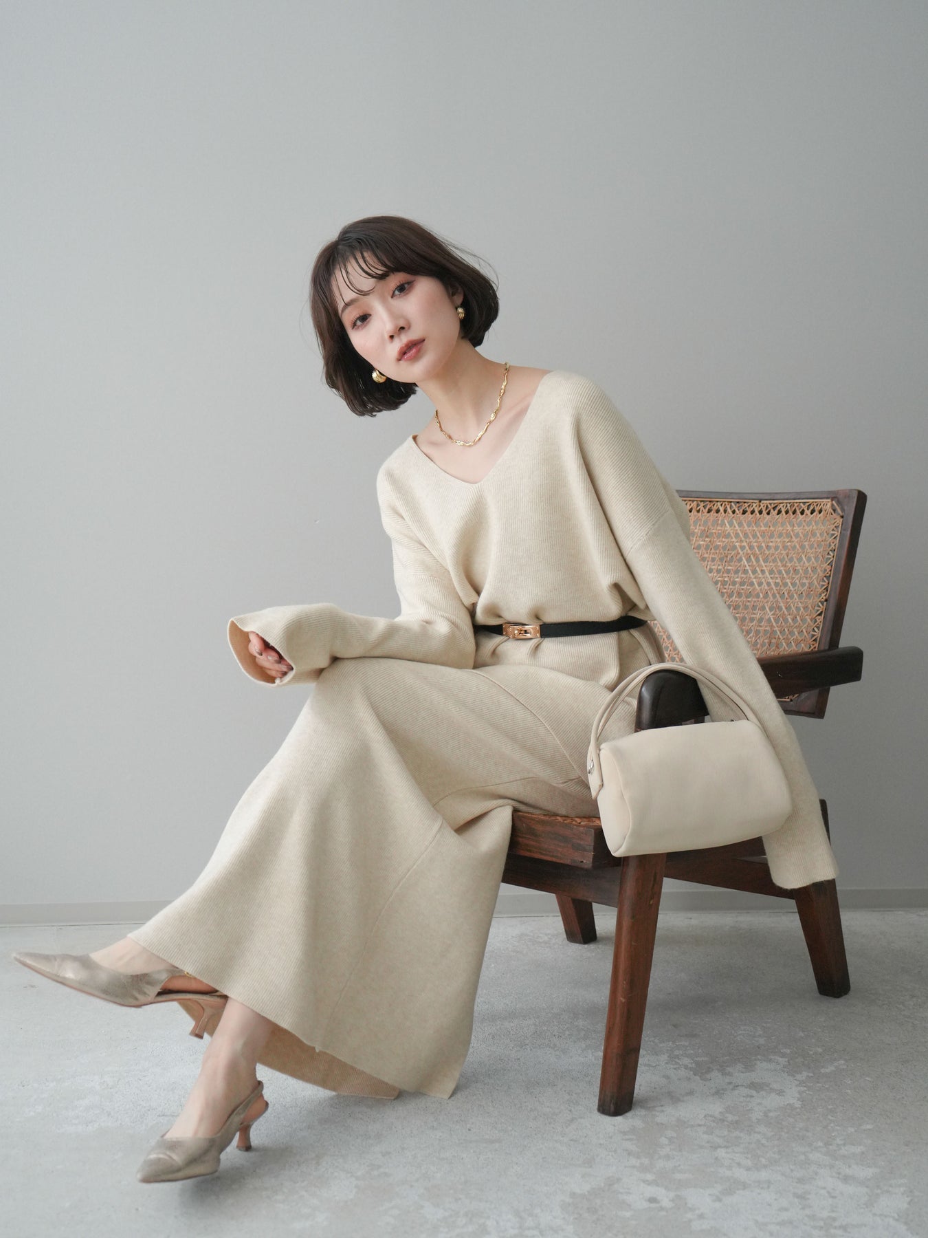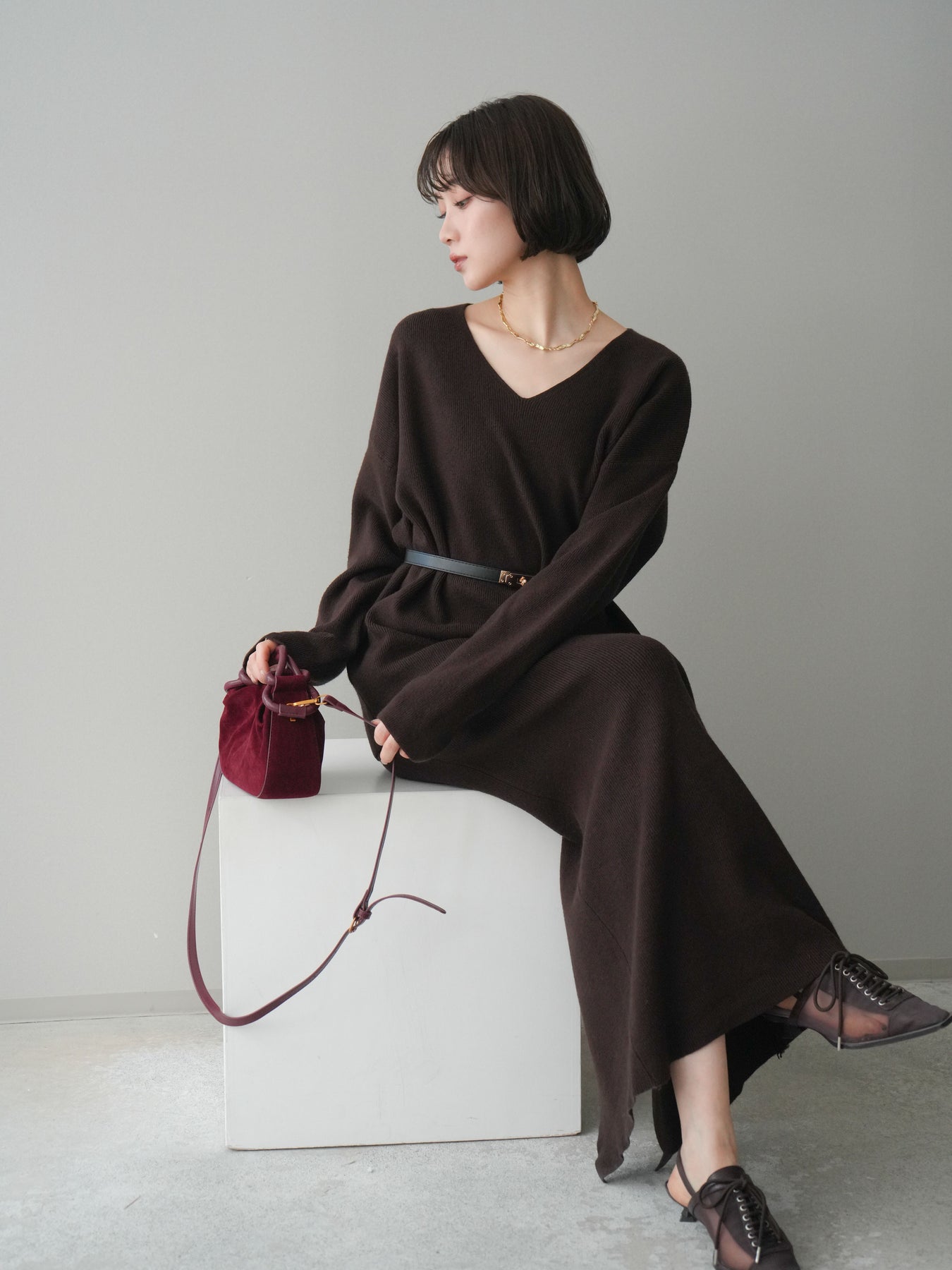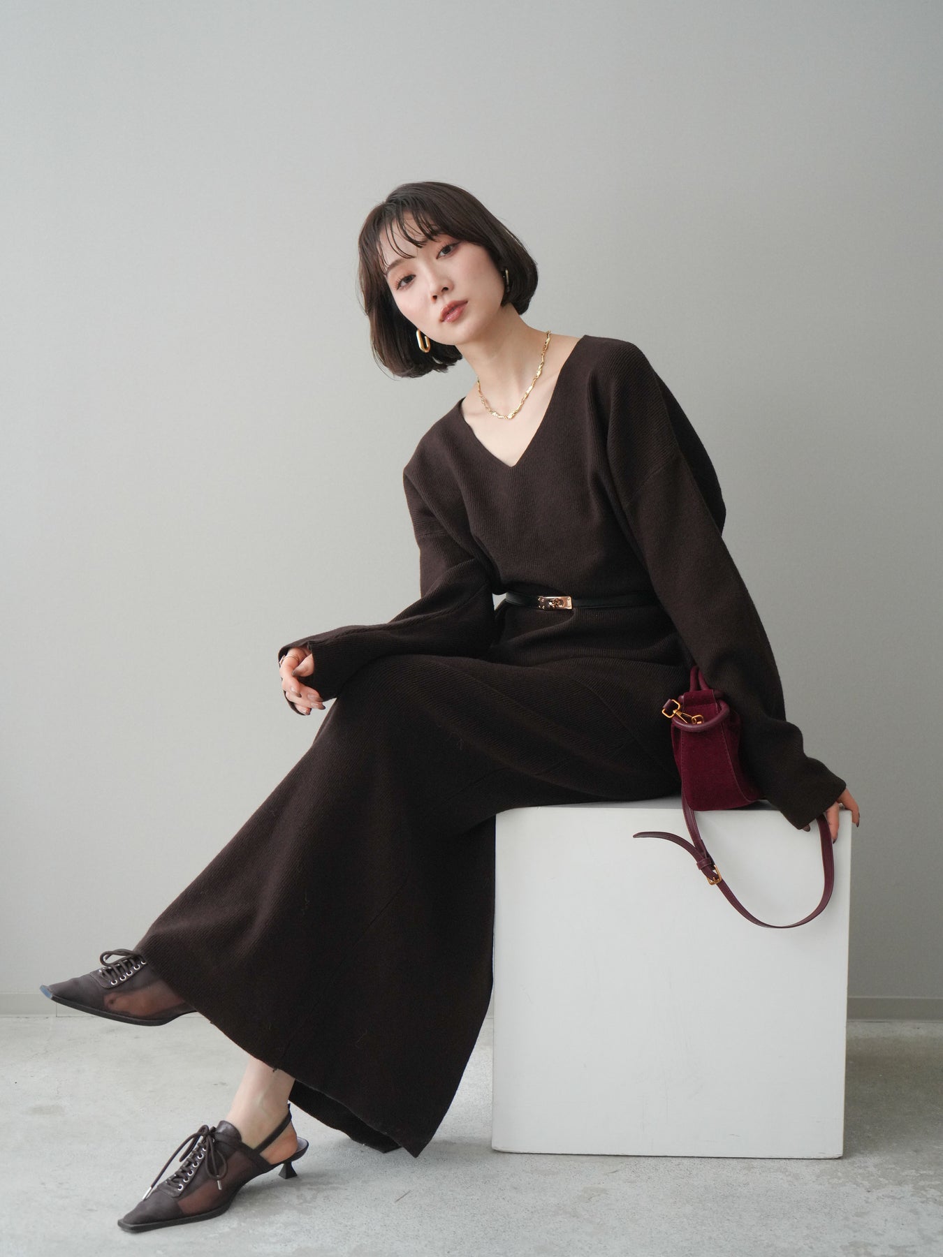 [SET]ベルト付Vネックニット&スカートSET UP+選べるアクセセット(2set)