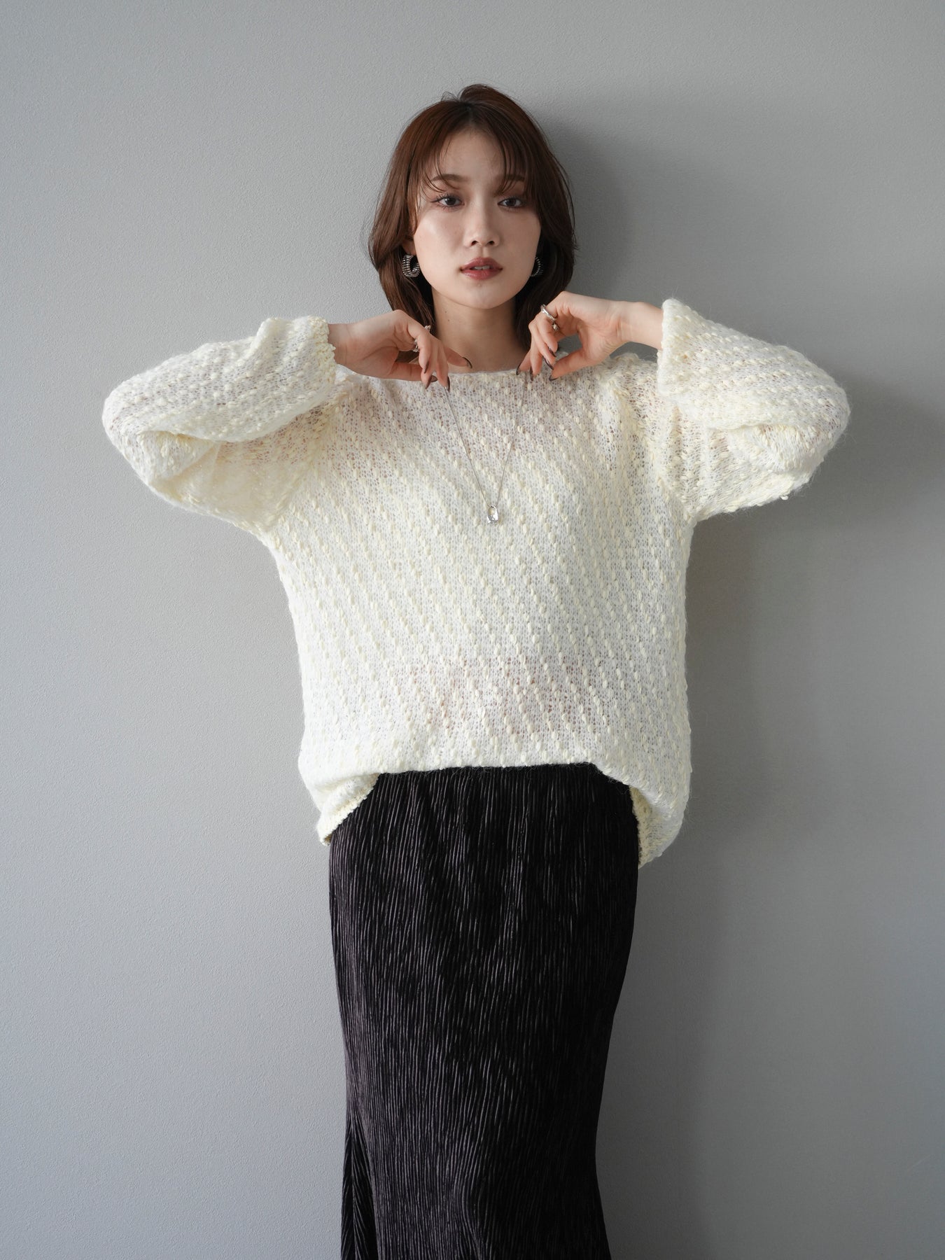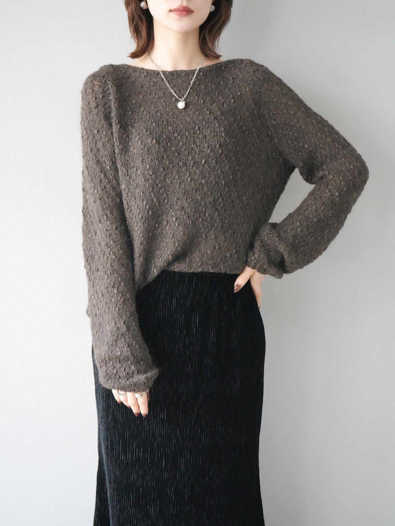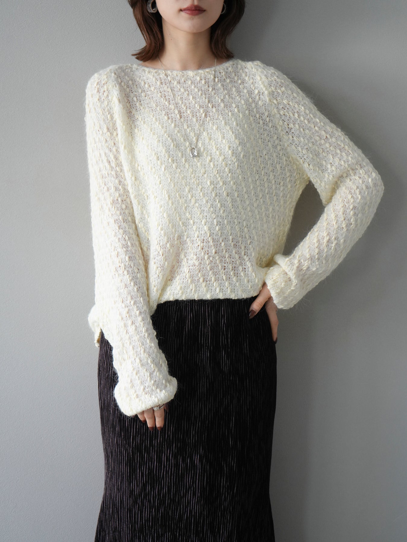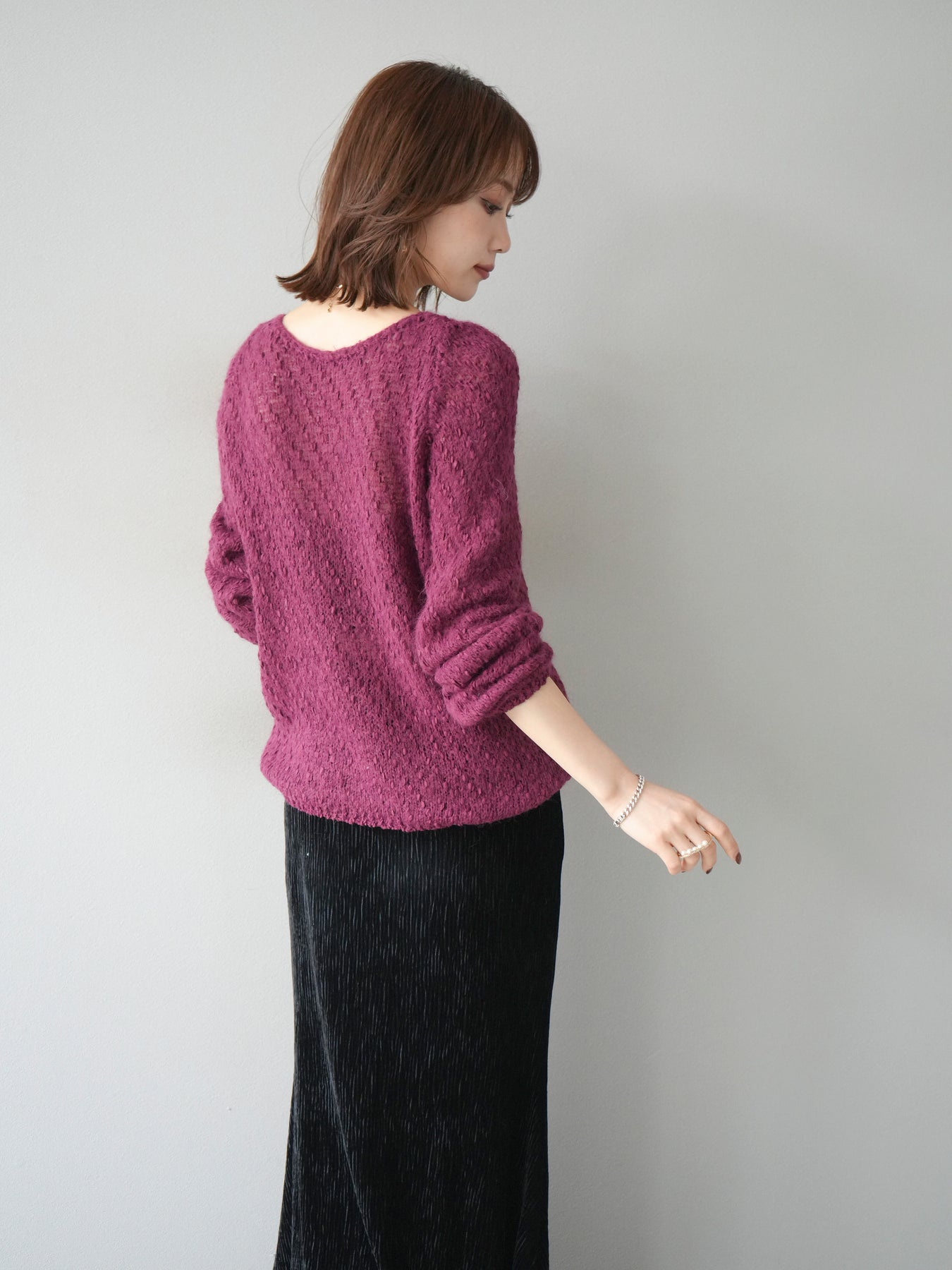 異なる糸をミックスした凹凸感のある編地が印象的なニットプルオーバー。程よくボディラインを拾わないシルエットでリラックス感がありながら、サイドにかけてのやや広がるラインが女性らしいニュアンスを演出。シンプルながらも表情のある生地が一枚で着映え、パンツにもスカートにも合わせやすいバランスで、カジュアルからフェミニンまで幅広いスタイリングに活躍。