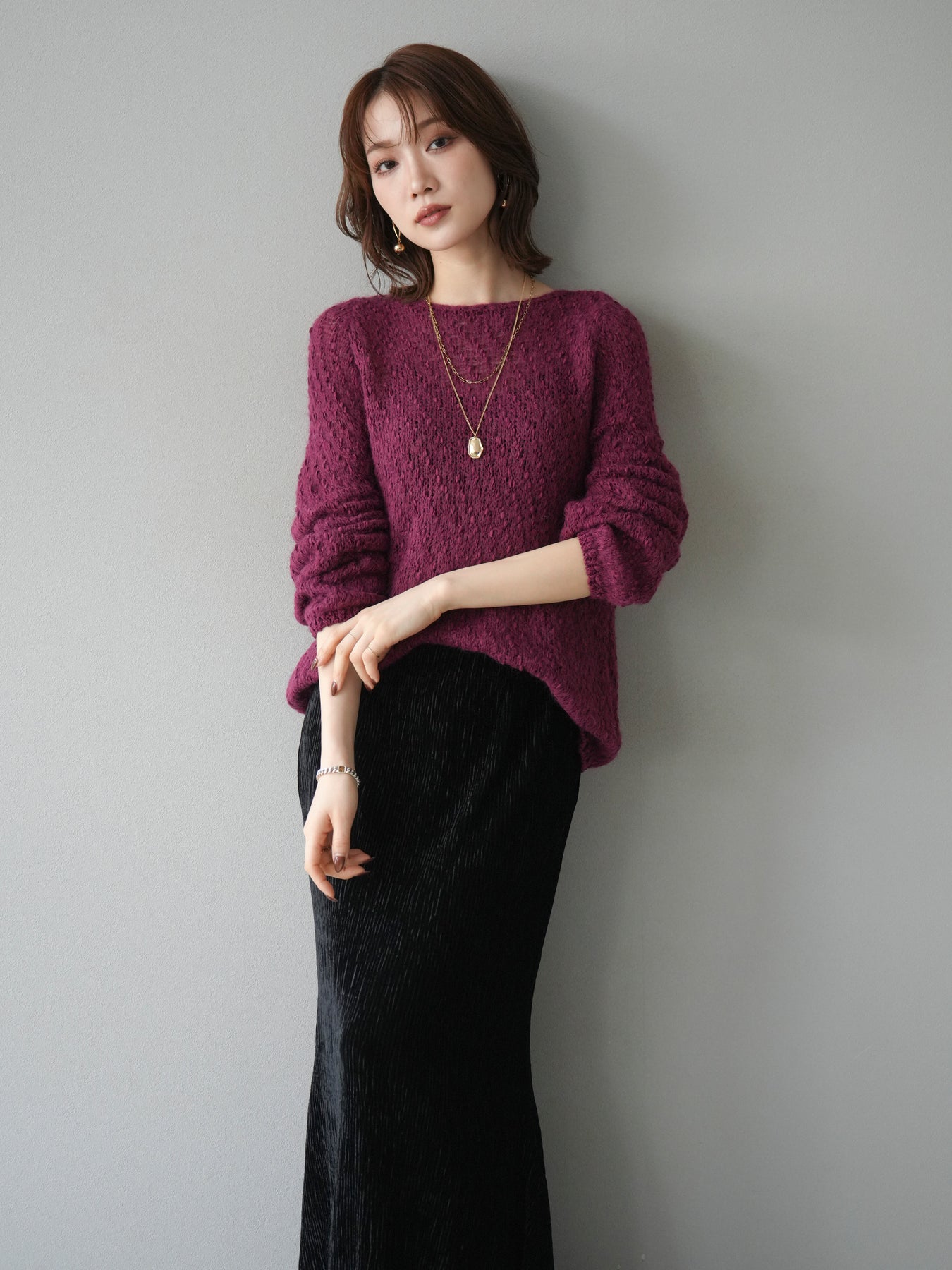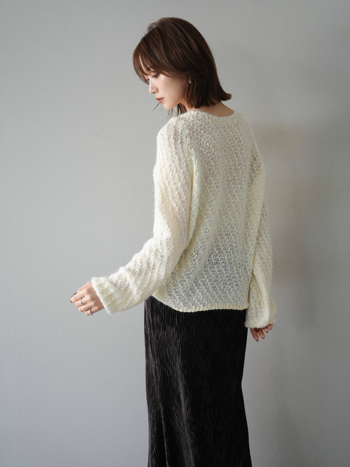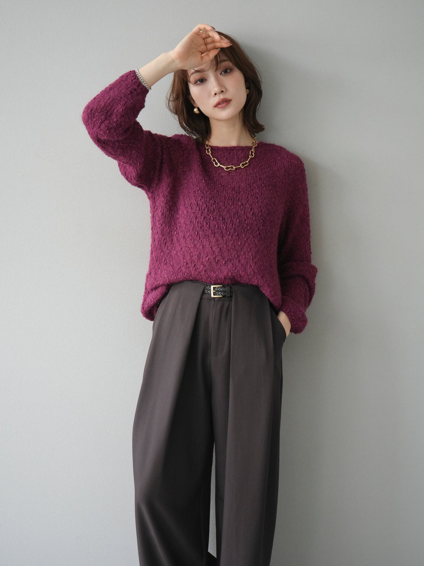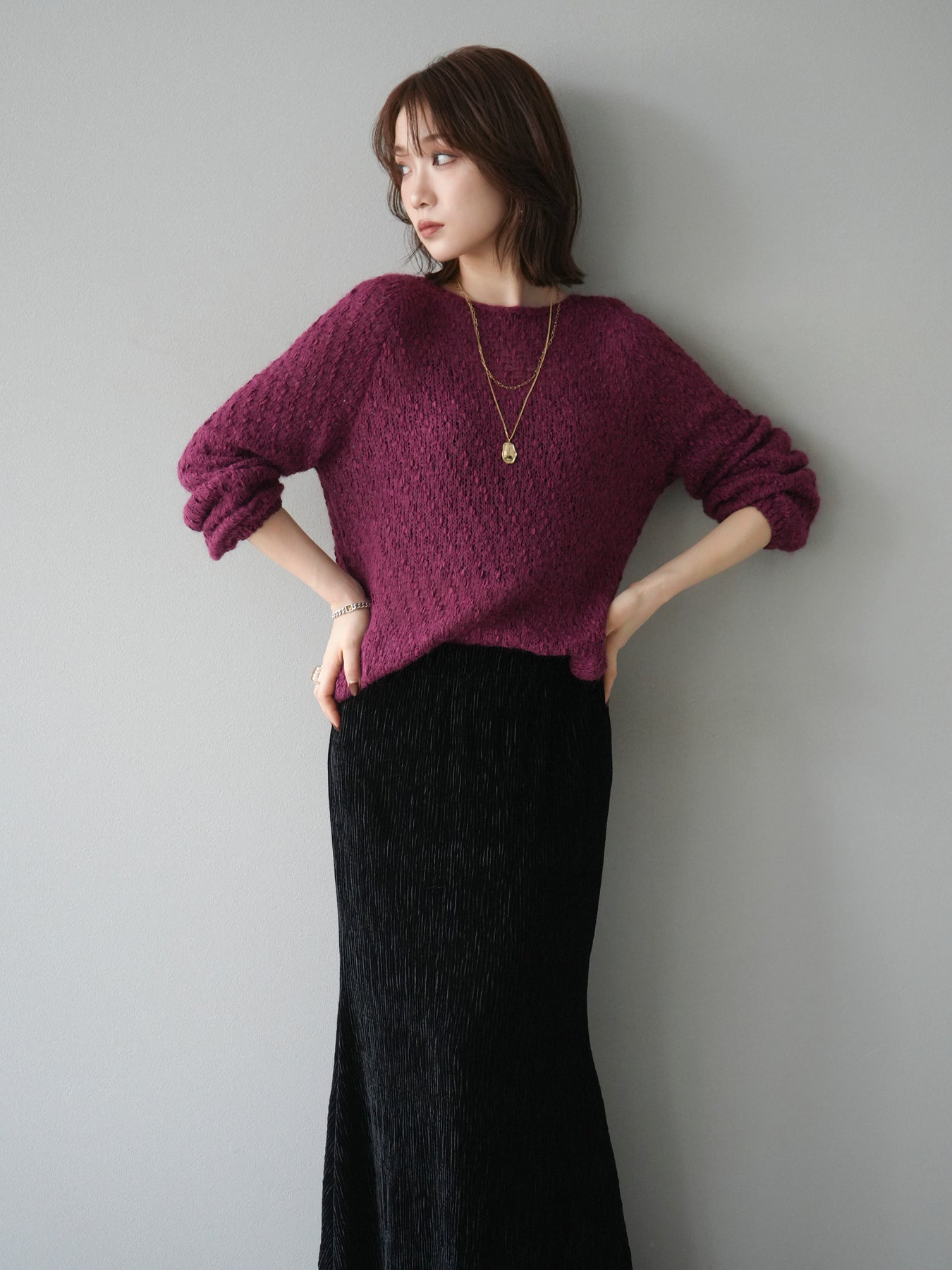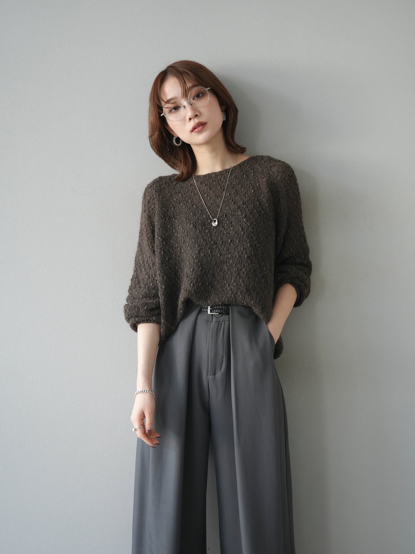 異なる糸をミックスした凹凸感のある編地が印象的なニットプルオーバー。程よくボディラインを拾わないシルエットでリラックス感がありながら、サイドにかけてのやや広がるラインが女性らしいニュアンスを演出。シンプルながらも表情のある生地が一枚で着映え、パンツにもスカートにも合わせやすいバランスで、カジュアルからフェミニンまで幅広いスタイリングに活躍。