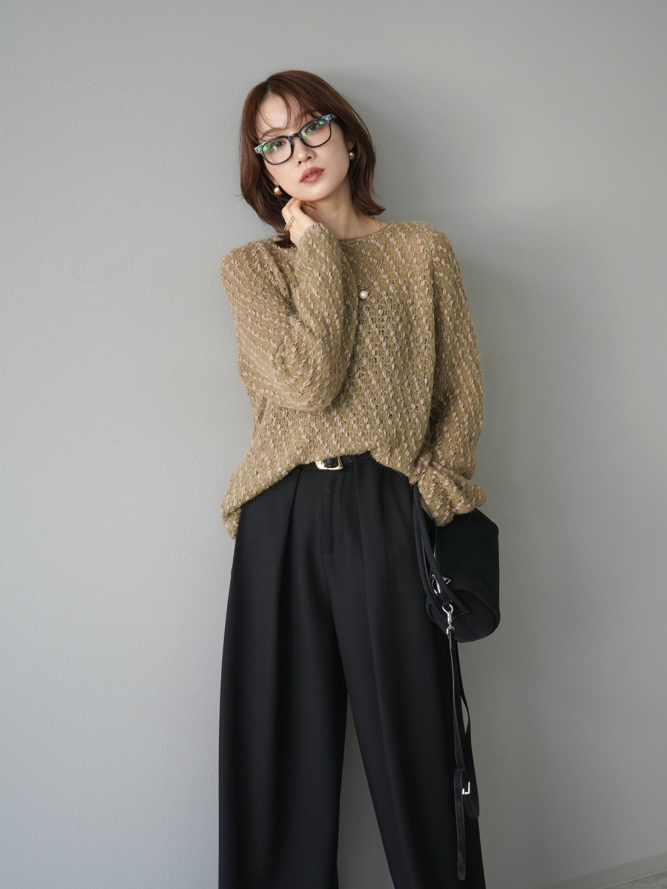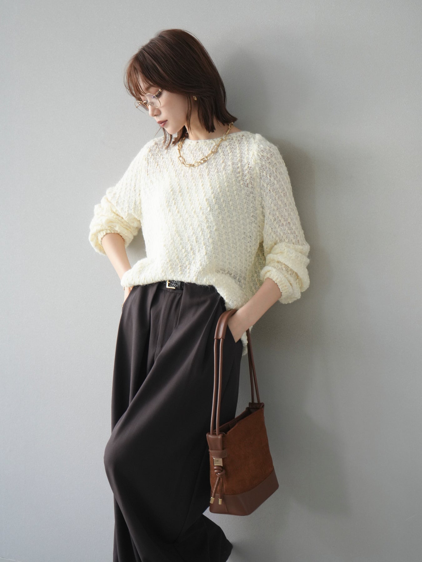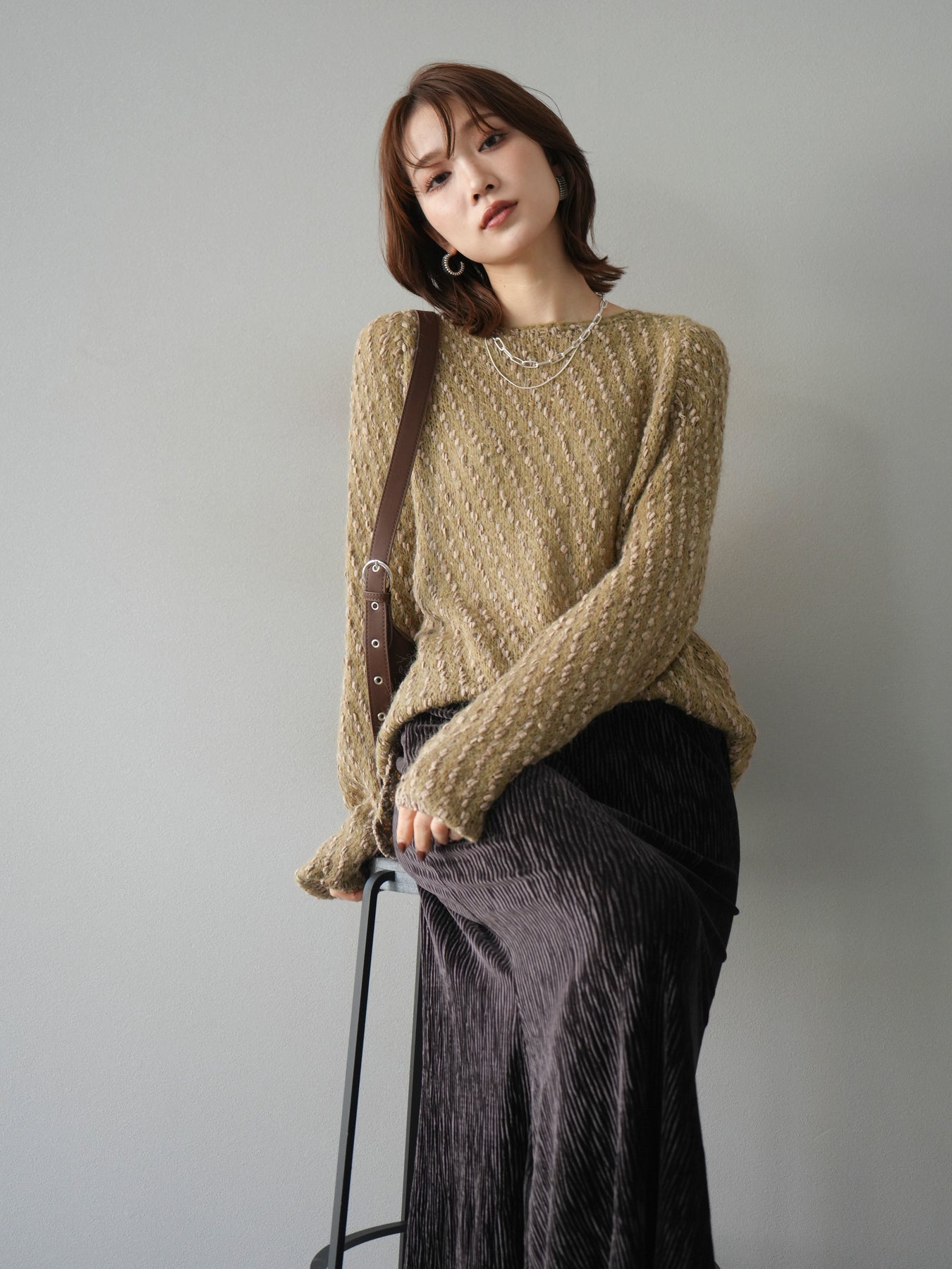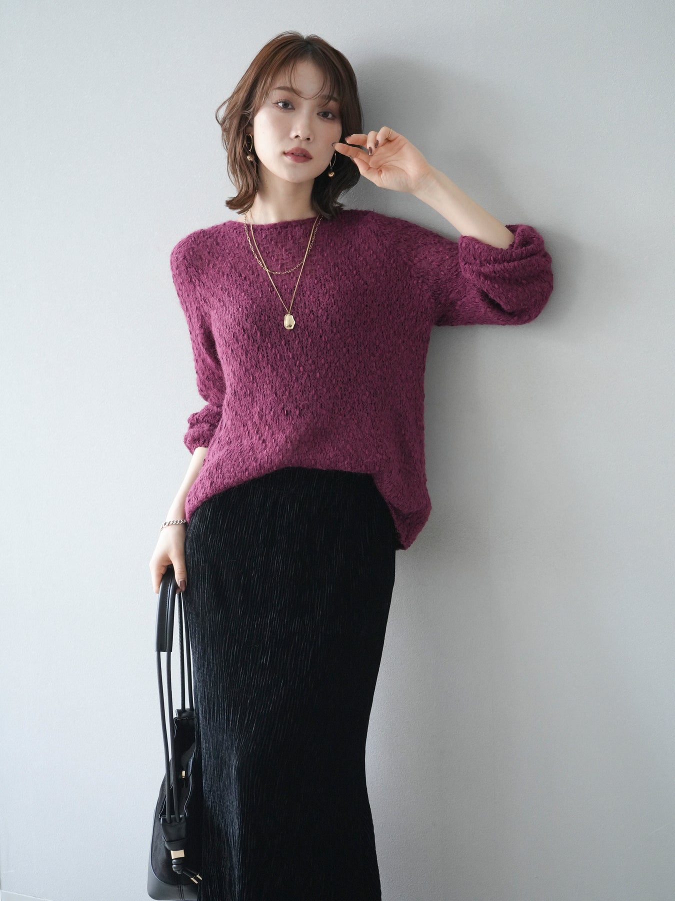 異なる糸をミックスした凹凸感のある編地が印象的なニットプルオーバー。程よくボディラインを拾わないシルエットでリラックス感がありながら、サイドにかけてのやや広がるラインが女性らしいニュアンスを演出。シンプルながらも表情のある生地が一枚で着映え、パンツにもスカートにも合わせやすいバランスで、カジュアルからフェミニンまで幅広いスタイリングに活躍。