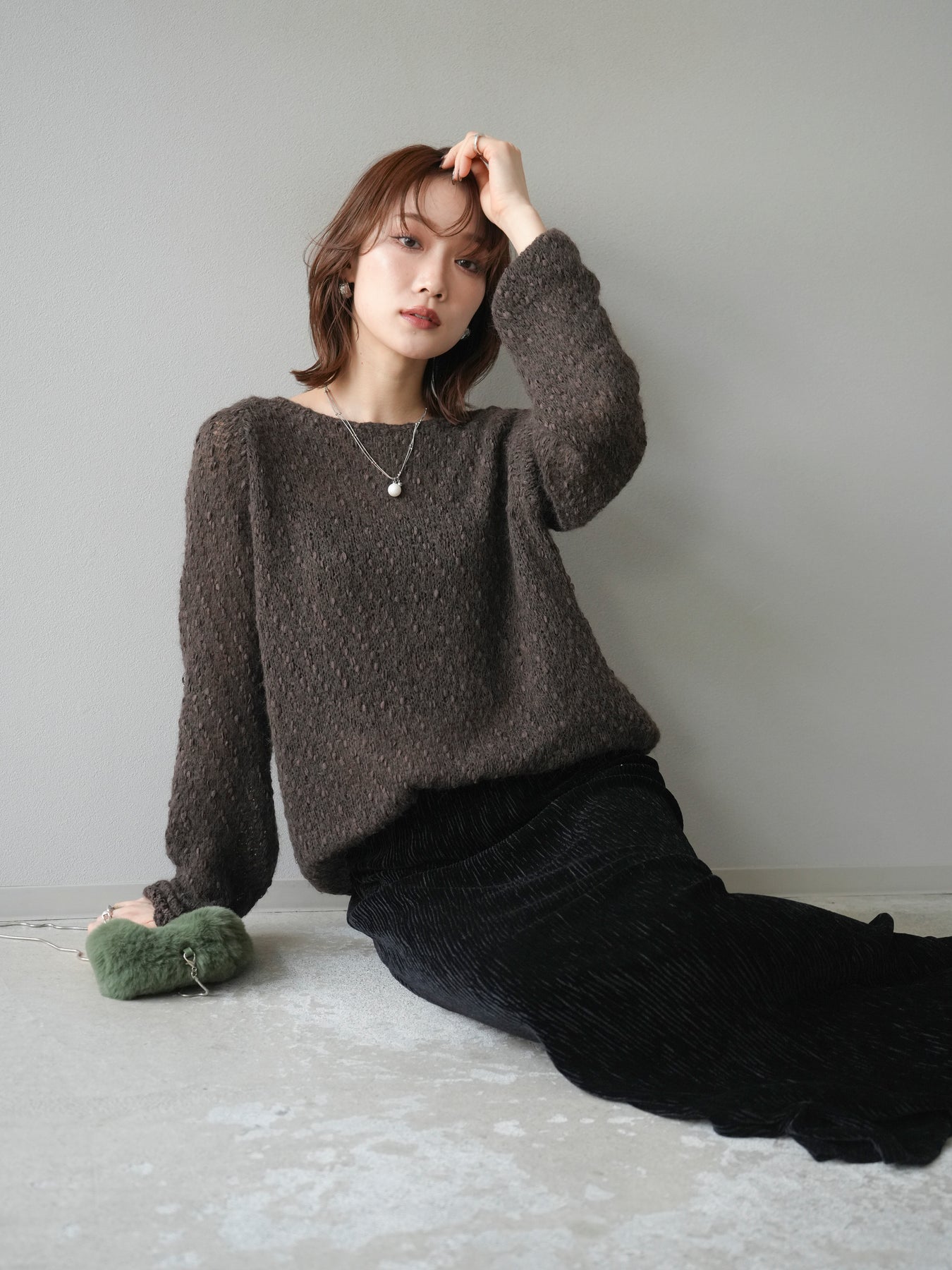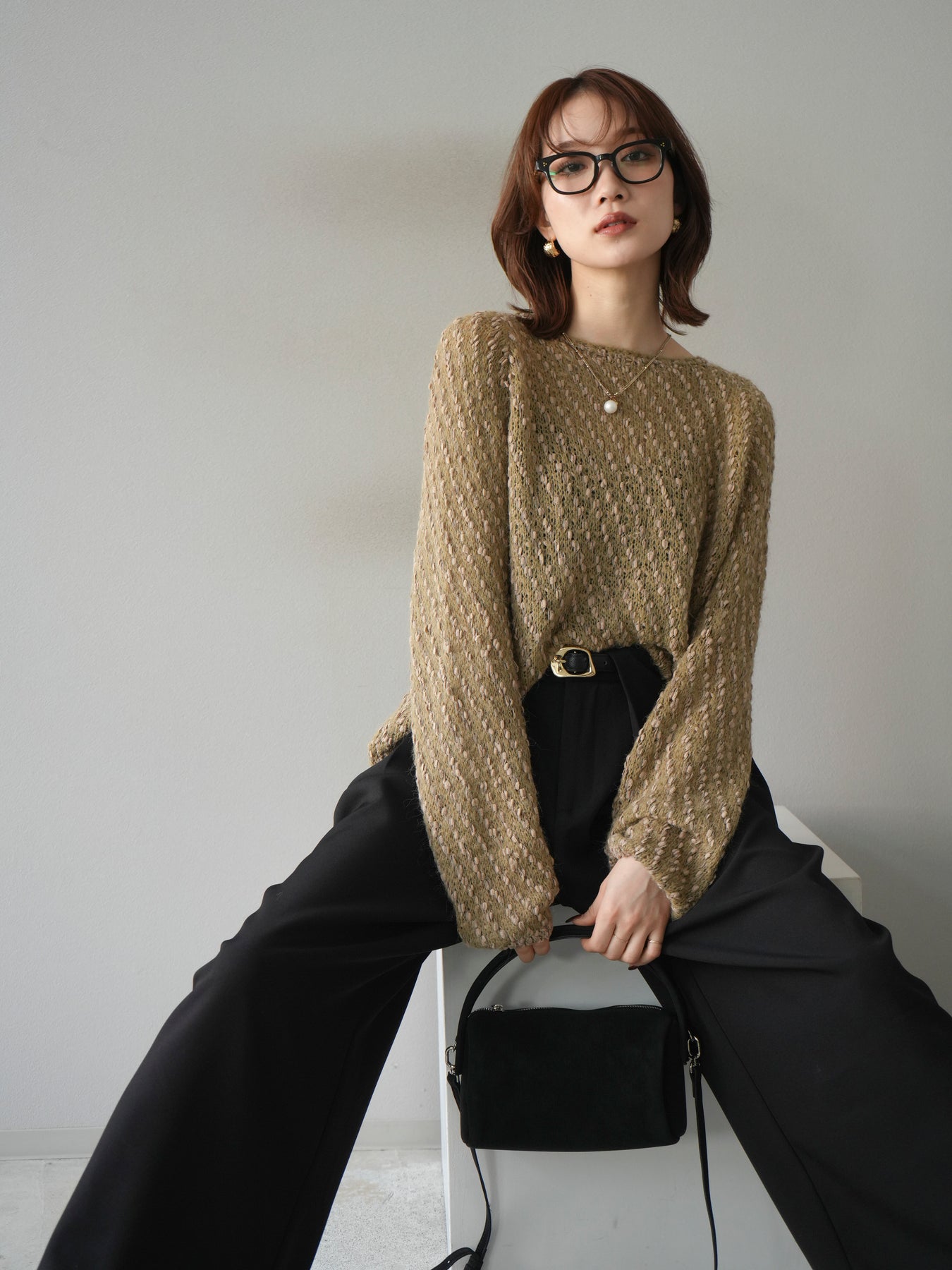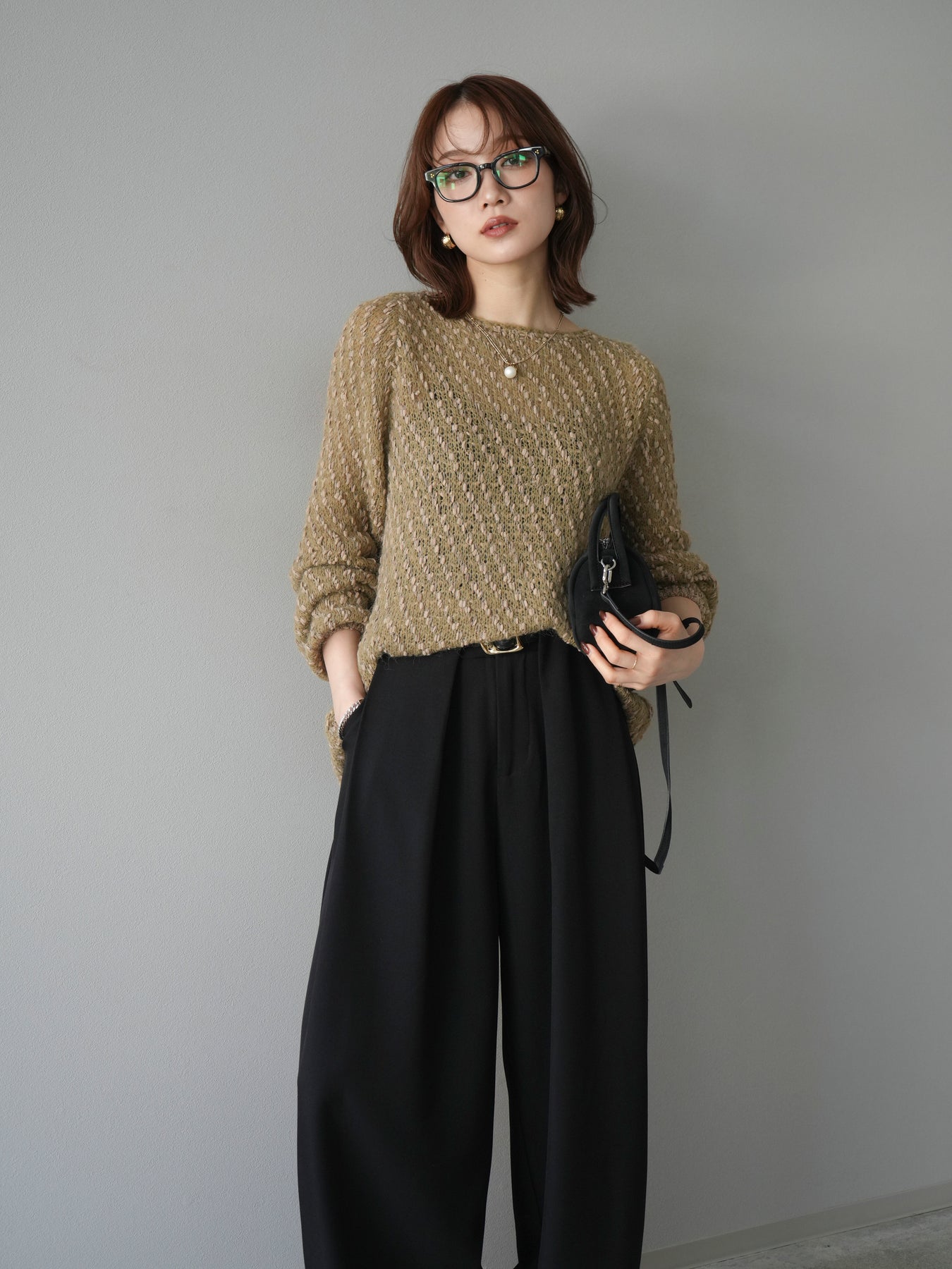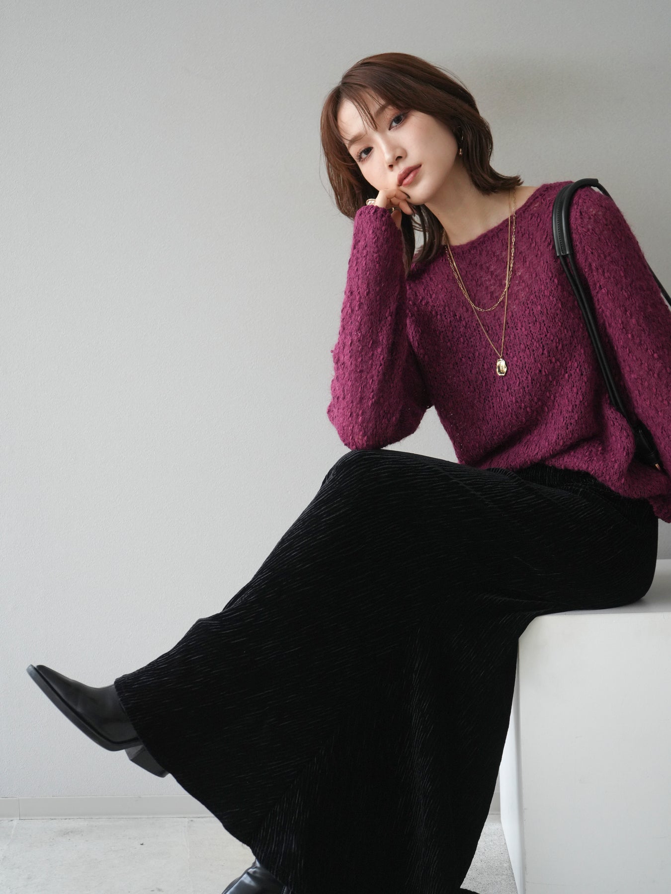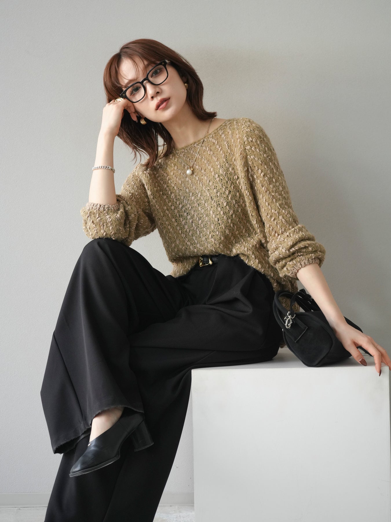 異なる糸をミックスした凹凸感のある編地が印象的なニットプルオーバー。程よくボディラインを拾わないシルエットでリラックス感がありながら、サイドにかけてのやや広がるラインが女性らしいニュアンスを演出。シンプルながらも表情のある生地が一枚で着映え、パンツにもスカートにも合わせやすいバランスで、カジュアルからフェミニンまで幅広いスタイリングに活躍。