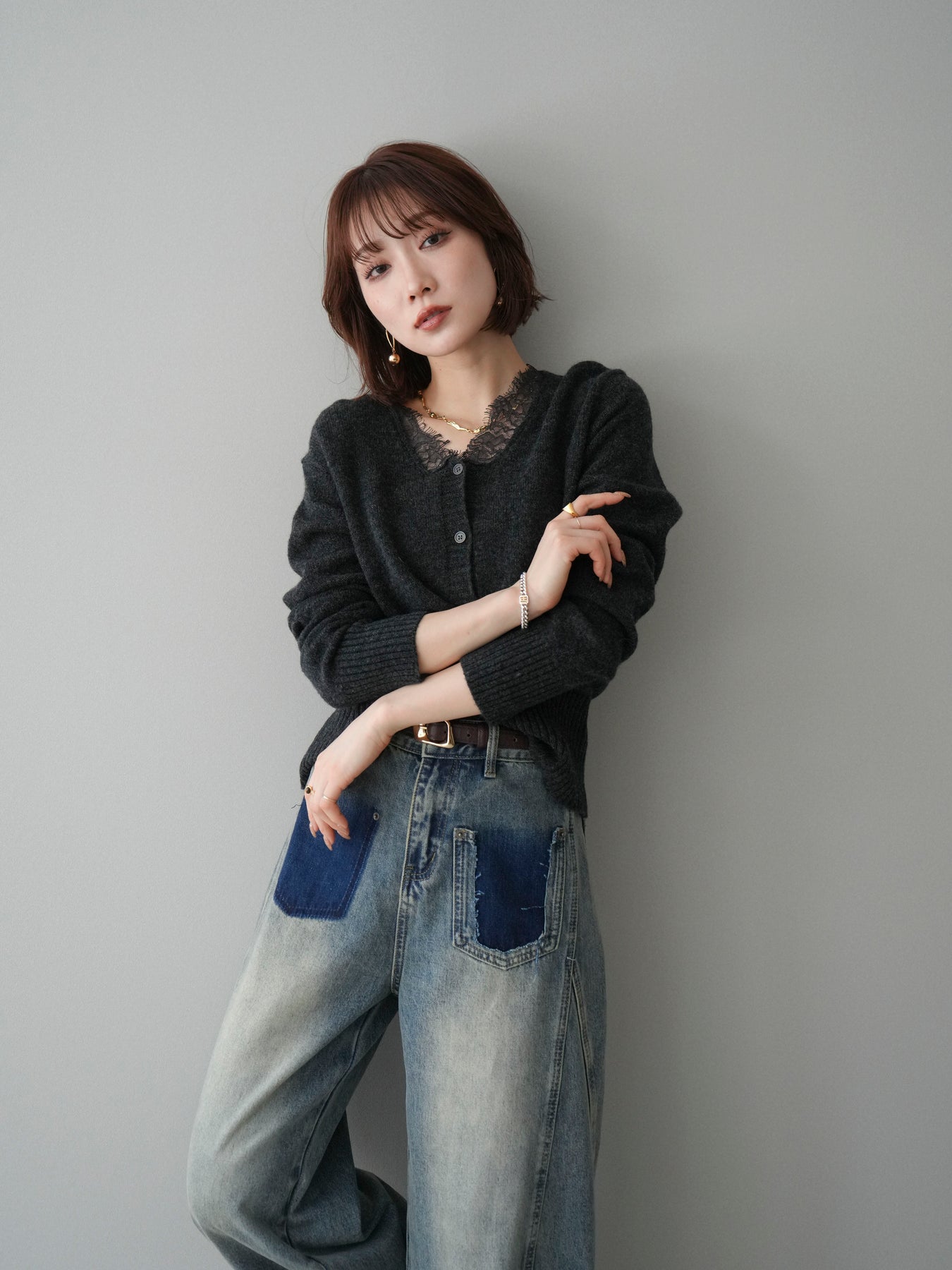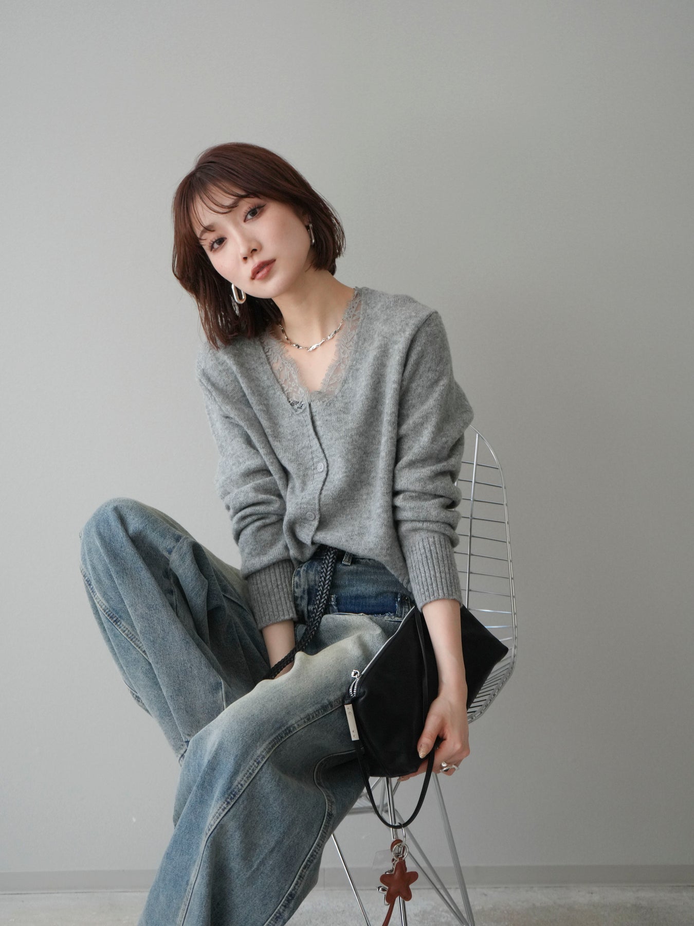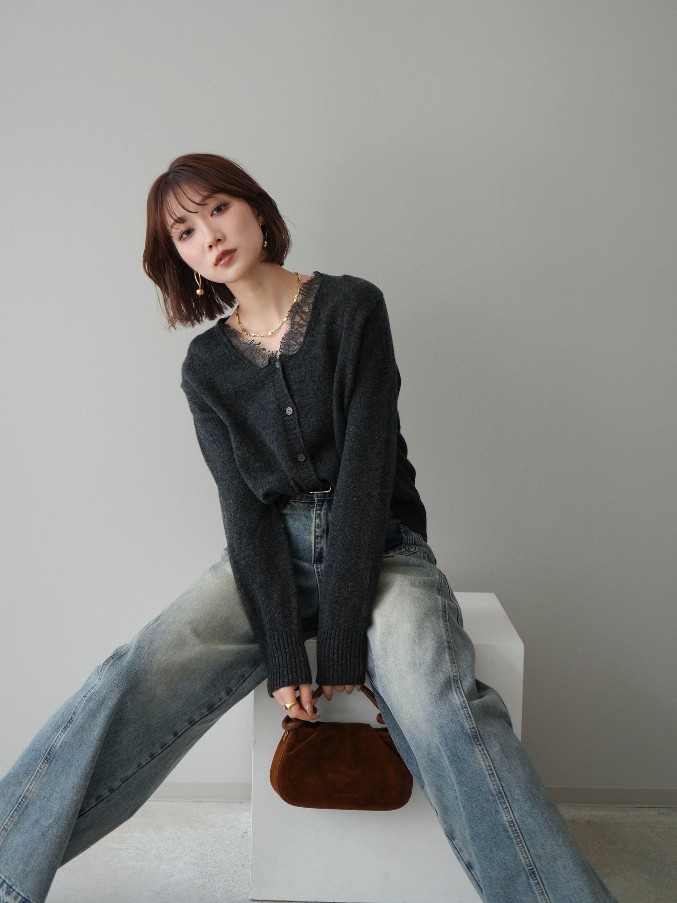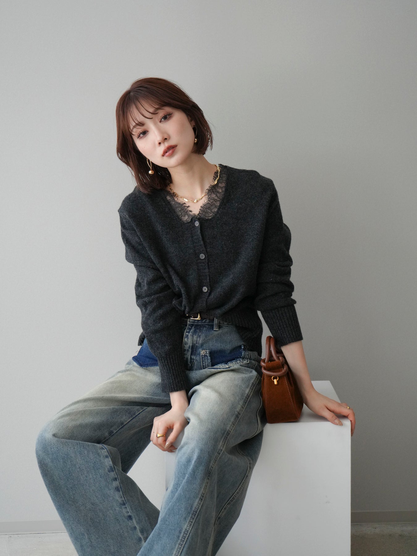 繊細なレースをネックラインにあしらった、表情豊かなニットカーディガン。 シンプルなシルエットの中に、レースの切り替えがさりげないアクセントとなり、顔まわりに奥行きをもたらします。フロントはボタン仕様で、きちんと感がありながらも、程よく力の抜けた雰囲気に仕上がっています。 ニット素材はやわらかく、肌なじみの良い着心地。身頃はすっきりとしつつも、窮屈さを感じにくい設計で、トップスとしても羽織りとしても使いやすい一着です。レース部分が主張しすぎないため、デニムやスラックス、スカートなど幅広いボトムスと自然に馴染みます。 予約商品としてのご用意となり、デイリーに取り入れやすい実用性と、ディテールにこだわったデザイン性を兼ね備えたアイテム。シンプルなスタイリングに取り入れるだけで、程よく印象を変えてくれます。 ※ボトムス、キャミソール(インナー)以外の商品は一律でインナーは付属していません。
