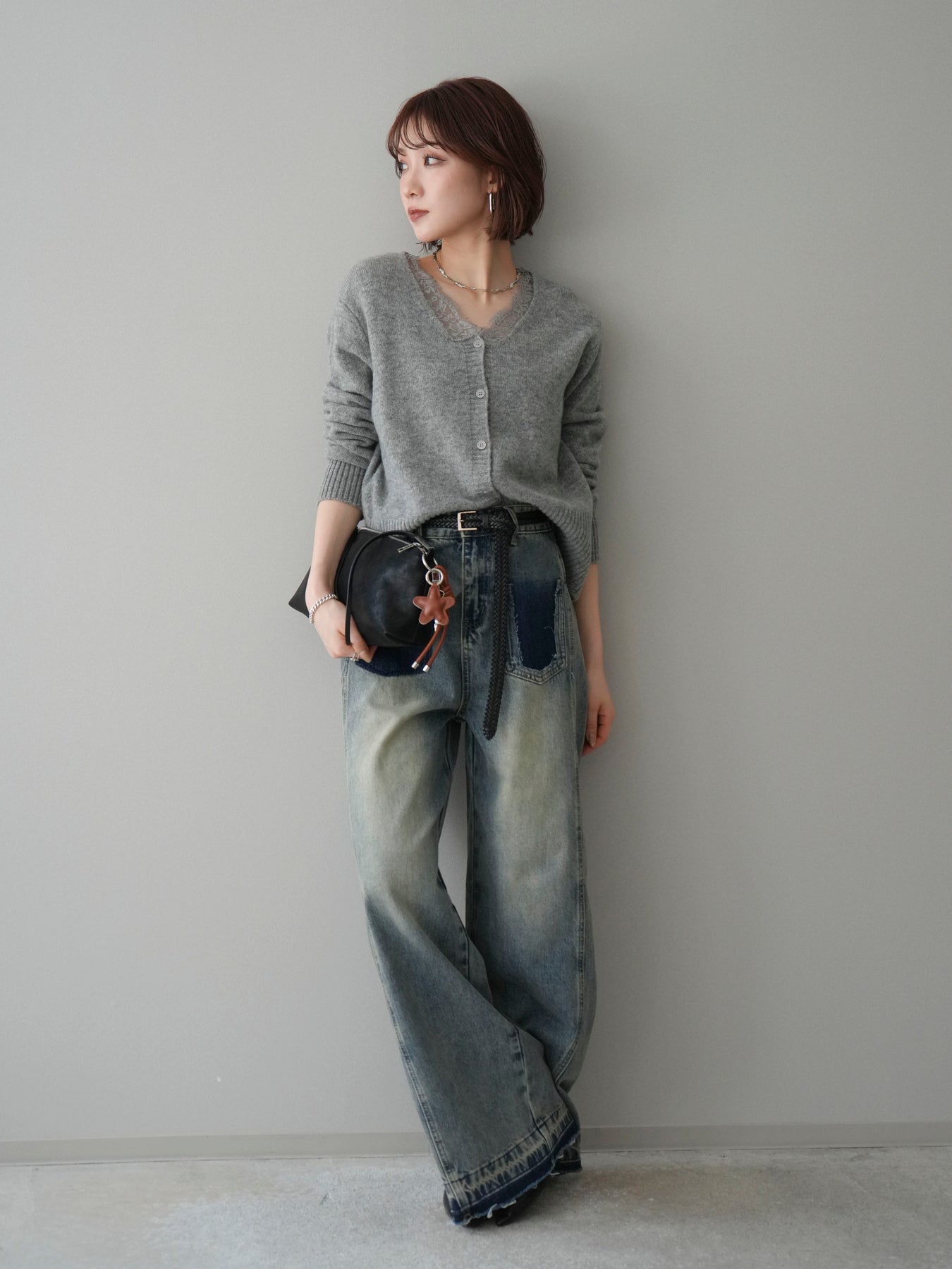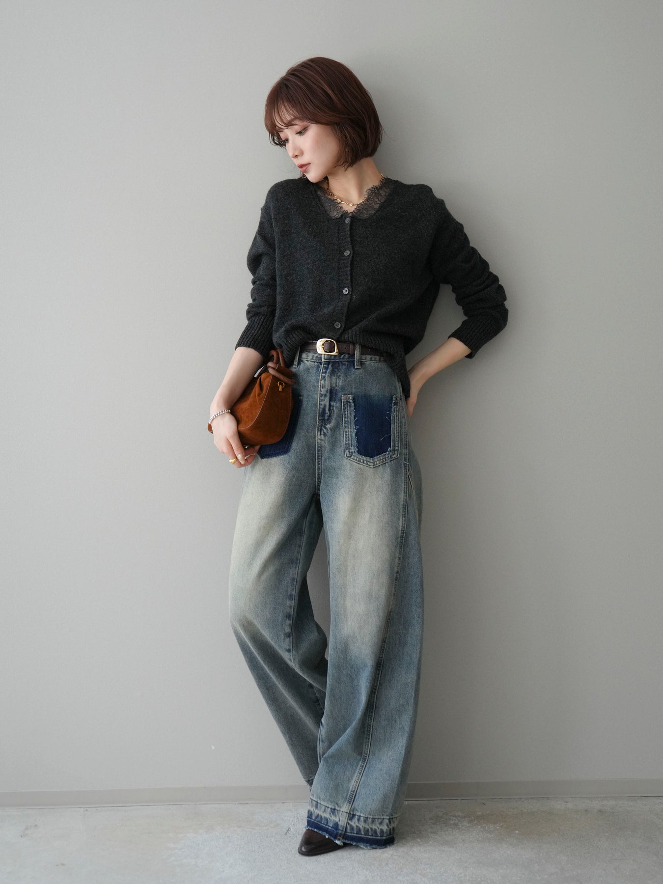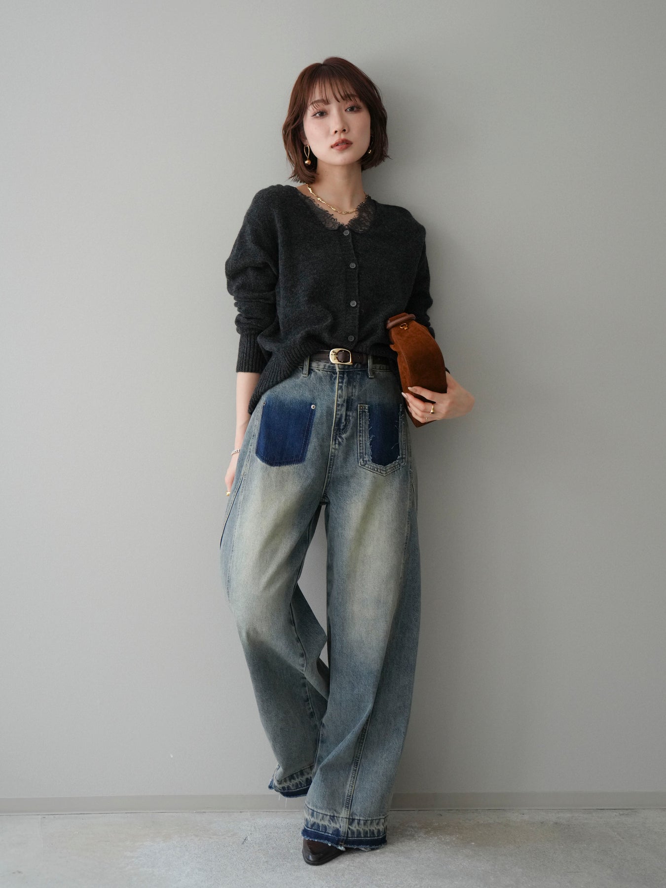 程よい存在感を放つ、染めデザインが印象的なデニムパンツ。 ベーシックなデニムに奥行きを与える染めの表情と、さりげなく効かせたポケットデザインが、スタイリングに自然なアクセントを添えてくれます。シンプルながらも一歩差がつく仕上がりで、取り入れるだけで着こなしに深みが生まれます。 シルエットは程よくゆとりを持たせつつ、落ち感を意識したバランス設計。脚のラインを拾いすぎず、リラックス感がありながらもすっきりとした印象で着用いただけます。トップスをインしてもアウトでも様になり、デザインポケットがスタイリングのポイントに。 ニットやカットソー、シャツなど幅広いアイテムと相性が良く、シーズンを通して活躍する一本。デイリーに取り入れやすく、ワードローブに加えておきたい予約アイテムです。 ※ボトムス、キャミソール(インナー)以外の商品は一律でインナーは付属していません。