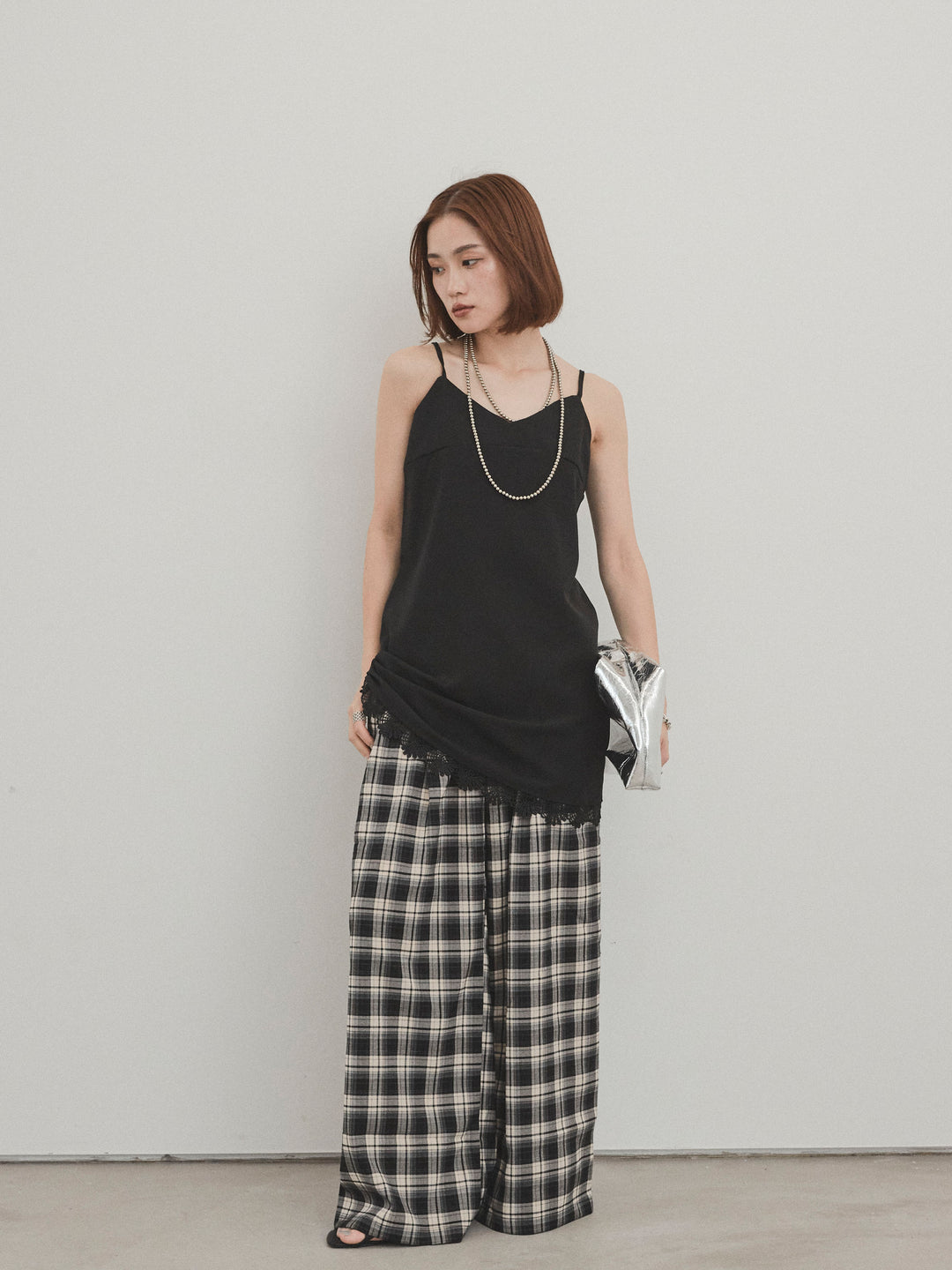 [SET] 蕾絲下擺吊帶迷你洋裝 + 格紋寬褲 (2 件套)