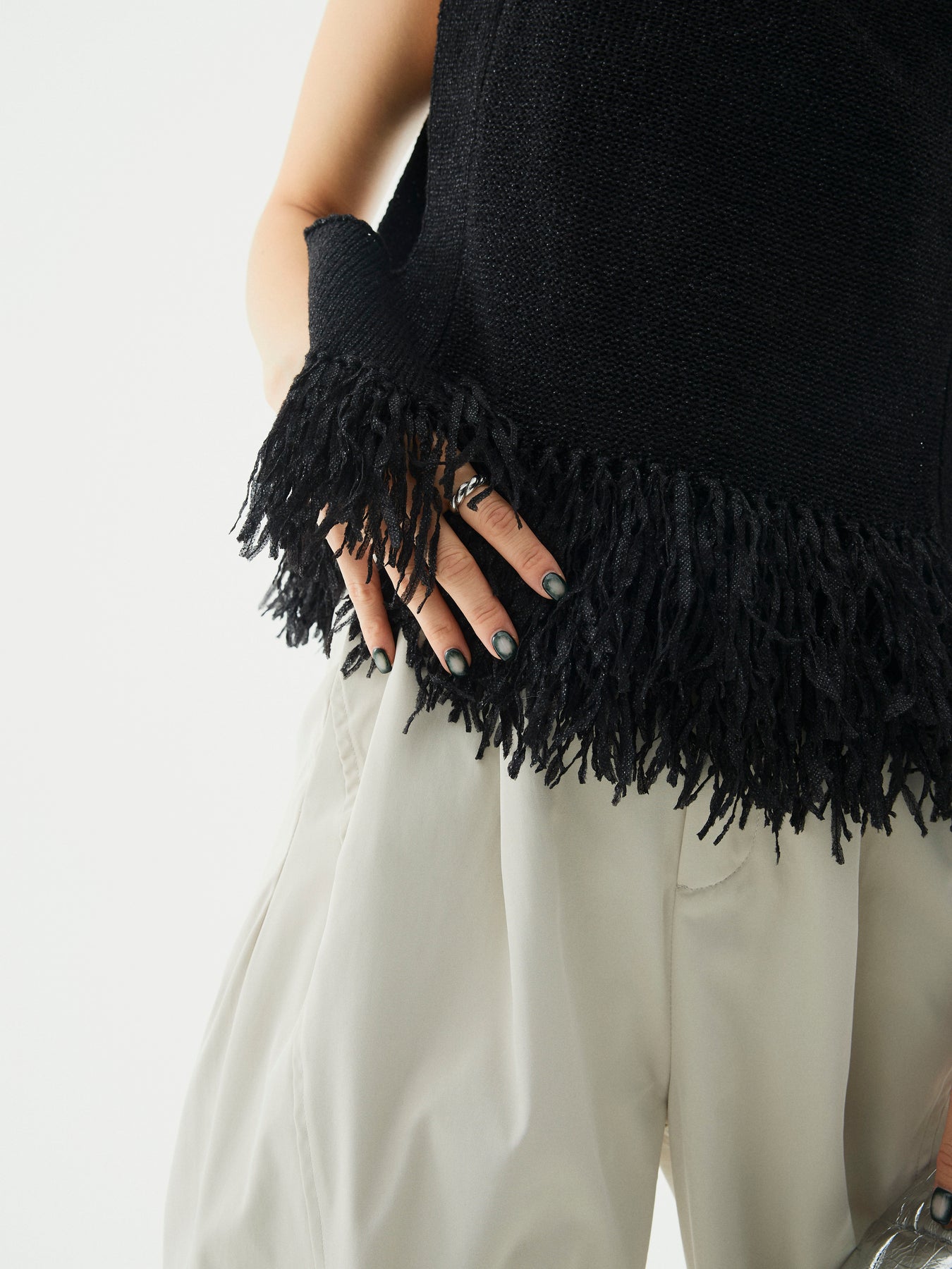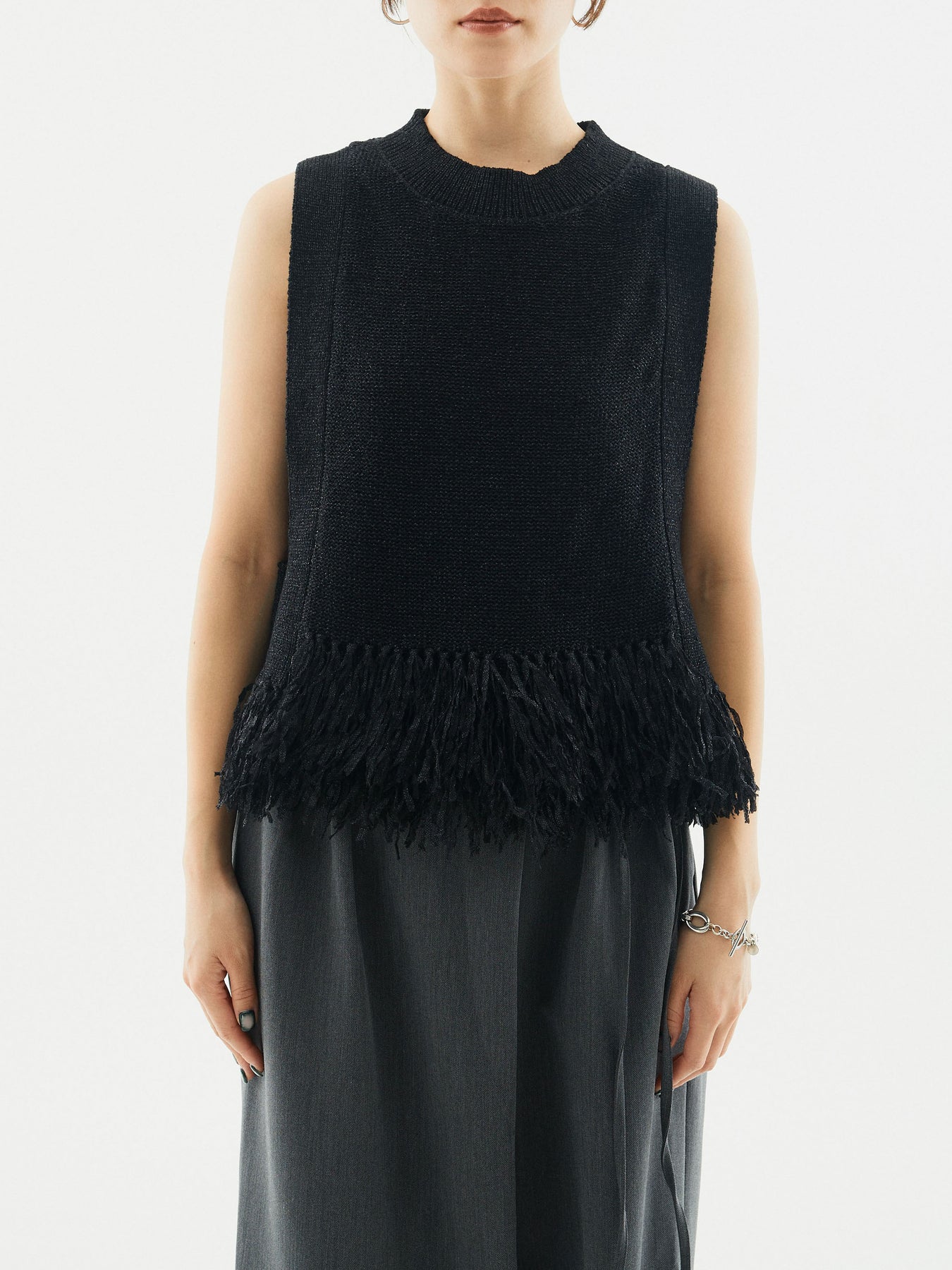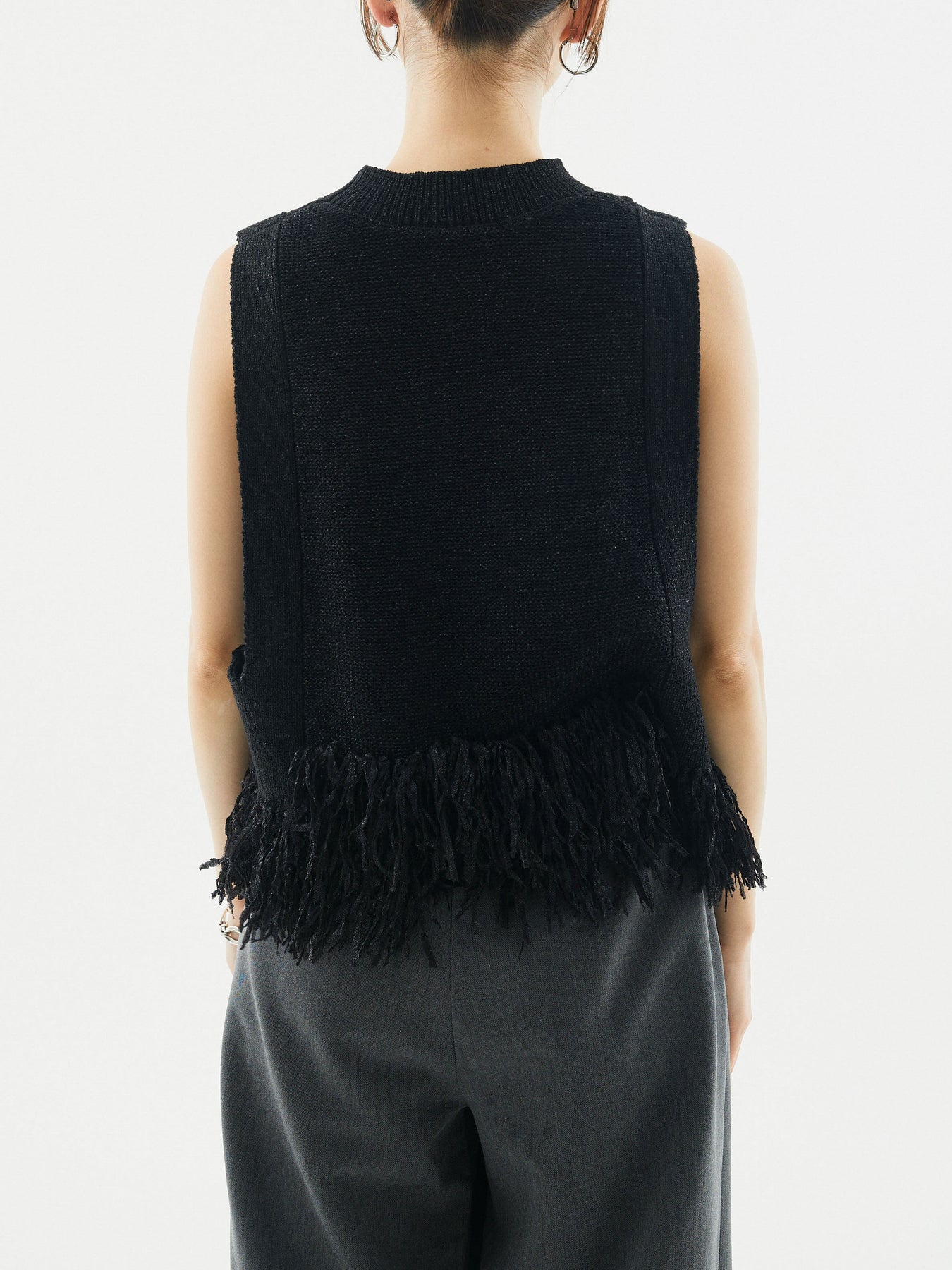 柔らかな毛足のフェザーヤーンを裾にあしらったニットベスト。表情豊かな編地と立体感のあるシルエットがスタイリングに奥行きを与え、シンプルながらも主役になる1着。Tシャツやシアートップスに重ねるだけで感度の高い着こなしに仕上がります。
