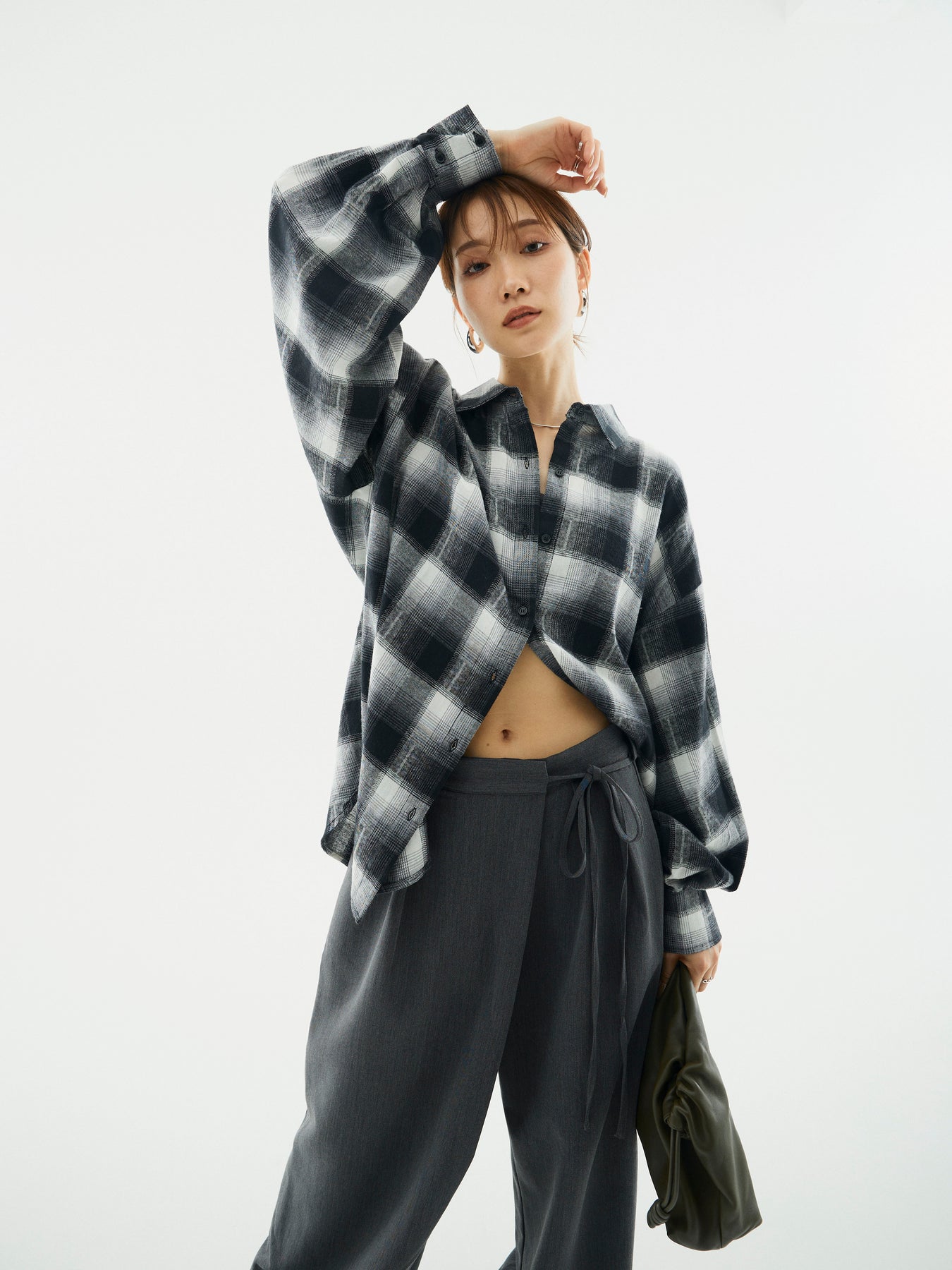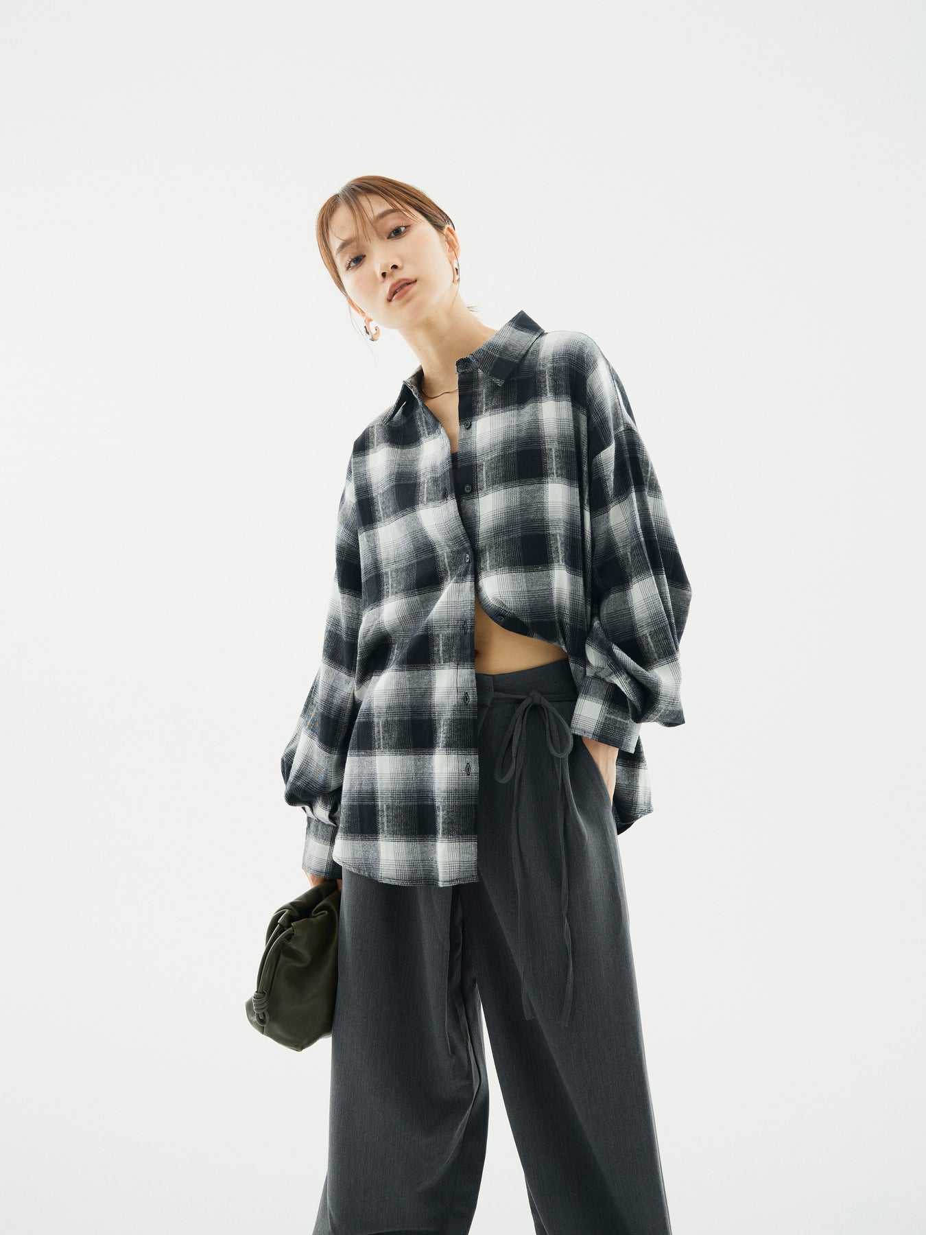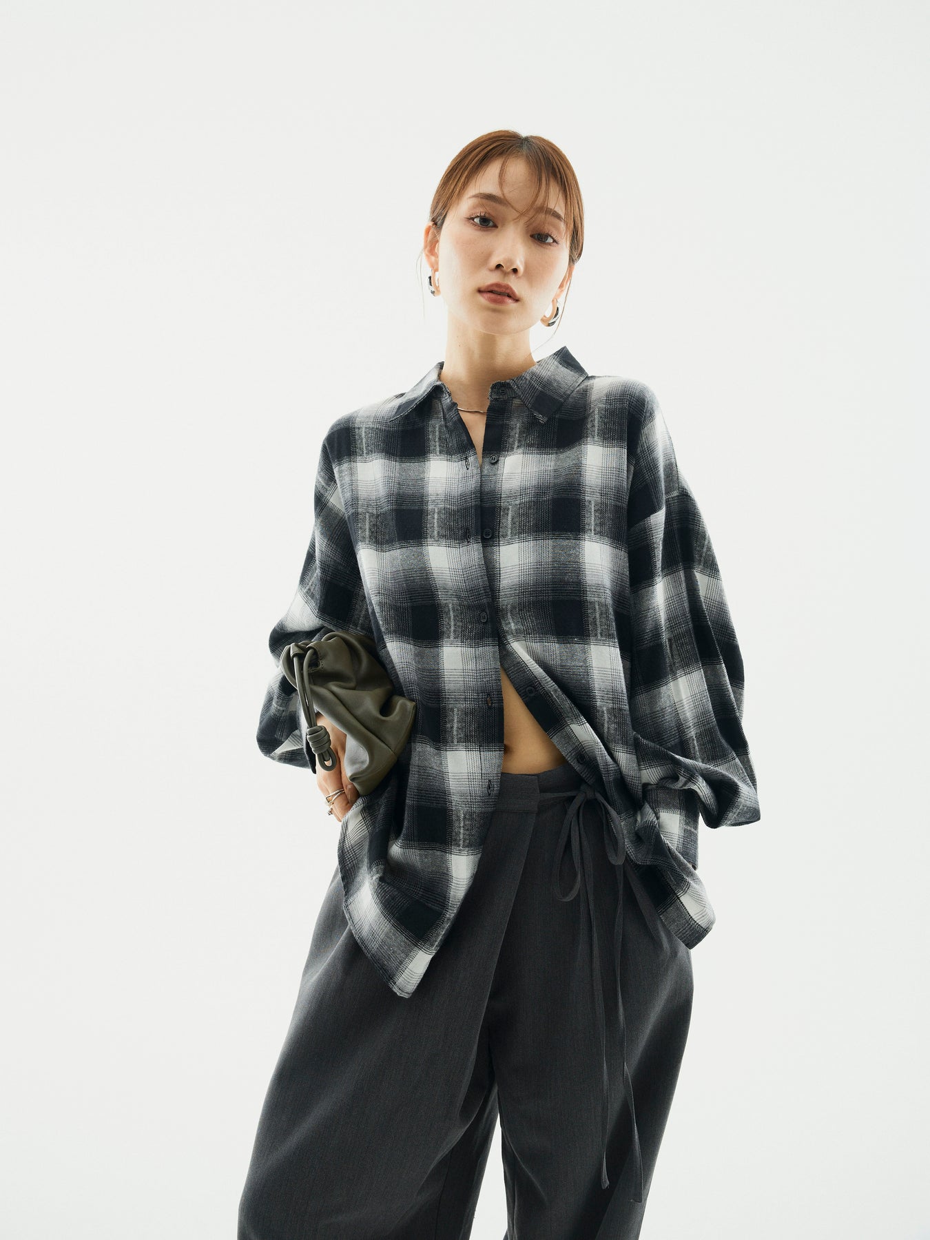 柔らかなオンブレチェック柄が目を惹くゆったりとしたオーバーシャツ。ボリューム袖とドロップショルダーでラフさを演出しつつ、程よい丈感がバランスの取れた着こなしに。羽織としても活躍し、シーズンを問わず着回せる万能アイテムです。