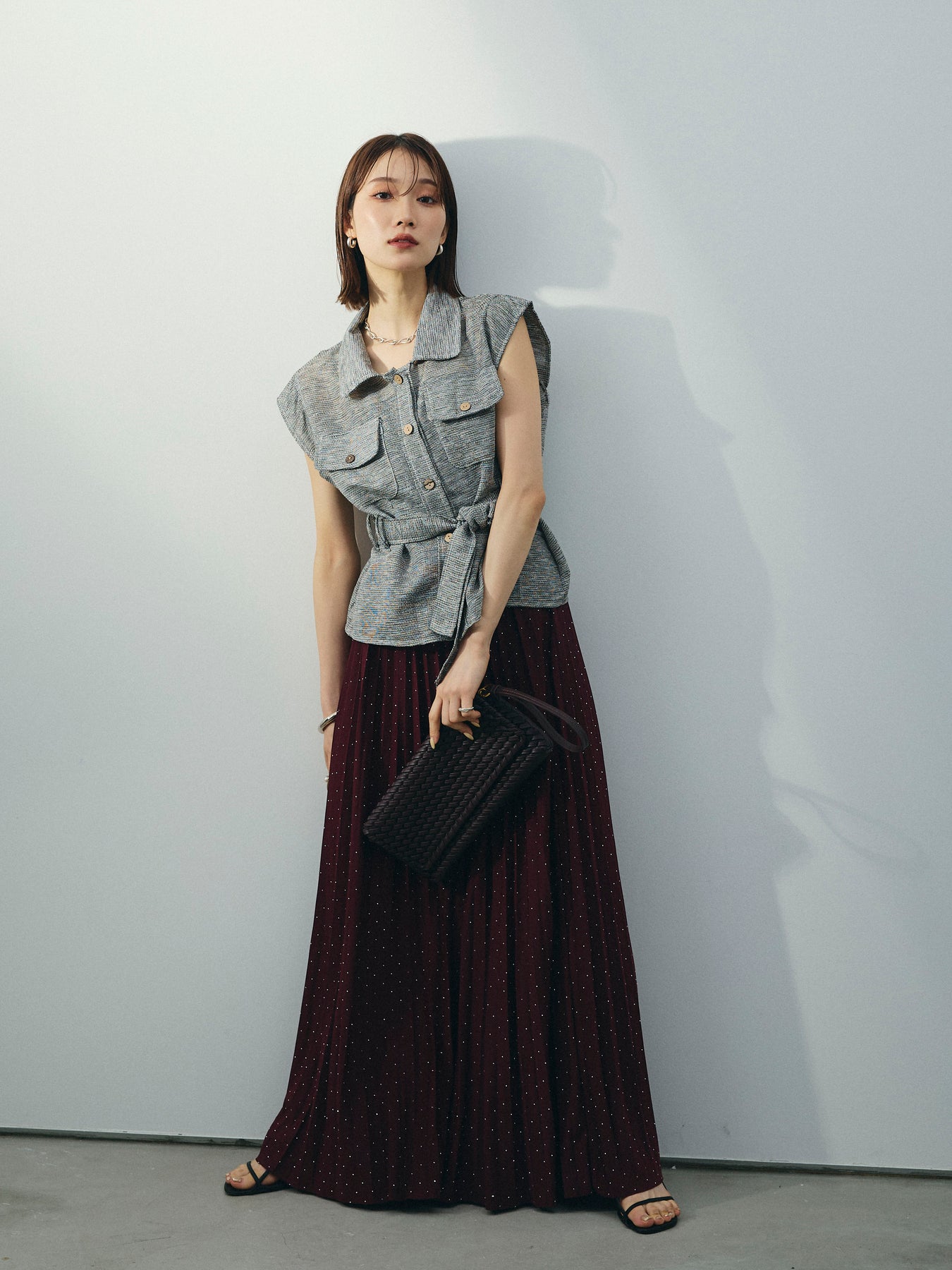 きらりと輝くラインストーンが散りばめられた、華やかさと上品さを兼ね備えたプリーツスカート。 動くたびに繊細な輝きを放ち、コーディネートにアクセントを加えてくれる主役級アイテムです。 しなやかに揺れる細やかなプリーツが美しいシルエットを生み出し、歩くだけで優雅な印象に。 ウエストはゴム仕様で、ストレスフリーな履き心地と自然なフィット感を実現します。 ニットやスウェットと合わせてカジュアルダウンさせたり、ブラウスと合わせてオケージョンスタイルにも◎ シーズンレスで着回せる、ワードローブに加えたい一着です。 カラーはベーシックからアクセントカラーまで豊富にラインナップ。気分やスタイルに合わせてお選びいただけます。