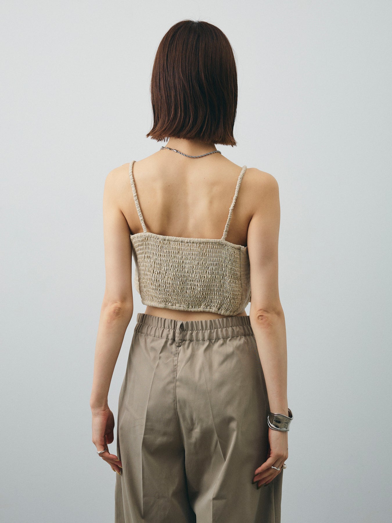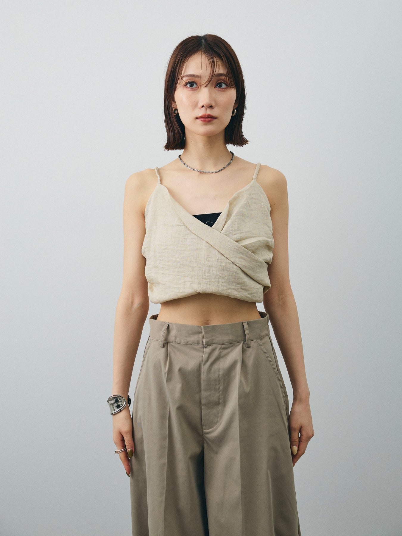 ナチュラルな風合いが魅力のリネンライク素材で仕立てた、カシュクールデザインのビスチェ。 柔らかな表情のクロスデザインがデコルテを美しく見せ、女性らしさを引き立てる1枚です。 後ろはシャーリング仕様でフィット感があり、ストレスフリーな着心地に。 華奢なストラップが抜け感を演出し、1枚ではもちろん、Tシャツやシアートップスとのレイヤードスタイルにも活躍します。 同素材のワイドパンツやスカートと合わせれば、統一感のあるセットアップ風コーデも楽しめます。 カジュアルにもリゾートにも映える、夏のワードローブにプラスしたいアイテムです。