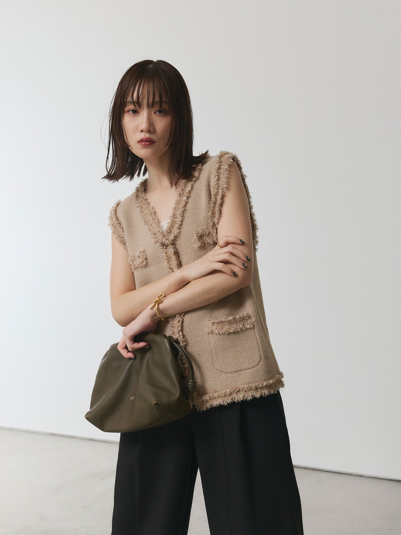 クラシカルなツイードタッチ素材を使用したフリンジニットベスト。縁取りに施されたフリンジが程よい抜け感を演出し、アンティーク調のボタンが上品さとヴィンテージライクな雰囲気を引き立てます。コンパクトな丈感でバランスが取りやすく、ワンピースに重ねてフェミニンに、パンツと合わせてマニッシュにと幅広い着こなしに対応可能。1枚プラスするだけでスタイリングを格上げしてくれる、今季の主役アイテムです。 ※ボトムス、キャミソール(インナー)以外の商品は一律でインナーは付属していません。