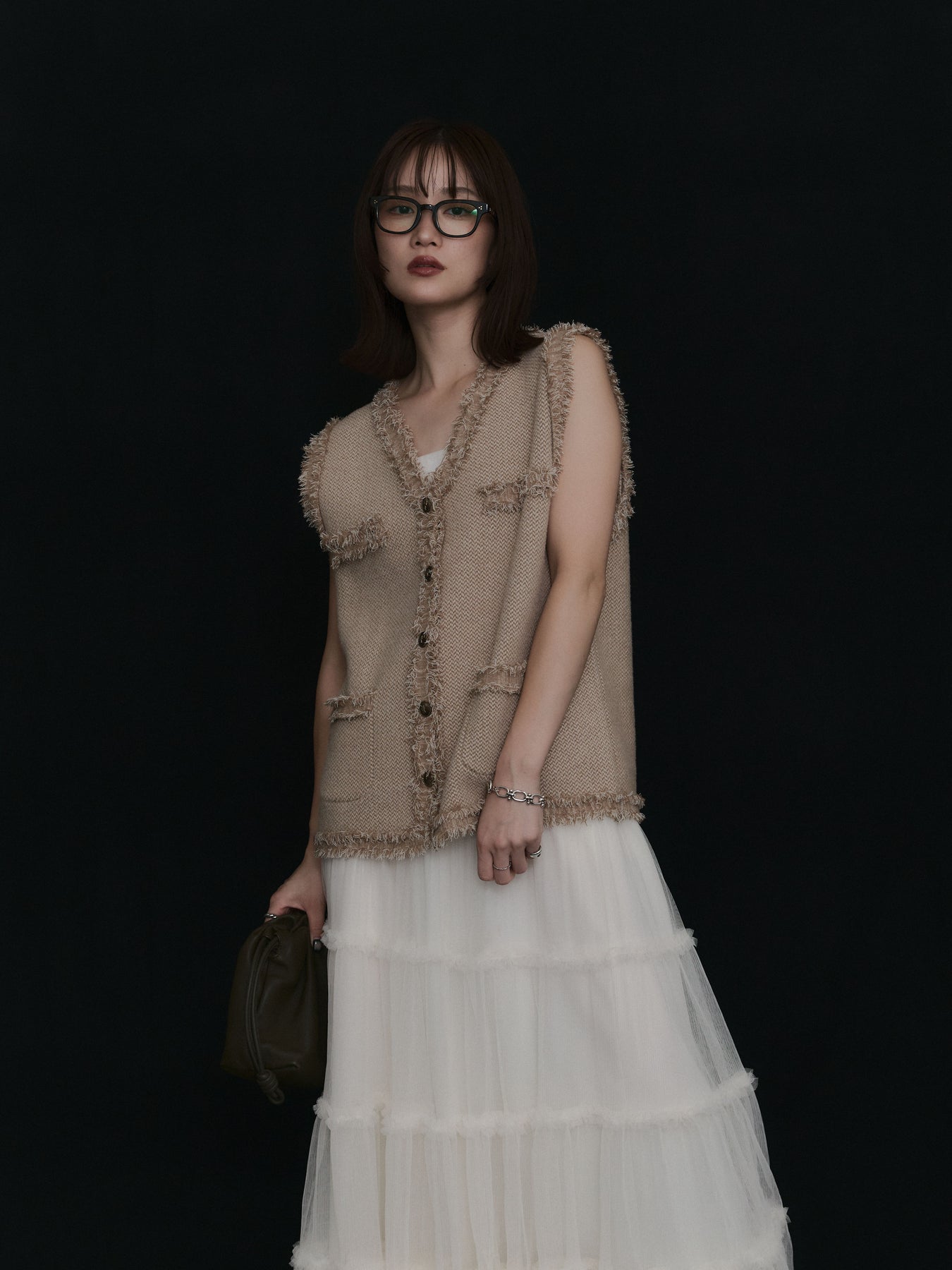 [予約]アンティークボタンツイードフリンジニットベスト/ベージュ
