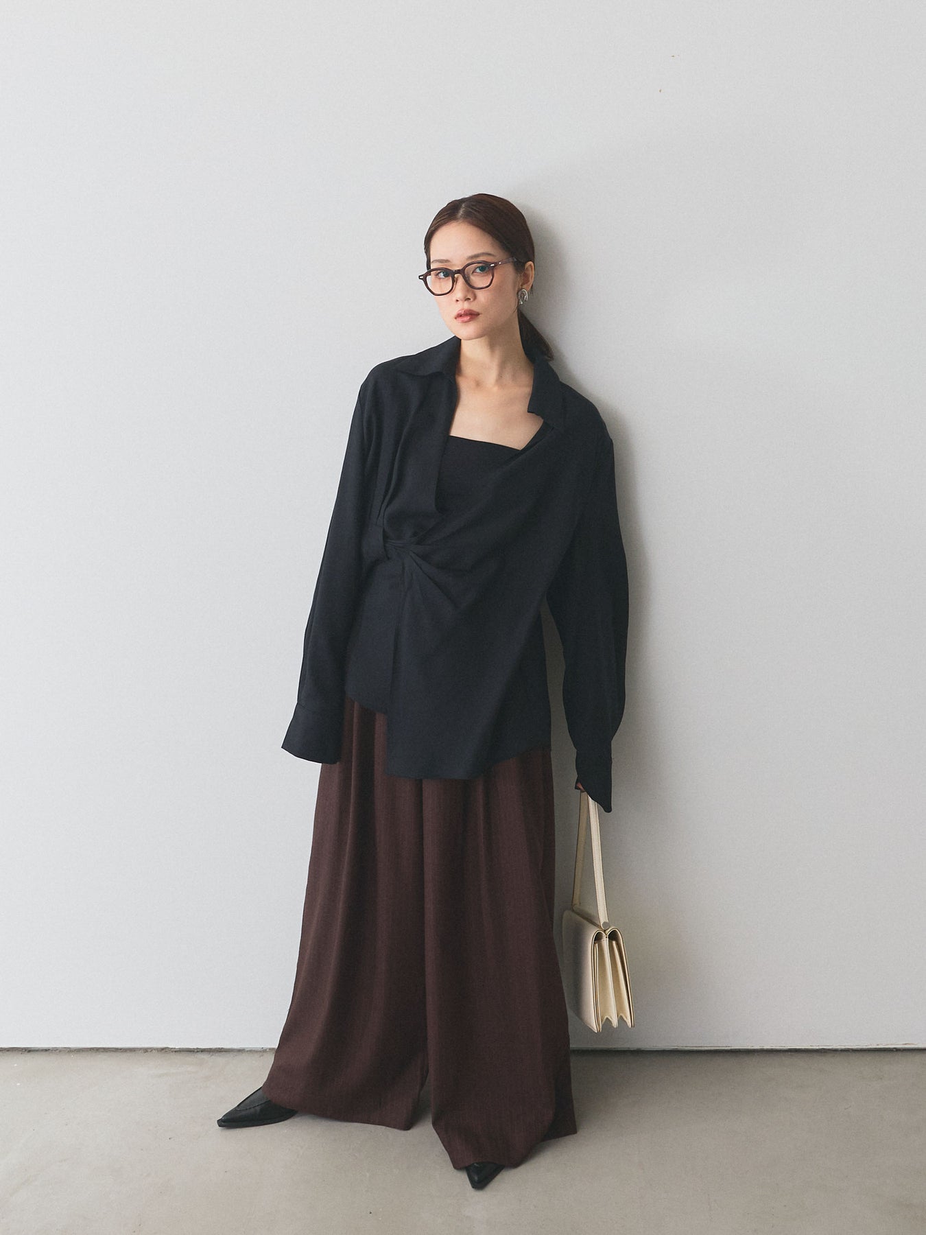 フロントに施したドレープがエレガントな印象を与えるデザインシャツ。シンプルなシャツスタイルに立体感をプラスし、一枚で洗練されたスタイリングが完成します。さらりとした生地感で着心地も良く、ジャケットのインナーとしても存在感を発揮。オフィスからデイリーまで幅広く活躍する、ワードローブに加えたい一枚です。 ※ボトムス、キャミソール(インナー)以外の商品は一律でインナーは付属していません。