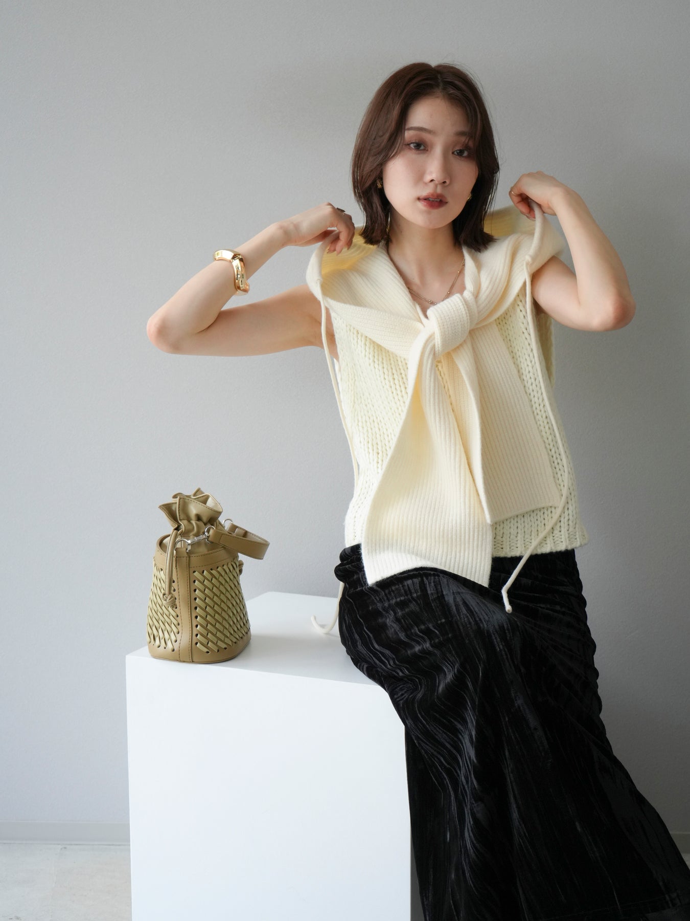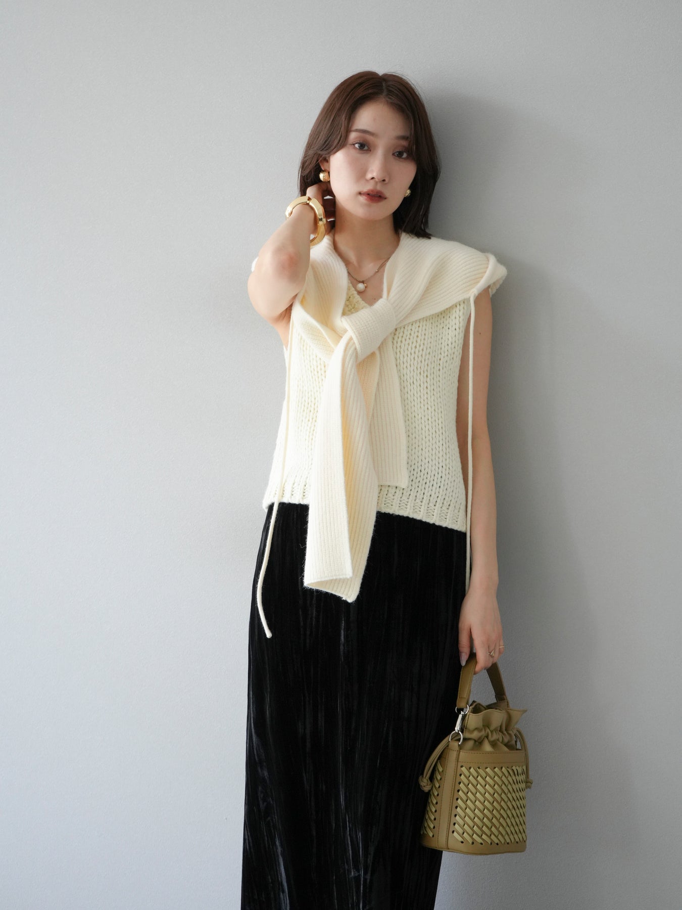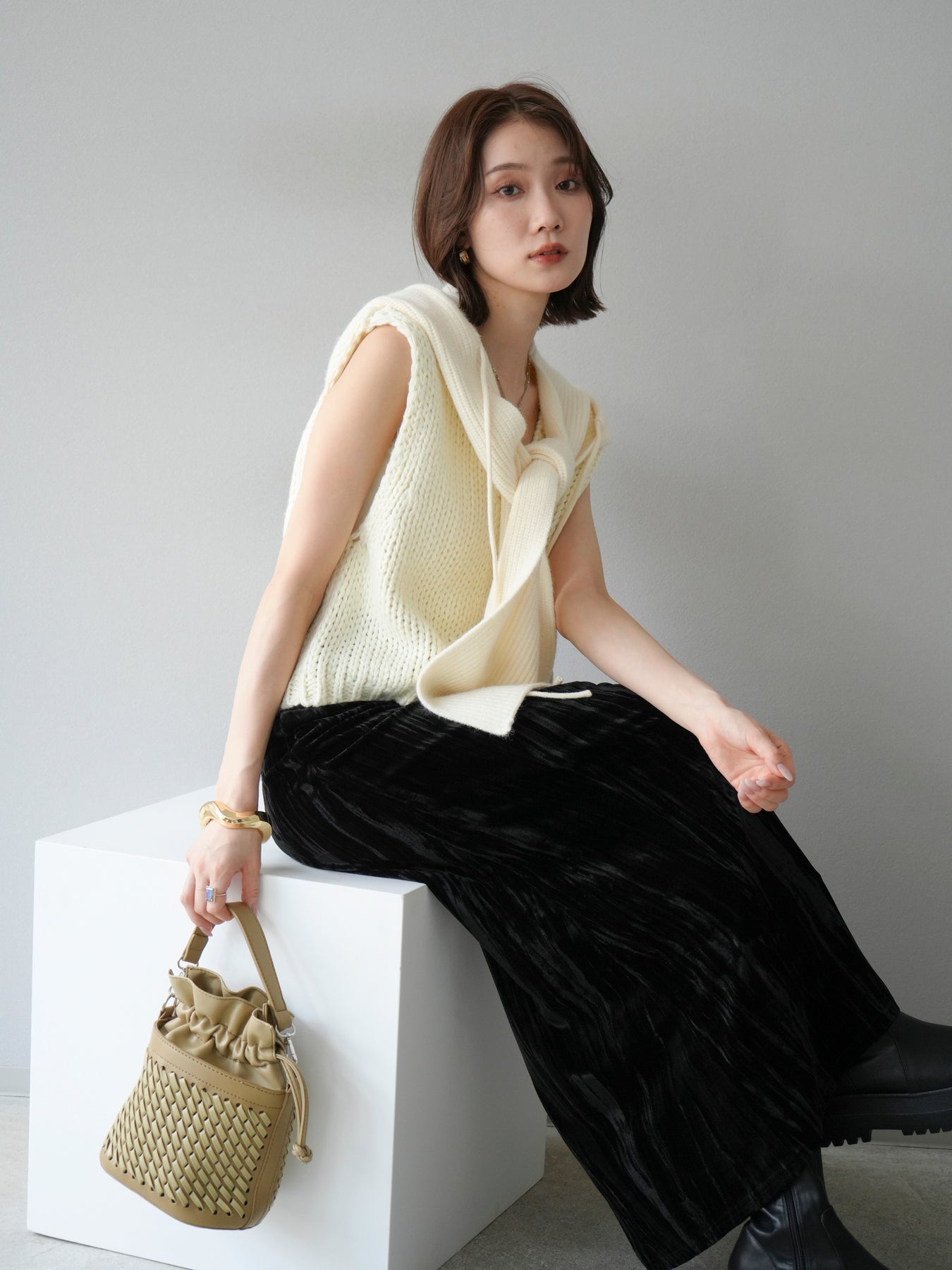 ・お手入れ方法:手洗い水温30℃以下、おしゃれ着用液体洗剤または中性洗剤のご使用をお薦めします。素材の特性上、洗濯の際に色落ち・縮みが生じる恐れがありますので単独で・短時間でのお洗濯をお薦めします。洗濯後は形を整えてから陰干ししてください。アイロンはご使用いただけません。※タンブラー乾燥は控え、色物とは分けてください。濡れたままの状態で擦れると、色落ち色移りすることがあります。つけ置き洗いや雨や汗で濡れたまま放置は避け、速やかに処理してください。着用中の摩擦や汗、水濡れ、濃淡差があるものとの重ね着にご注意ください。また、素材の特性上伸びやすい為ハンガーの使用はお控えいただき畳んで保管ください。