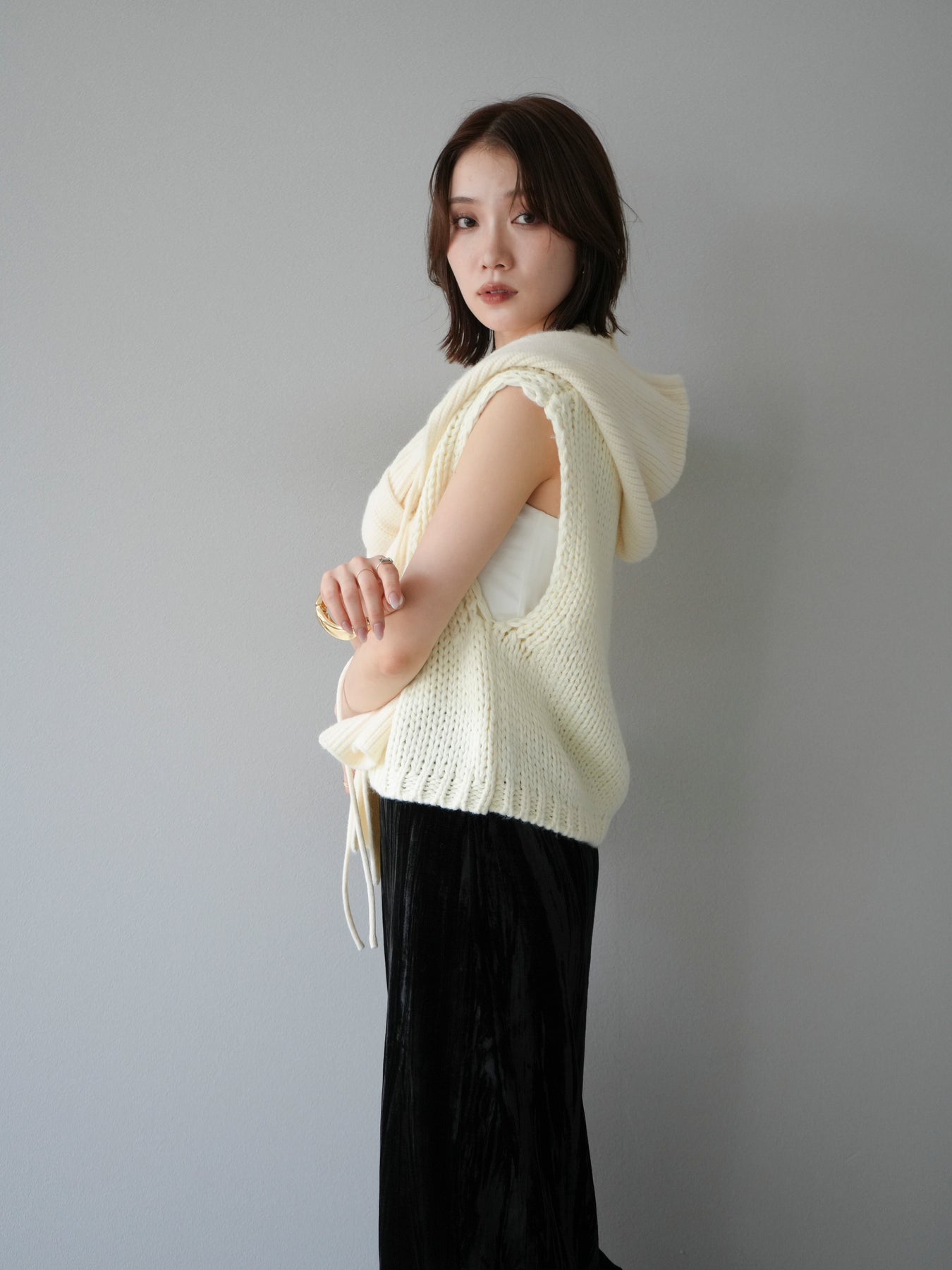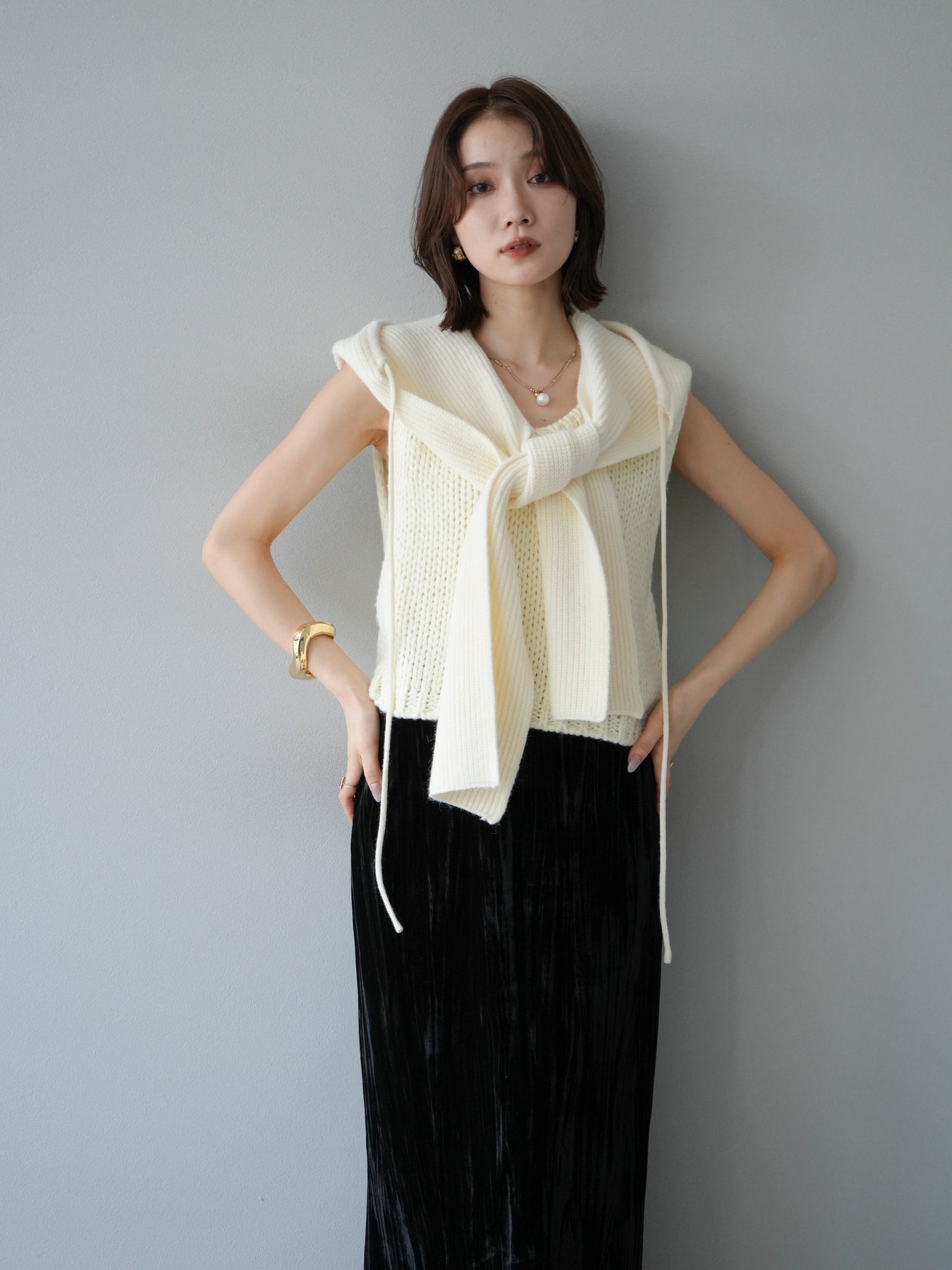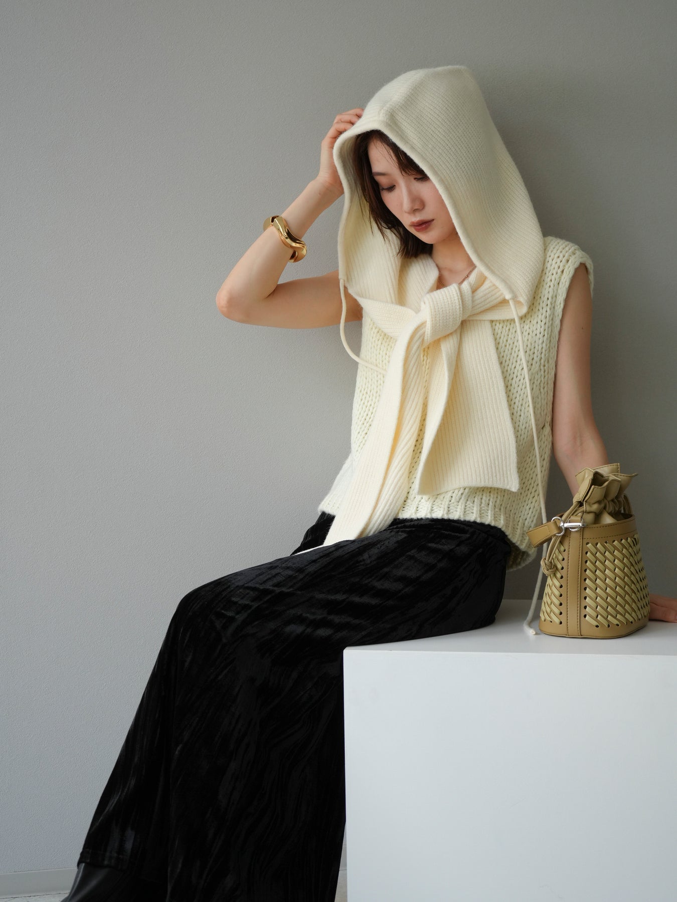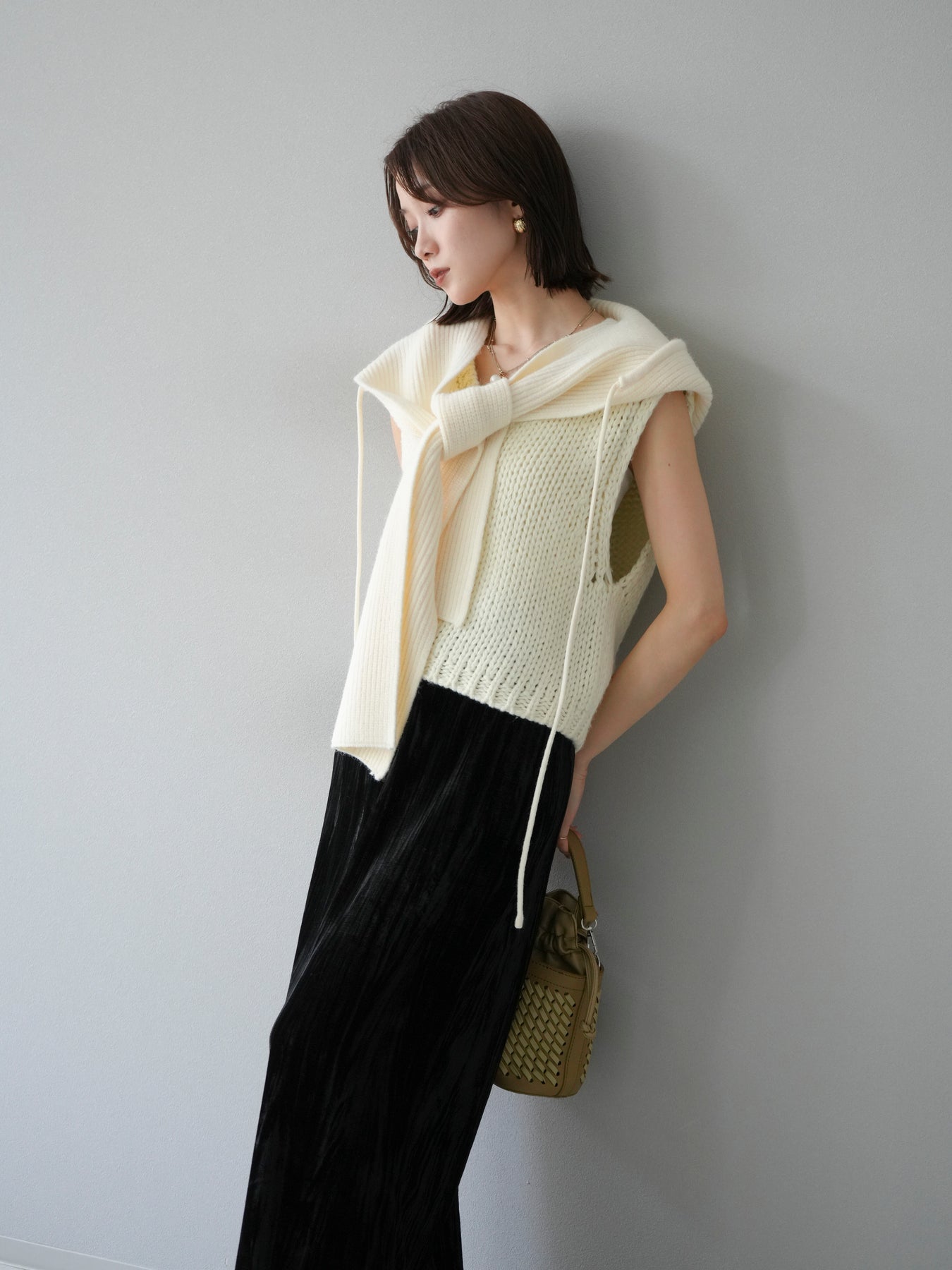 ・お手入れ方法:手洗い水温30℃以下、おしゃれ着用液体洗剤または中性洗剤のご使用をお薦めします。素材の特性上、洗濯の際に色落ち・縮みが生じる恐れがありますので単独で・短時間でのお洗濯をお薦めします。洗濯後は形を整えてから陰干ししてください。アイロンはご使用いただけません。※タンブラー乾燥は控え、色物とは分けてください。濡れたままの状態で擦れると、色落ち色移りすることがあります。つけ置き洗いや雨や汗で濡れたまま放置は避け、速やかに処理してください。着用中の摩擦や汗、水濡れ、濃淡差があるものとの重ね着にご注意ください。また、素材の特性上伸びやすい為ハンガーの使用はお控えいただき畳んで保管ください。