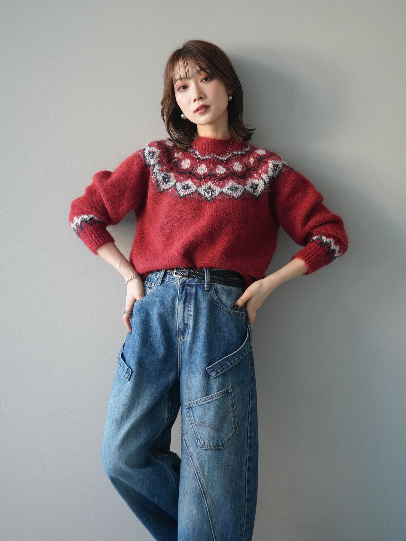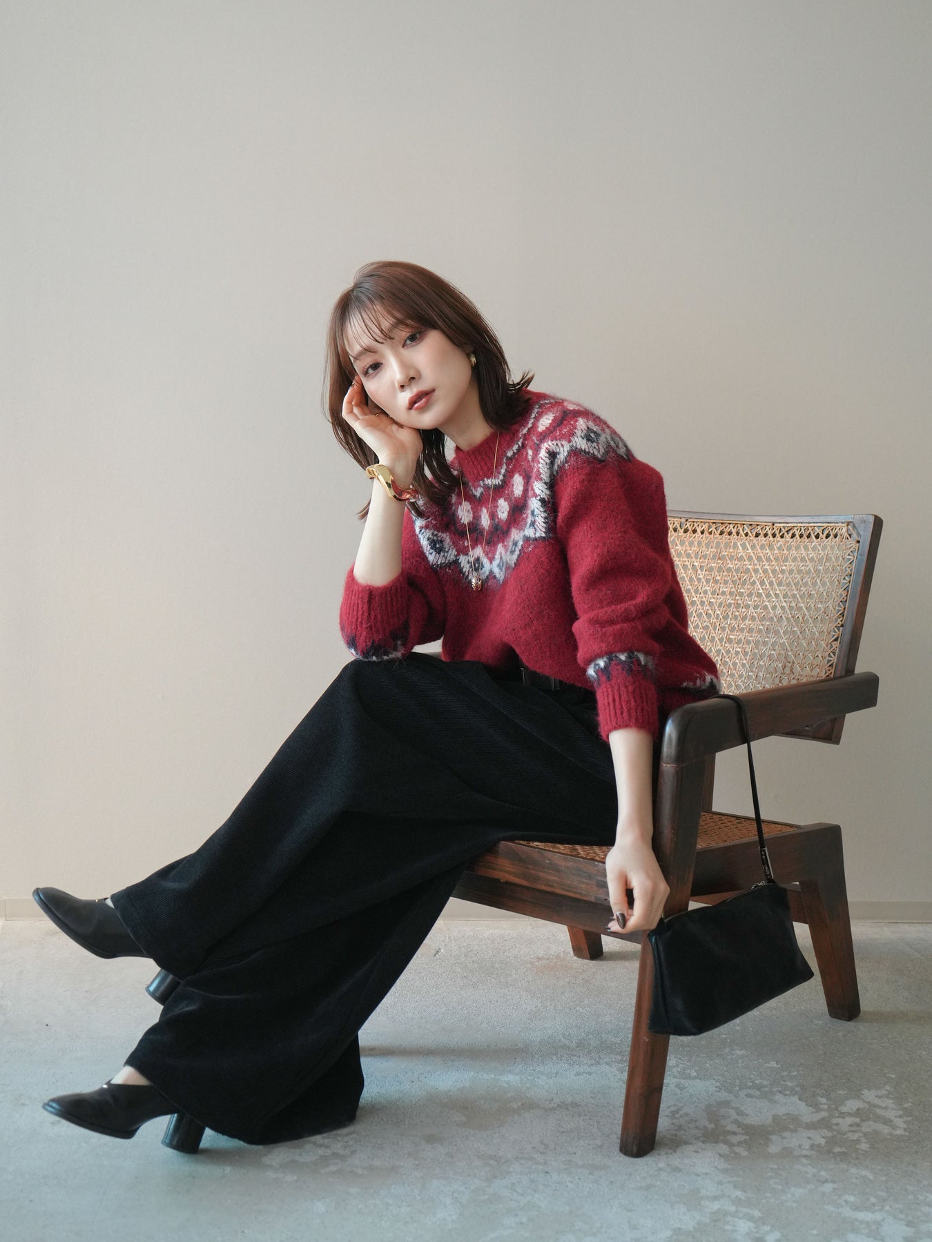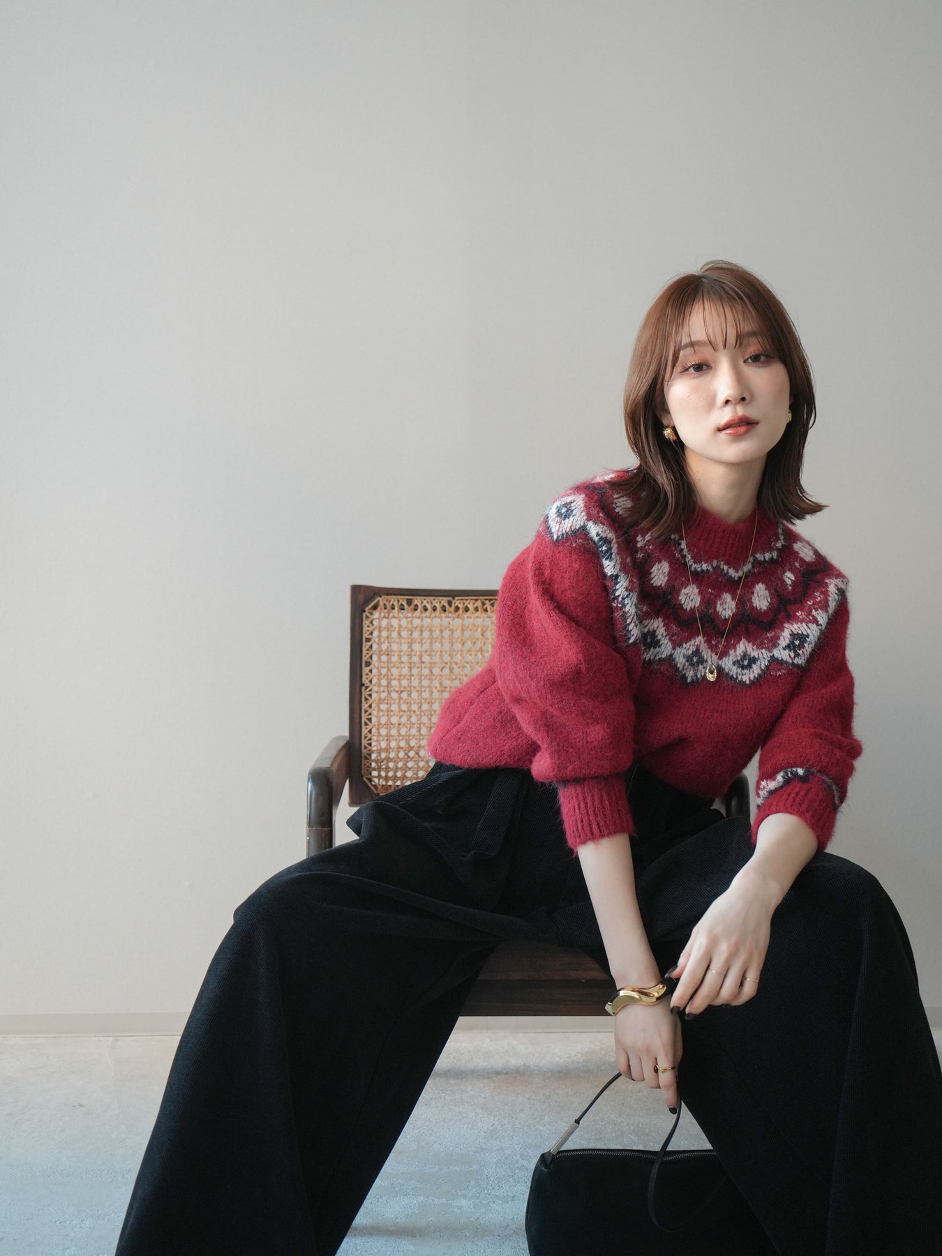 柔らかく起毛したソフトタッチ素材で仕立てた、求心柄が印象的なニットプルオーバー。首元から放射状に広がる柄が視線を上に集め、バランスよく見せてくれるデザインです。ふんわりとした風合いがシーズンムードを高めつつ、ややゆとりのあるシルエットがリラックス感のある着心地を実現。デニムやスカートなどどんなボトムスとも相性がよく、1枚で着映えする主役級アイテムです。 ※ボトムス、キャミソール(インナー)以外の商品は一律でインナーは付属していません。