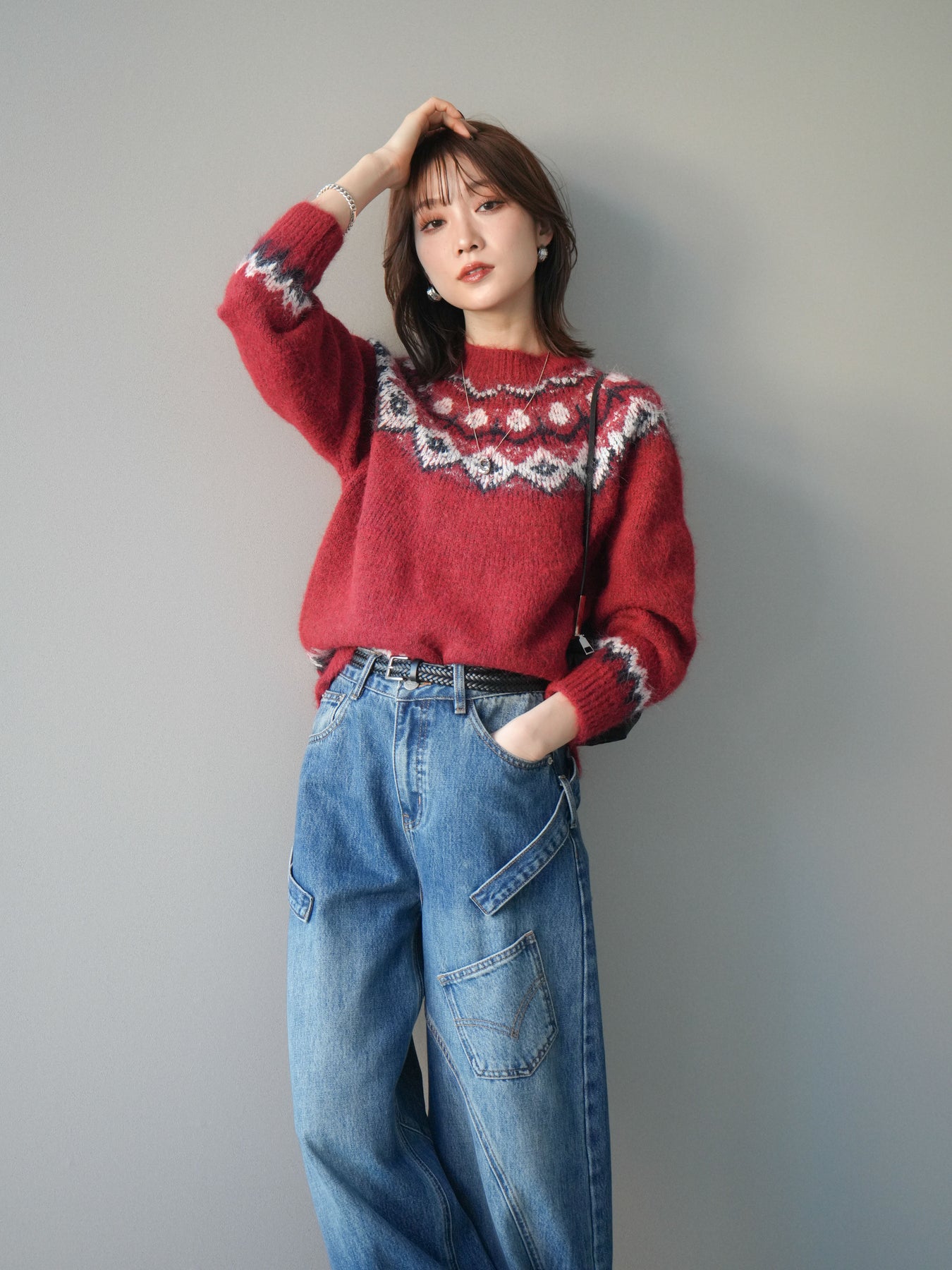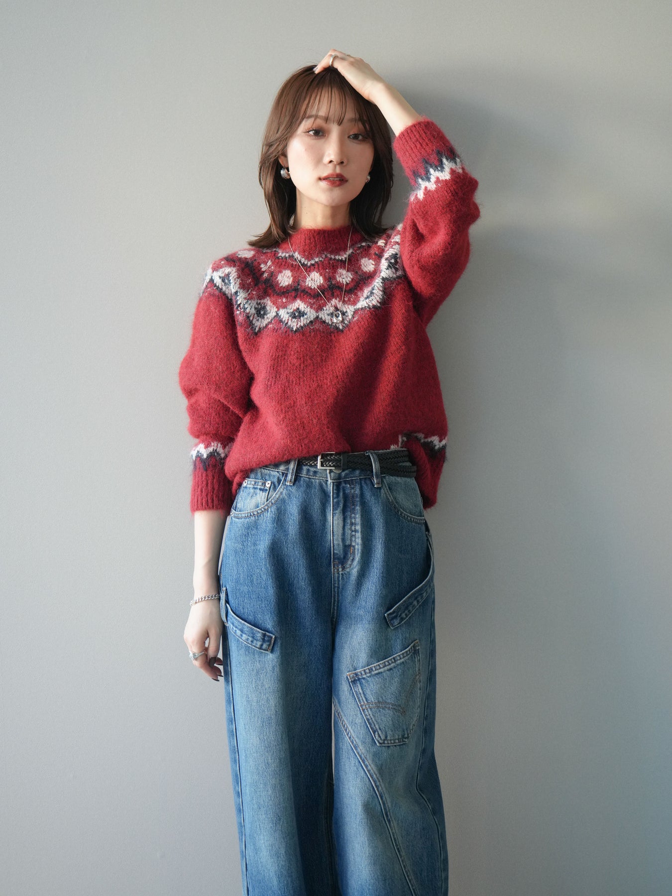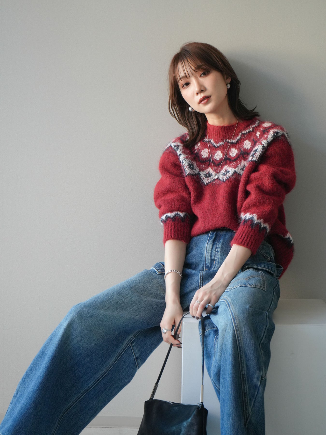 柔らかく起毛したソフトタッチ素材で仕立てた、求心柄が印象的なニットプルオーバー。首元から放射状に広がる柄が視線を上に集め、バランスよく見せてくれるデザインです。ふんわりとした風合いがシーズンムードを高めつつ、ややゆとりのあるシルエットがリラックス感のある着心地を実現。デニムやスカートなどどんなボトムスとも相性がよく、1枚で着映えする主役級アイテムです。 ※ボトムス、キャミソール(インナー)以外の商品は一律でインナーは付属していません。