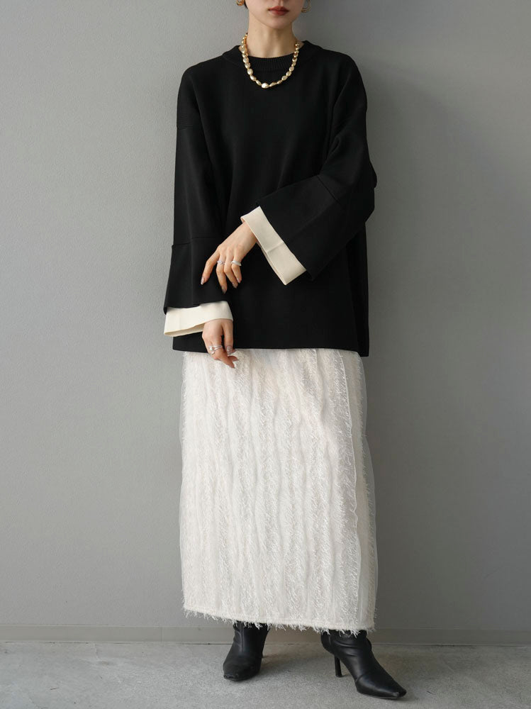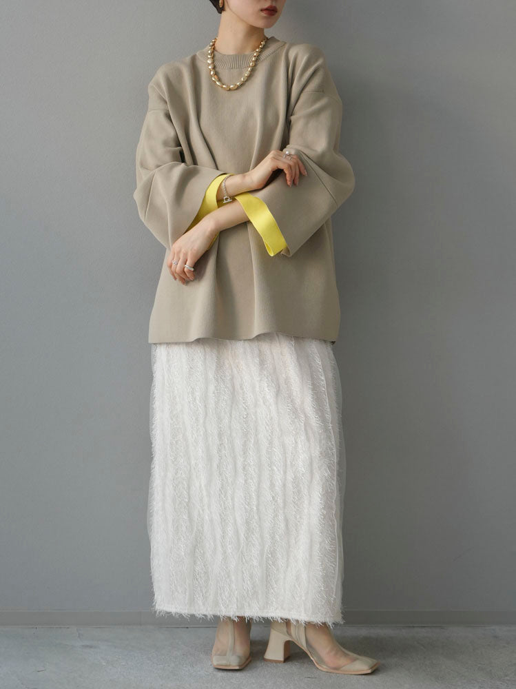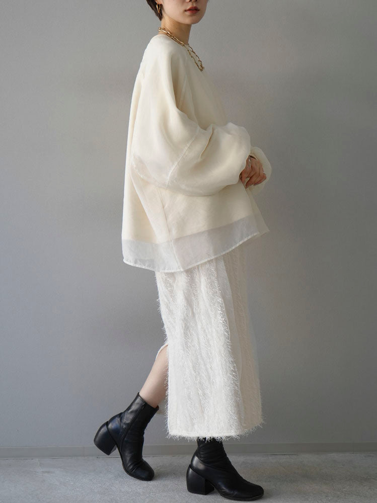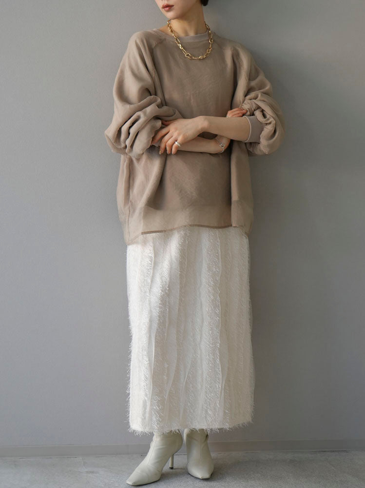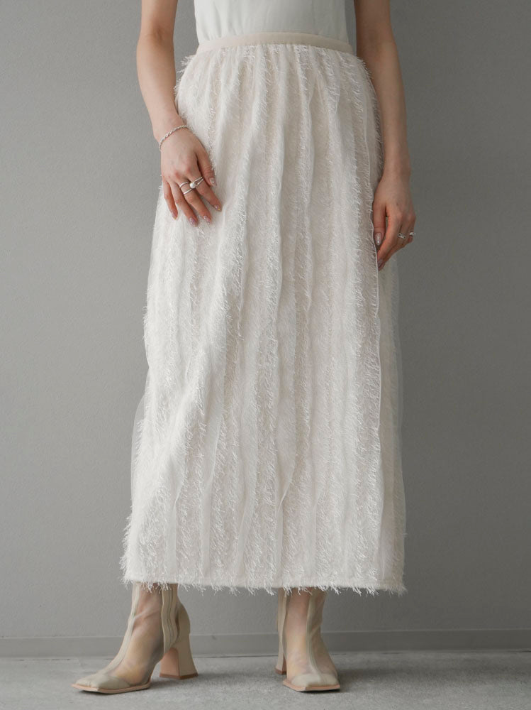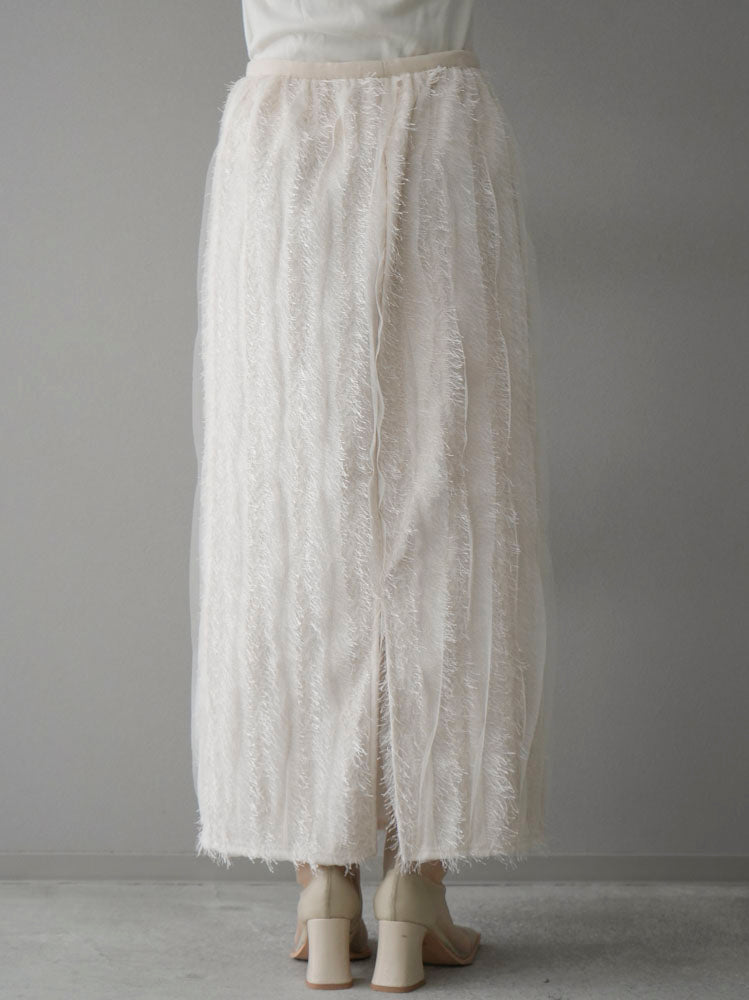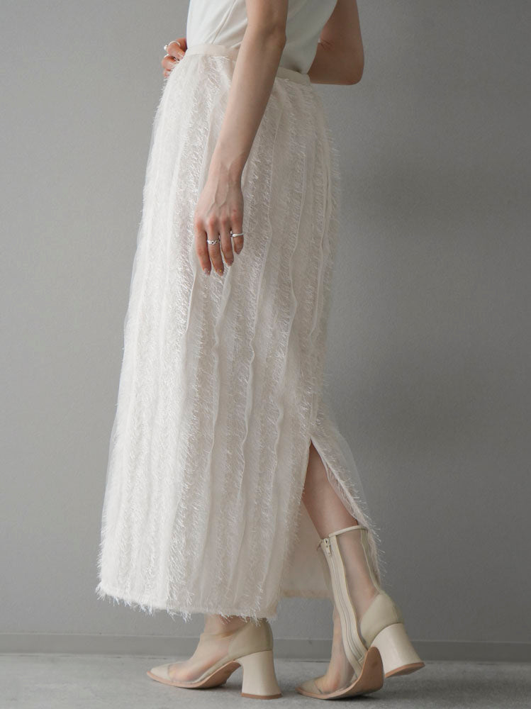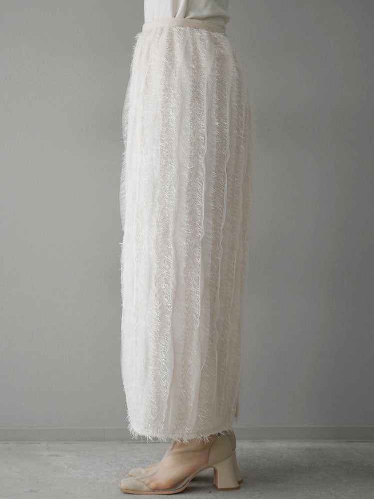 薄紗和流蘇令人印象深刻的組合長裙。材質輕盈,非常適合春季造型。腰部有鬆緊帶,輕柔貼合,垂直輪廓讓腿部線條顯得俐落。因為它有存在感,只要搭配簡單的上衣就能打造出時尚的造型。