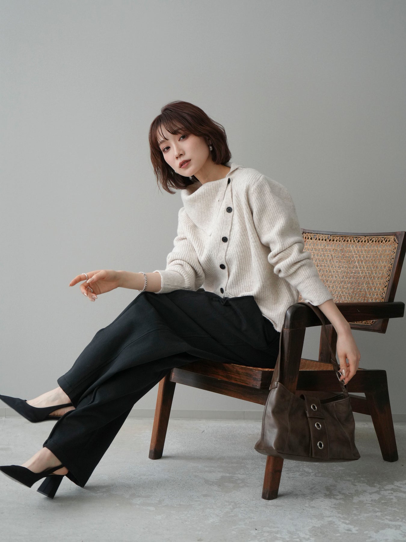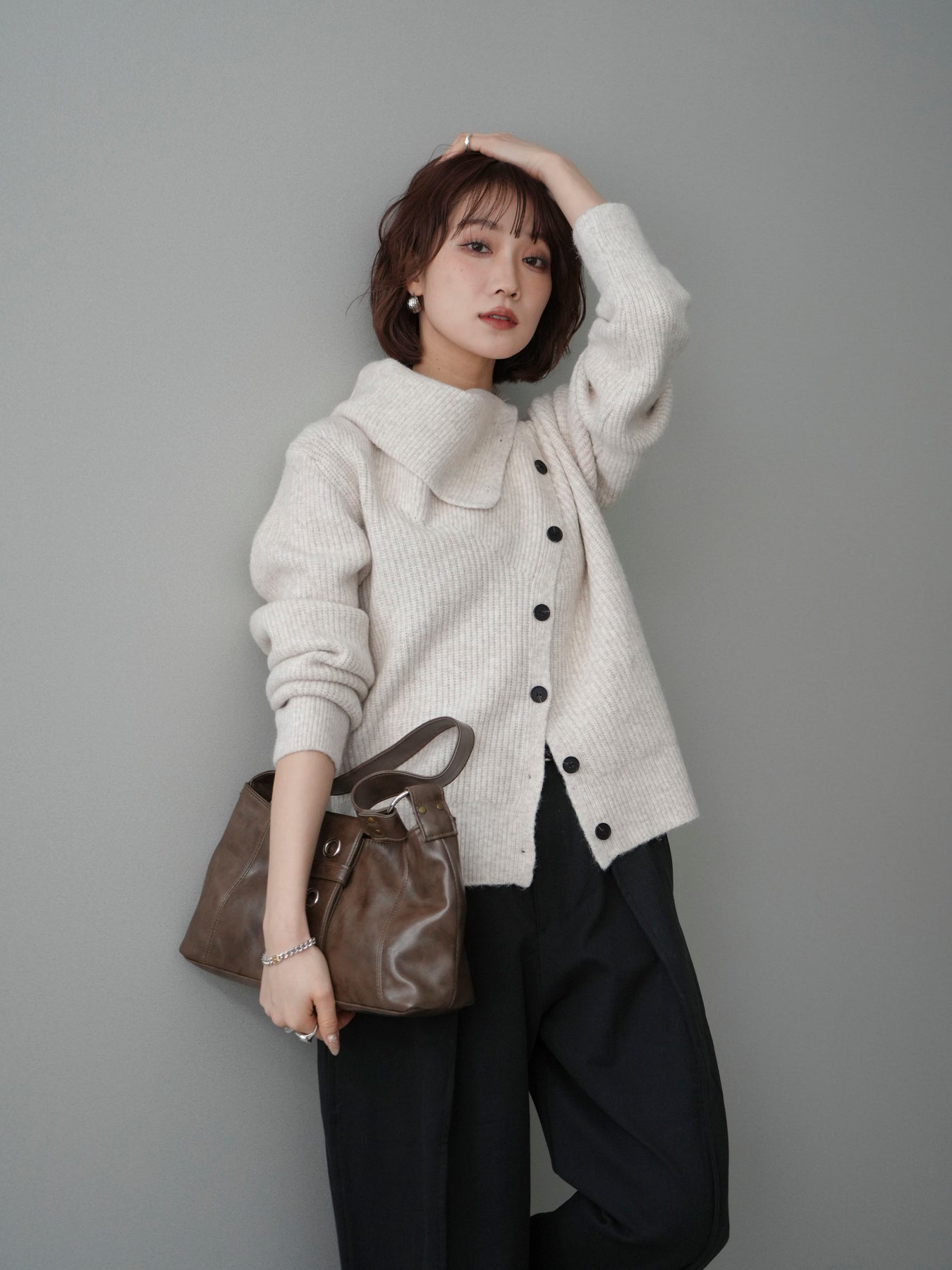 ハイネックデザインとフロントのボタンディテールが印象的なニットカーディガン。程よくゆとりのあるシルエットで、羽織としてもトップスとしても着用でき、着こなしの幅が広がります。シンプルながらも存在感があり、コーディネートの主役になる一着です。