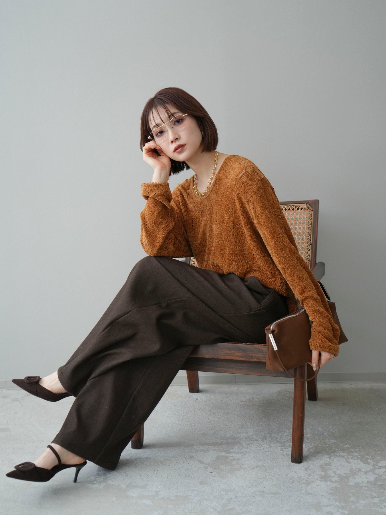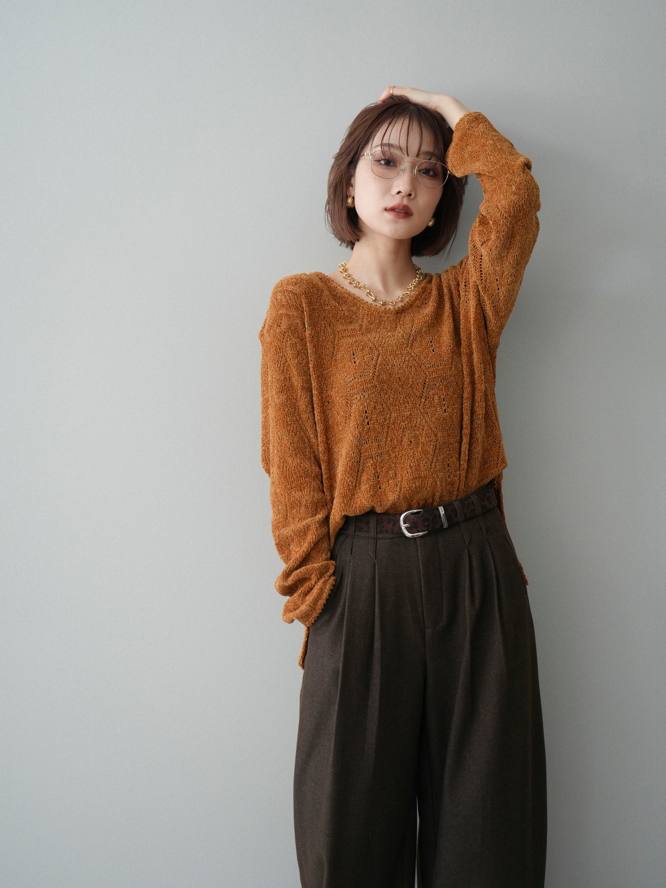 [予約]モール透かし編みニットトップス/camel