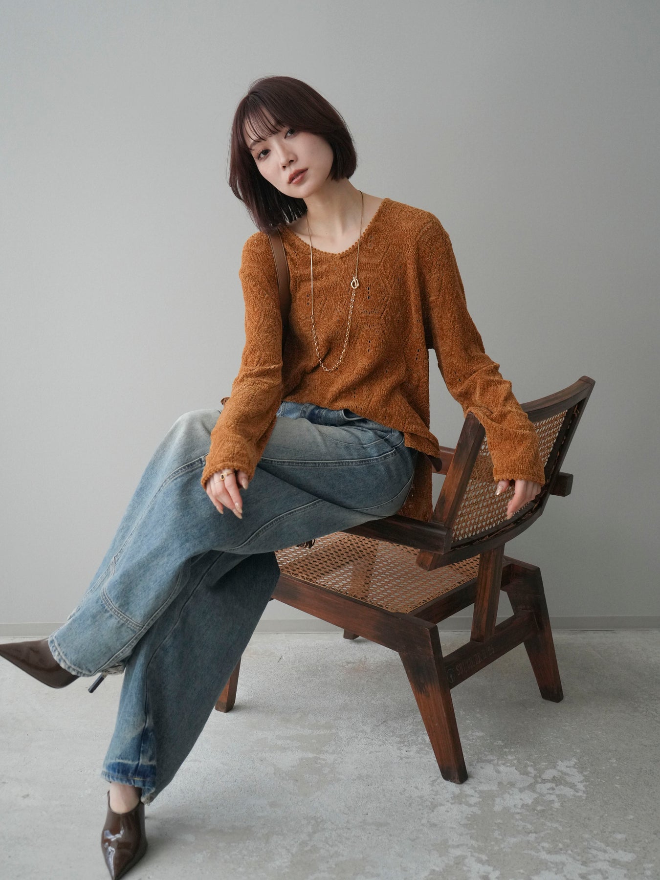 モール糸を使用した透かし編みデザインが印象的なニットトップス。程よい透け感と柔らかな風合いで、軽やかさのある着こなしが楽しめます。一枚ではもちろん、レイヤードスタイルにも取り入れやすく、季節感のあるコーディネートが完成する一着です。