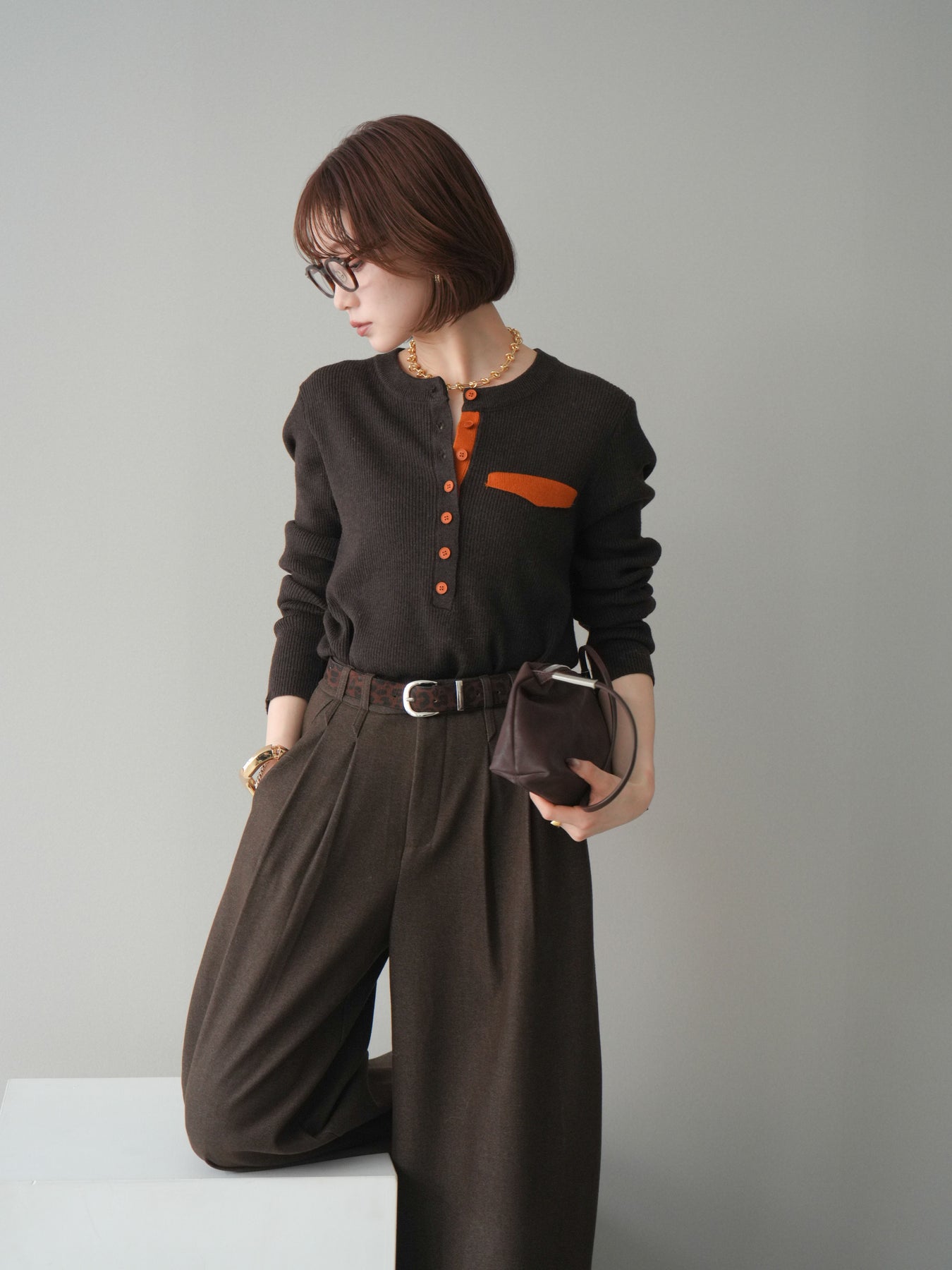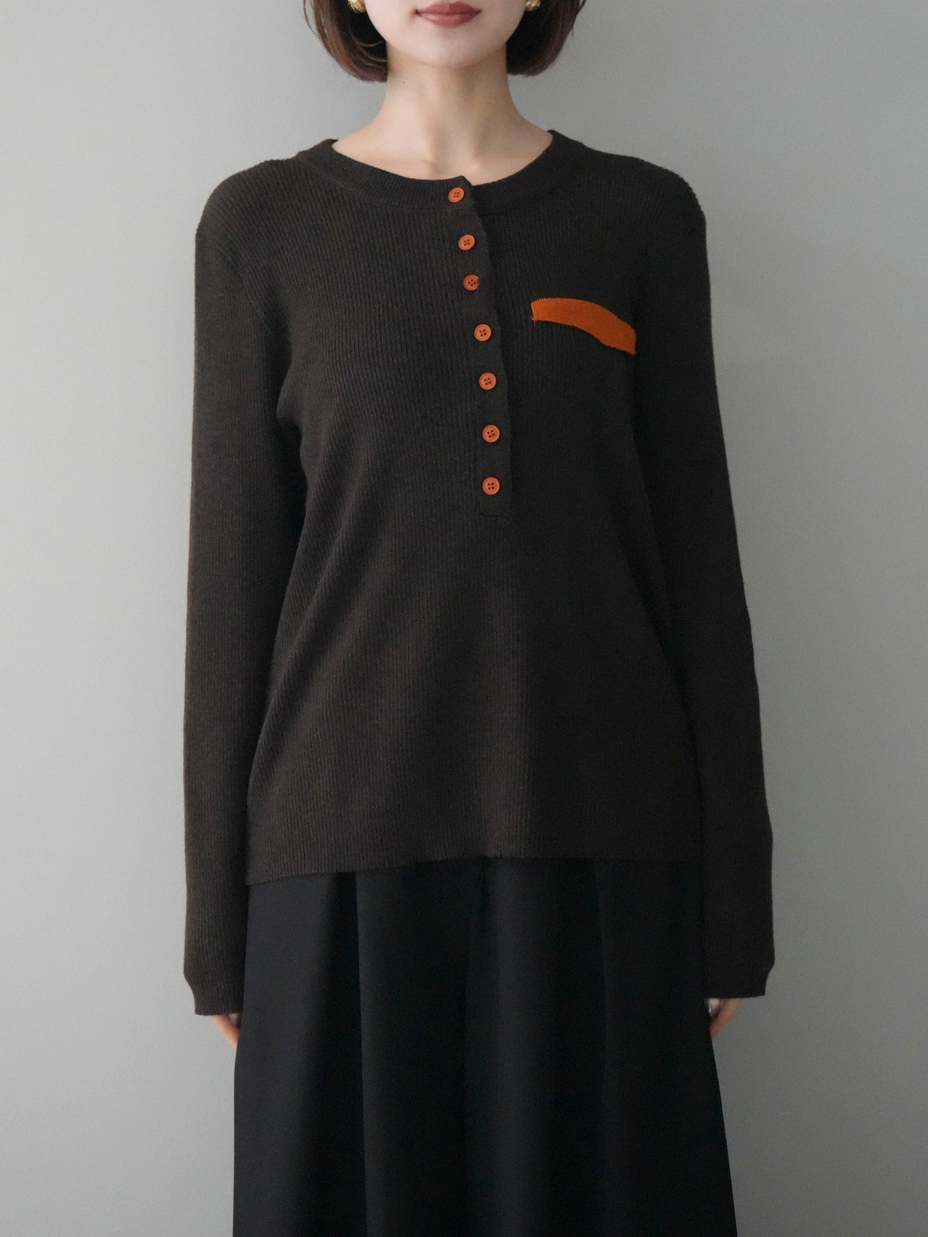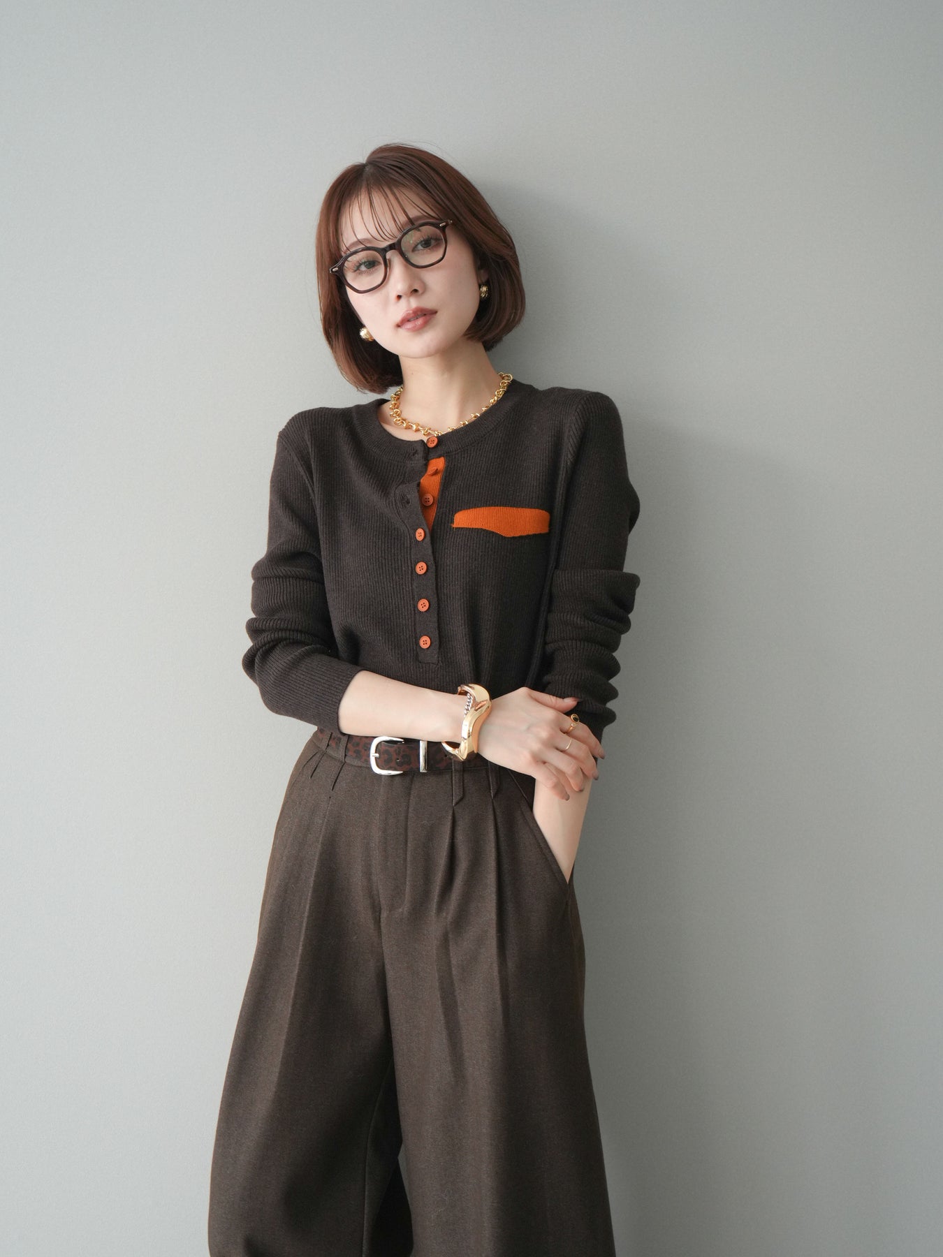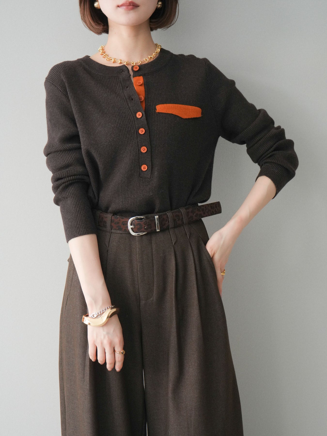 【預購】雙色拼接口袋亨利領針織衫/棕色