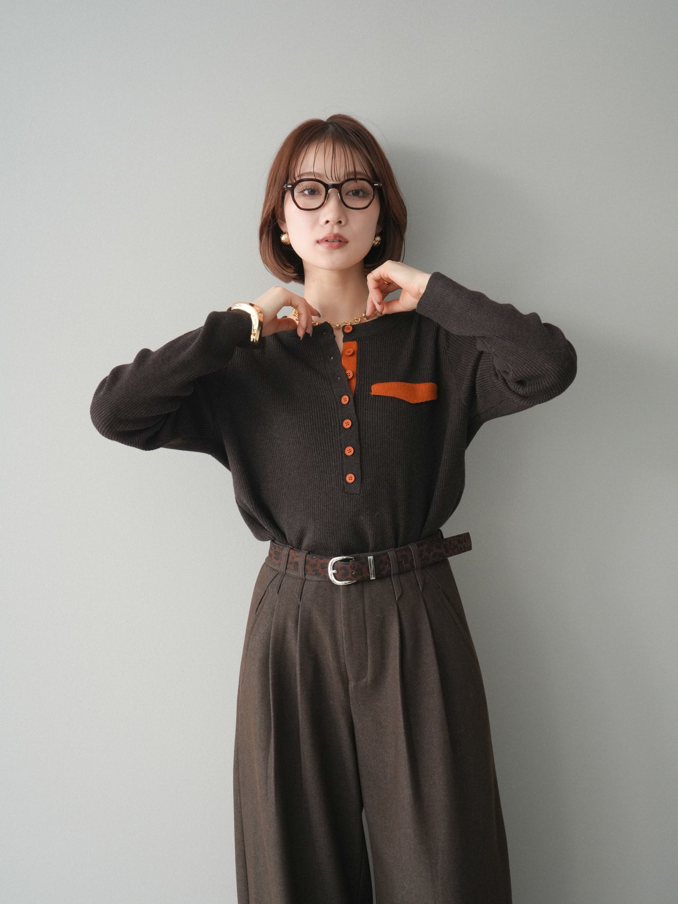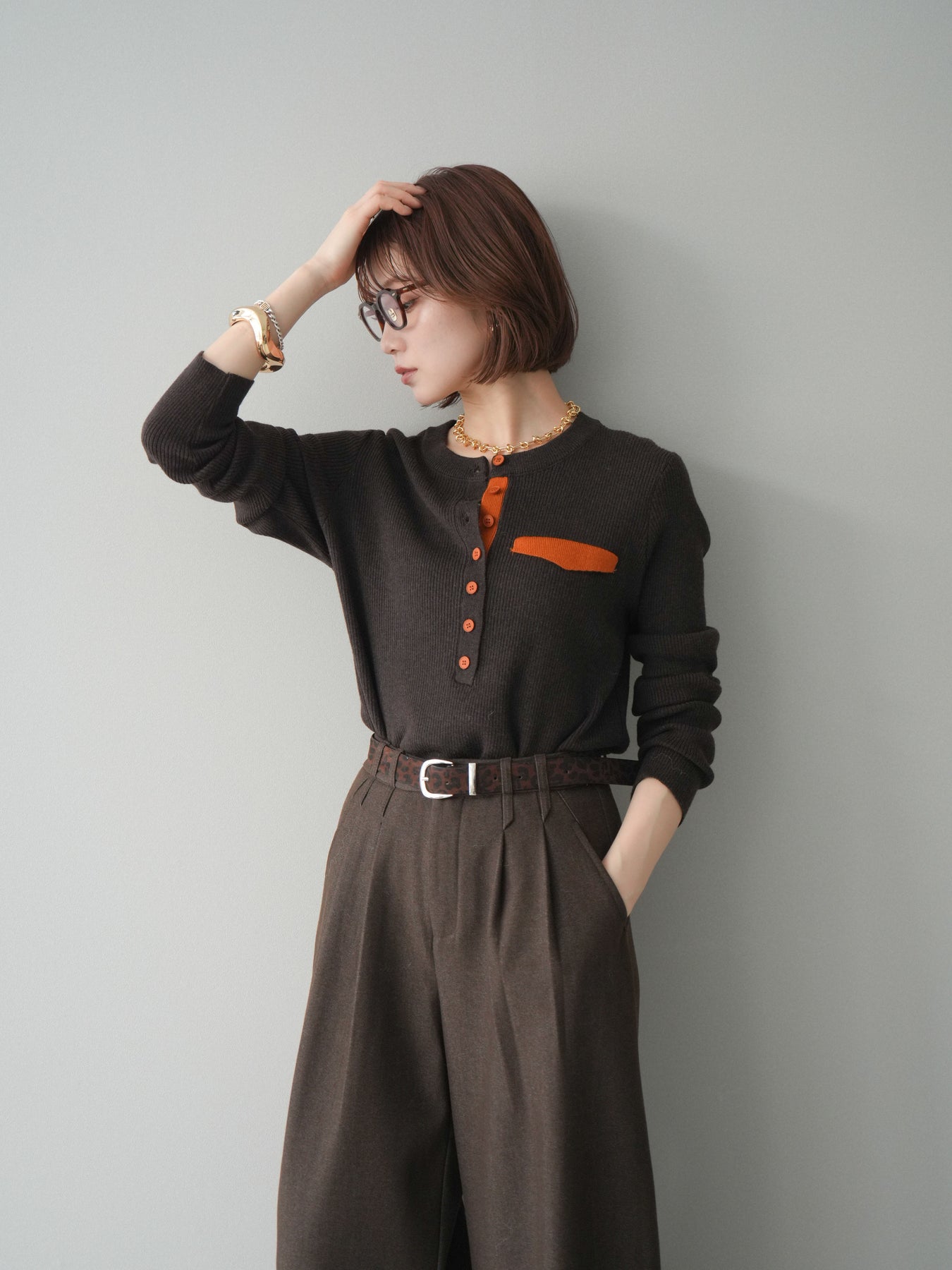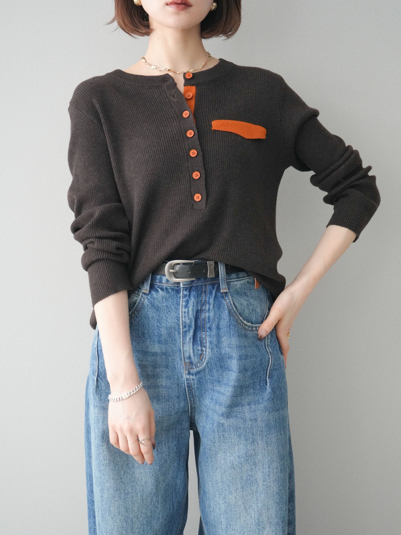 【預購】雙色拼接口袋亨利領針織衫/棕色