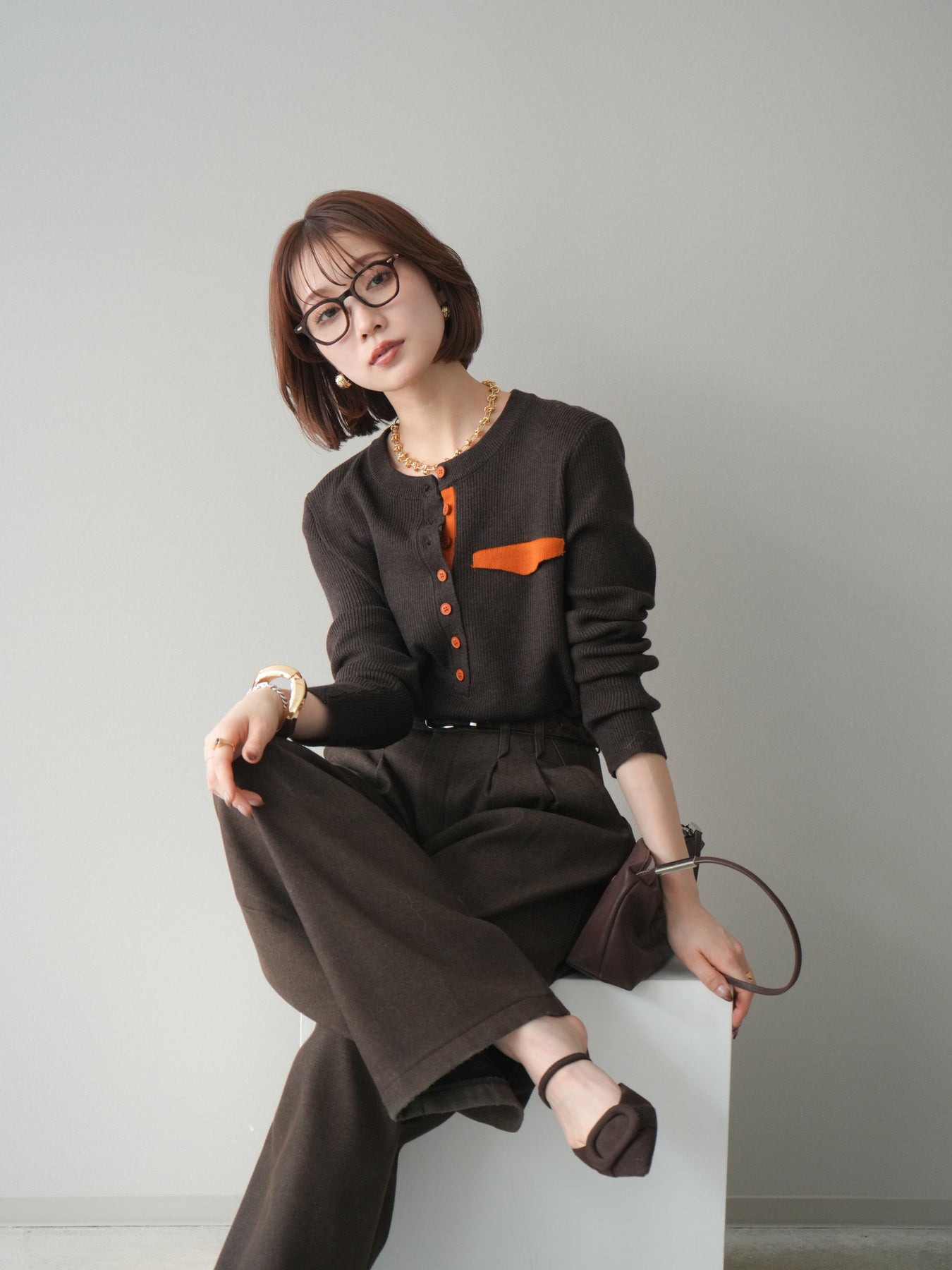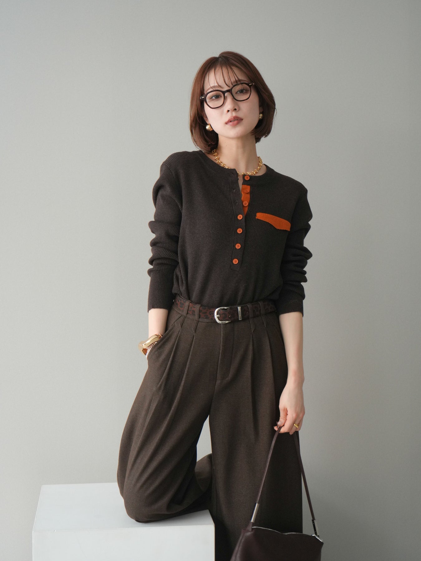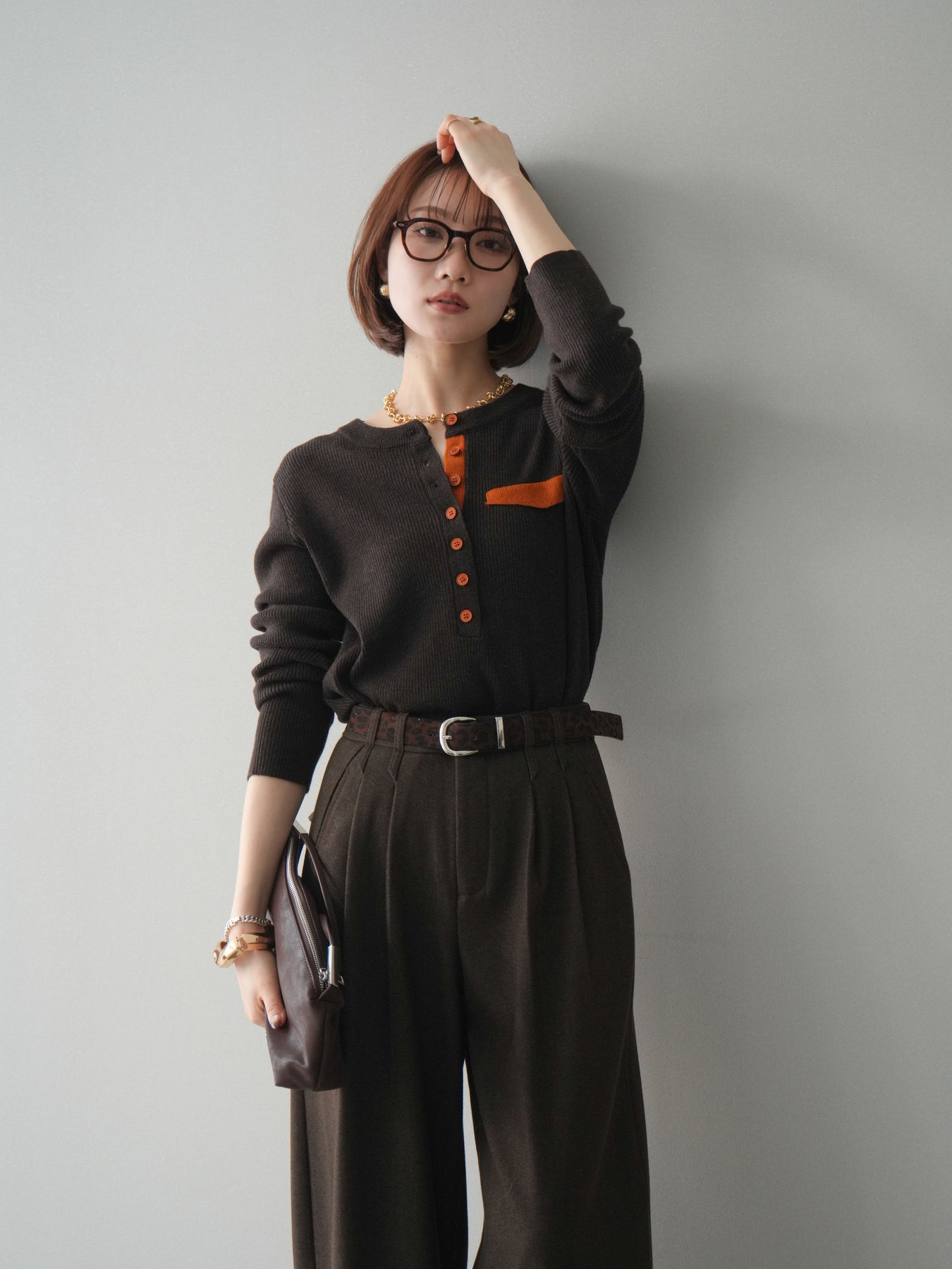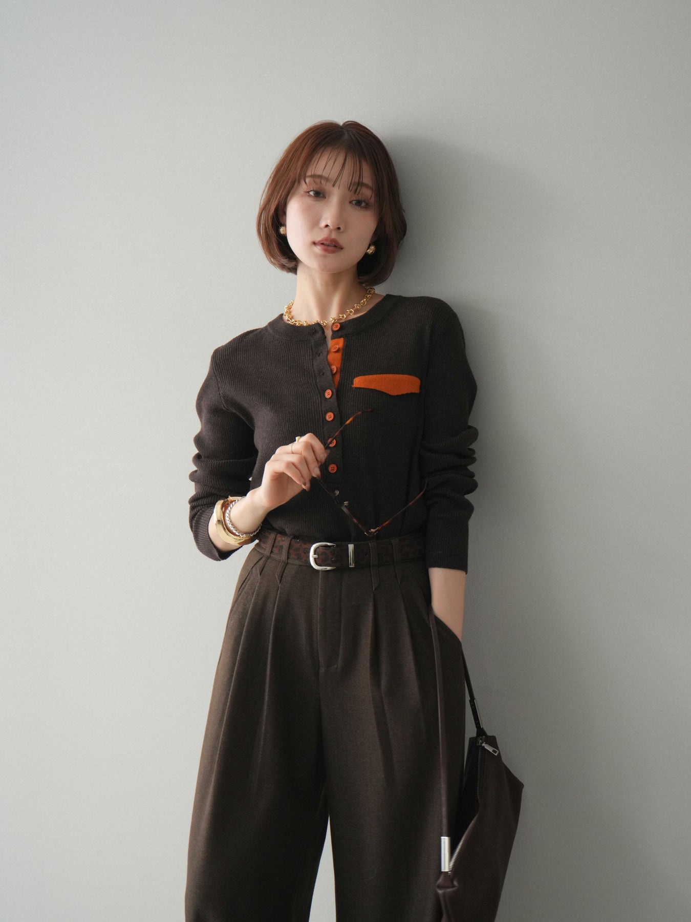 【預購】雙色拼接口袋亨利領針織衫/棕色
