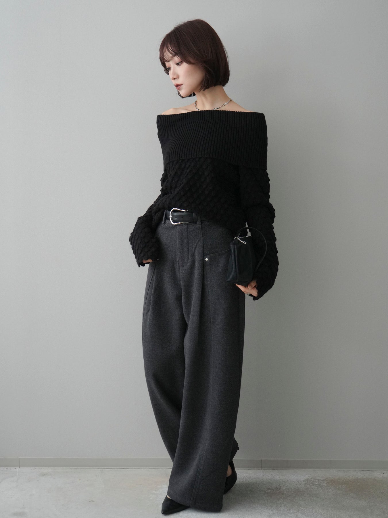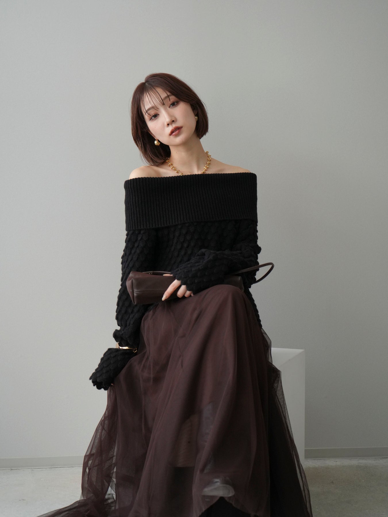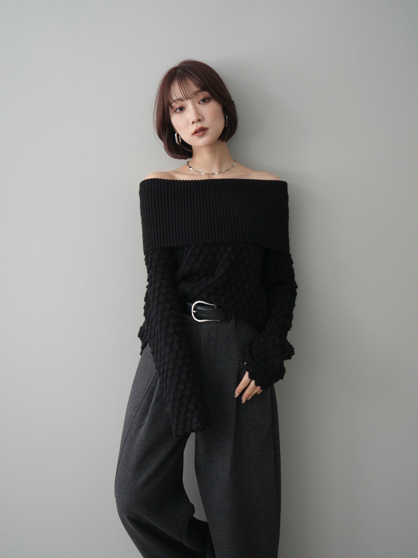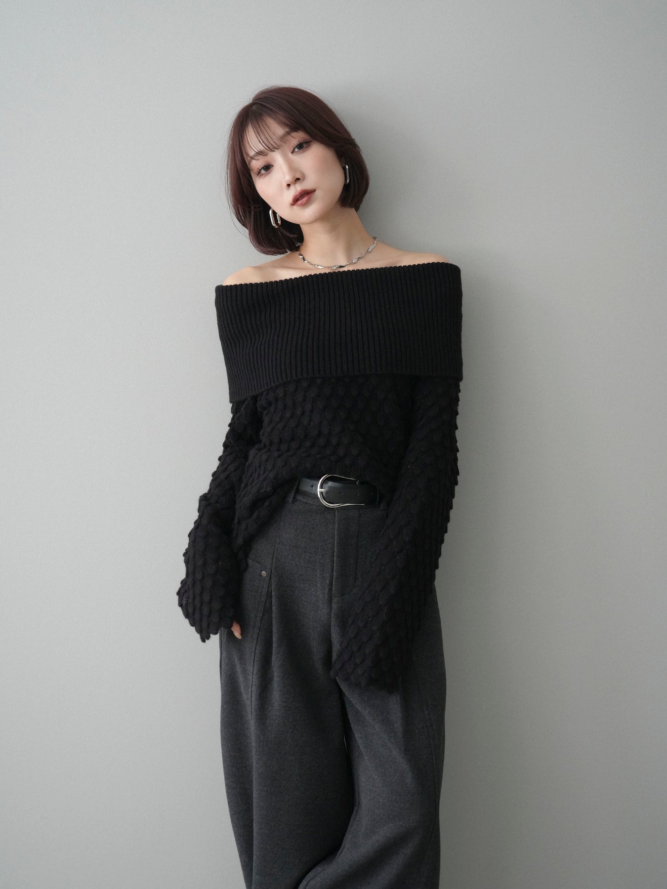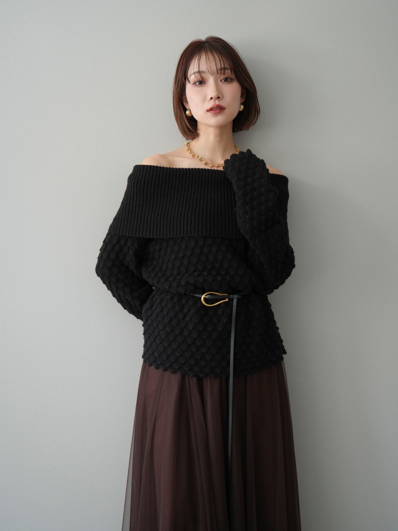 ポコポコとした立体感のある編み柄が印象的なオフショルニットプルオーバー。デコルテをきれいに見せるデザインで、程よく抜け感のあるスタイリングが完成します。一枚で存在感があり、シンプルなボトムスと合わせるだけでバランス良く決まる一着です。