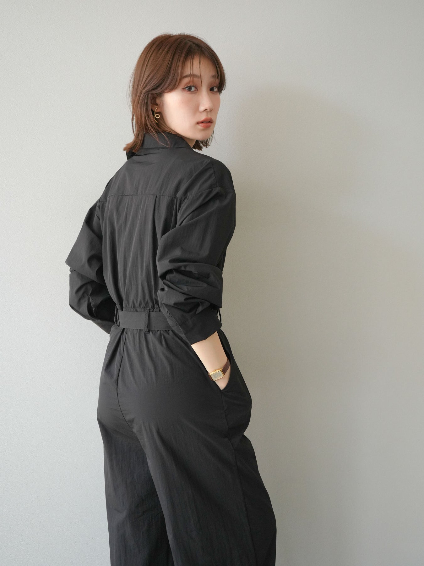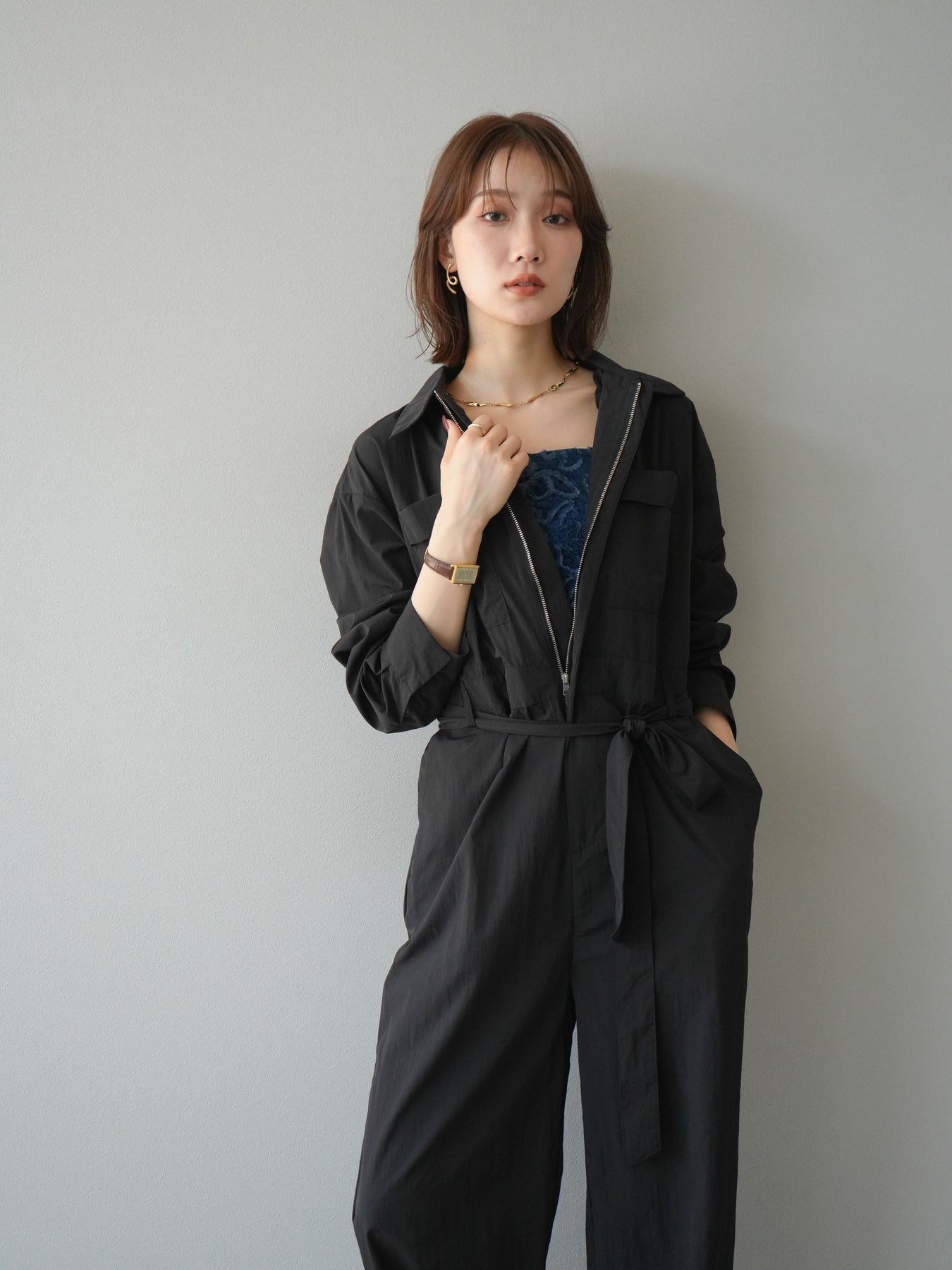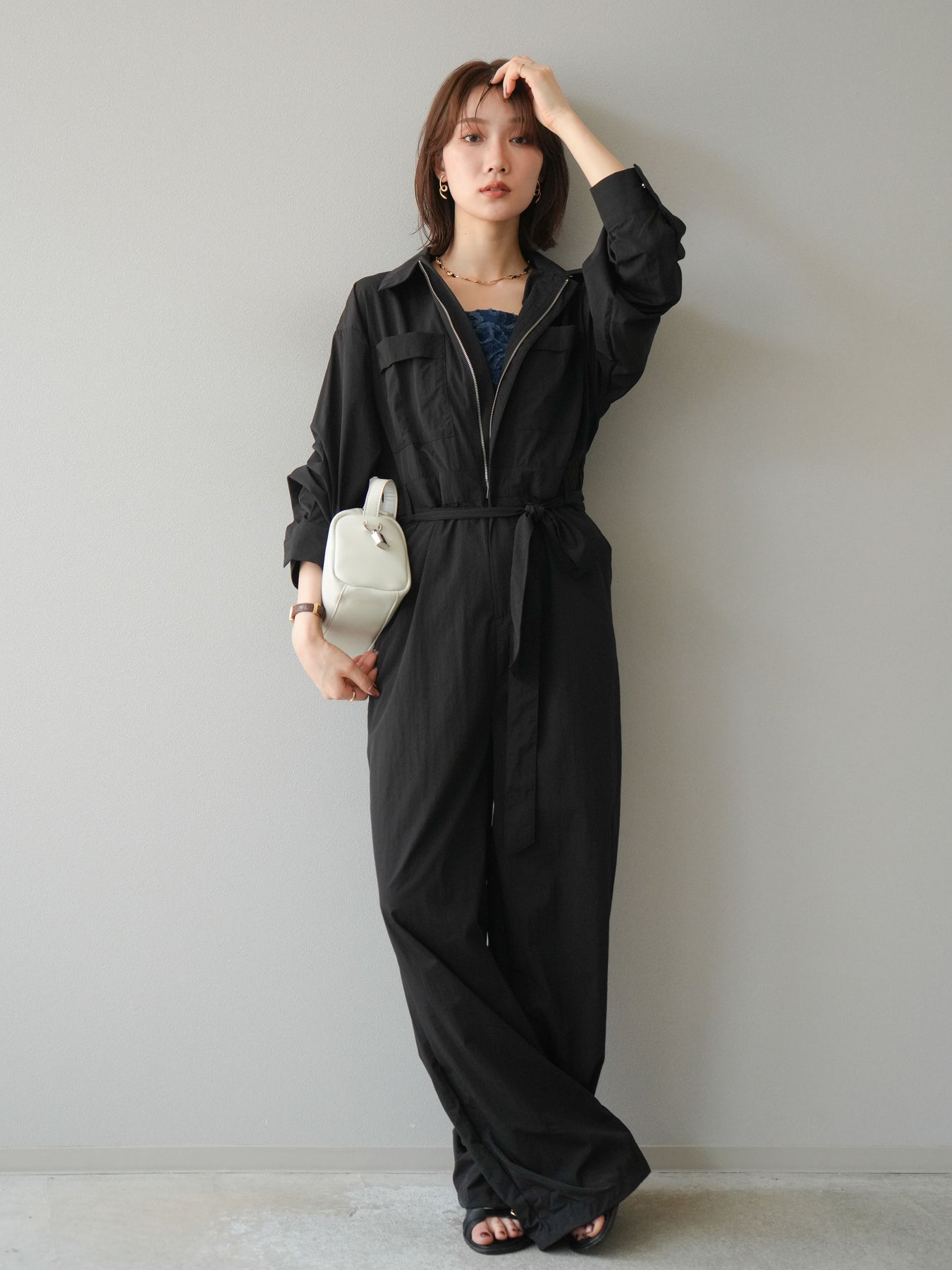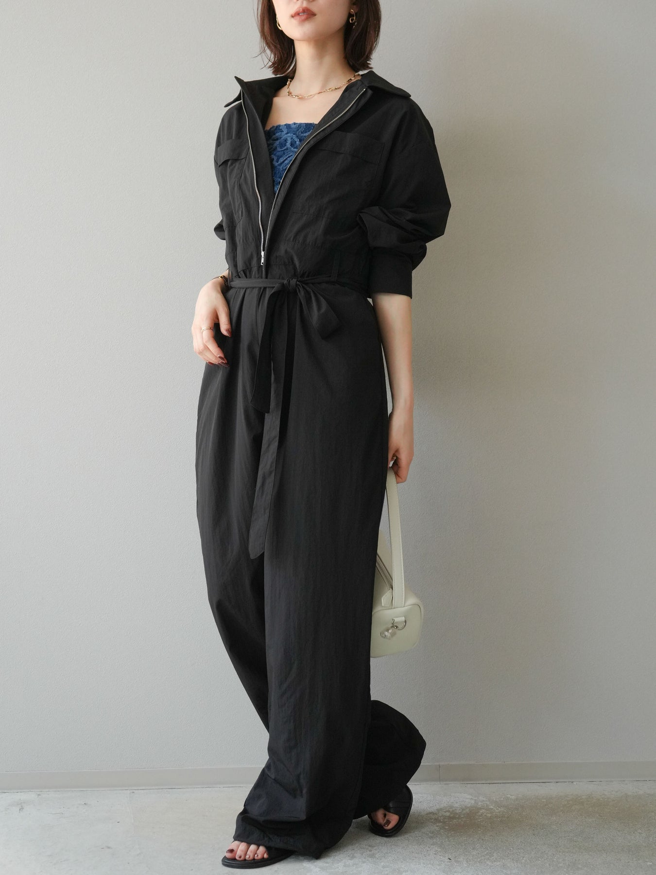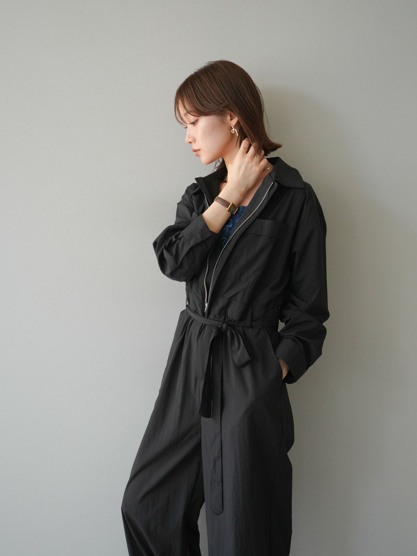 ミニマルなデザインとモード感を兼ね備えたナイロン素材のジャンプスーツ。 軽くしなやかな風合いで、ワイドなシルエットがこなれた印象を与えてくれます。 ウエストの共布ベルトでシルエットの調整も可能。 1枚でサマになる主役アイテムとして、デイリーにも旅行やお出かけにも活躍します。