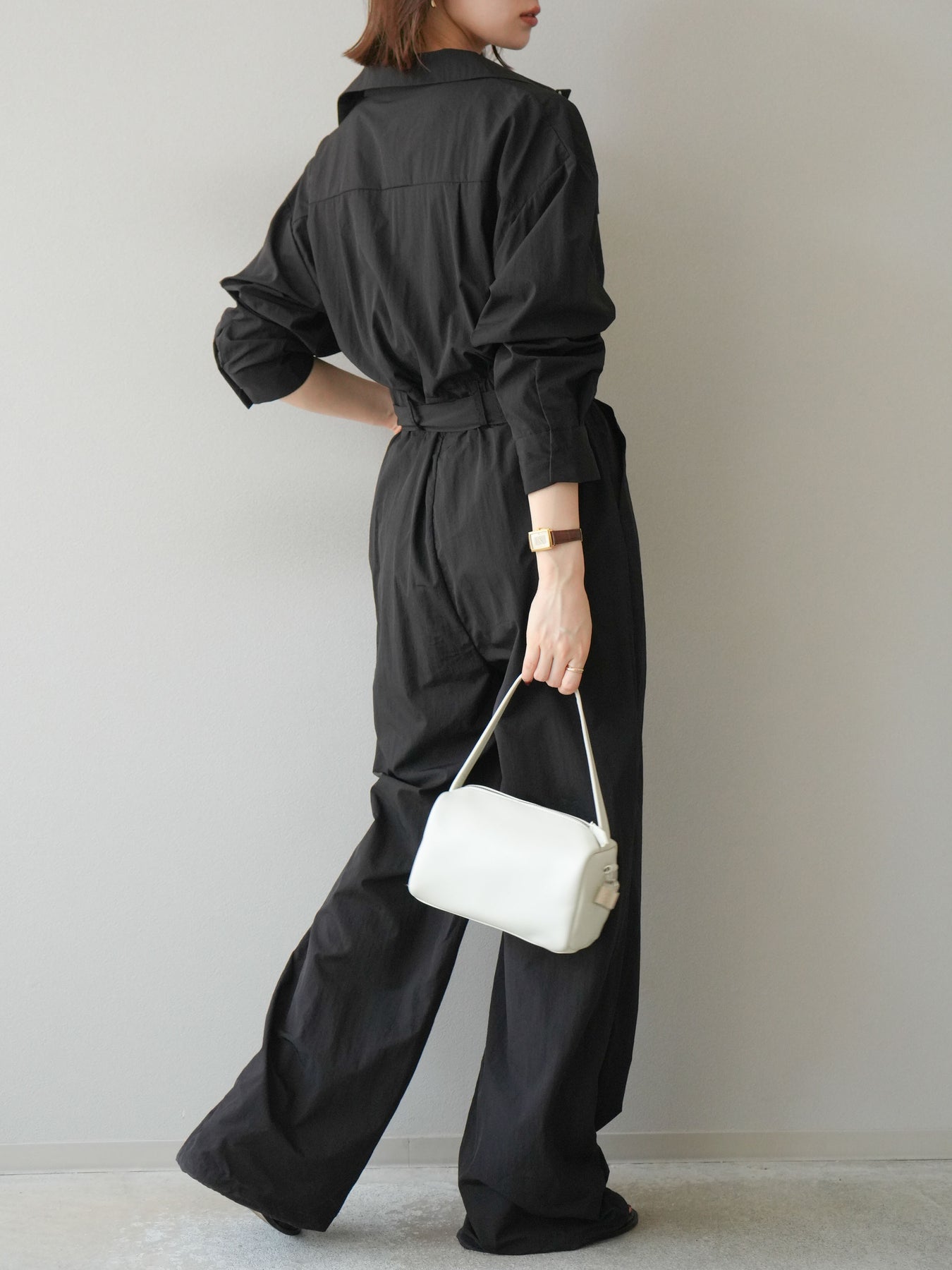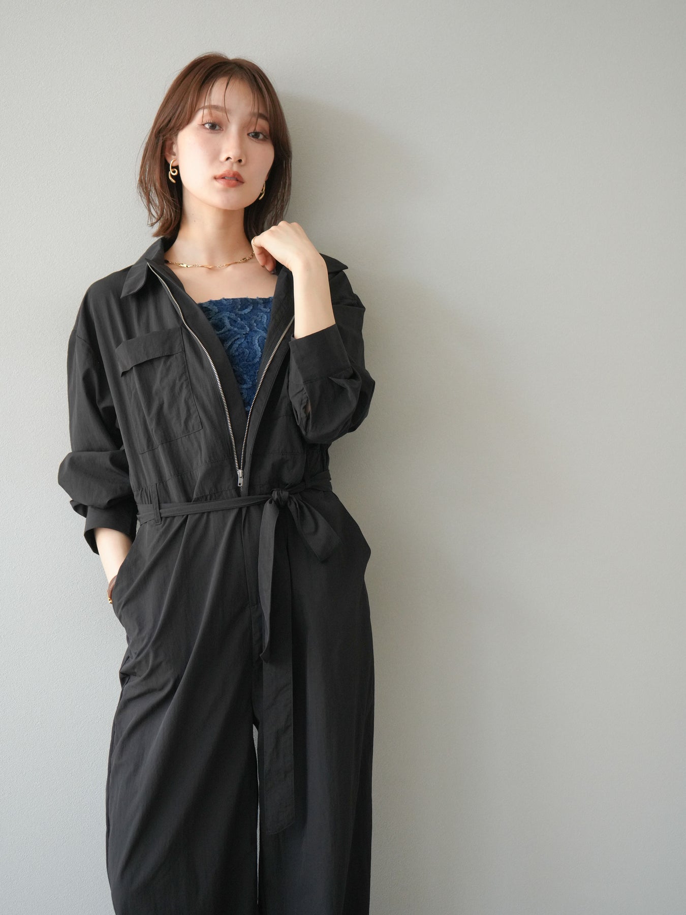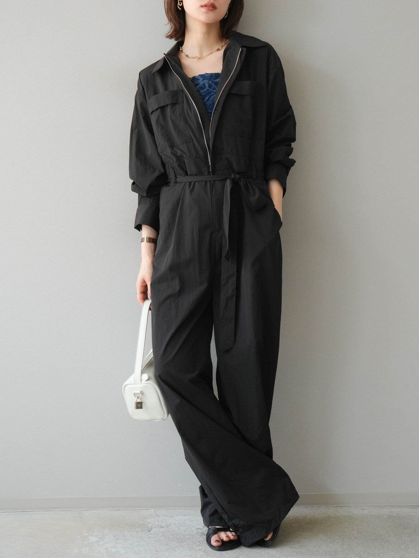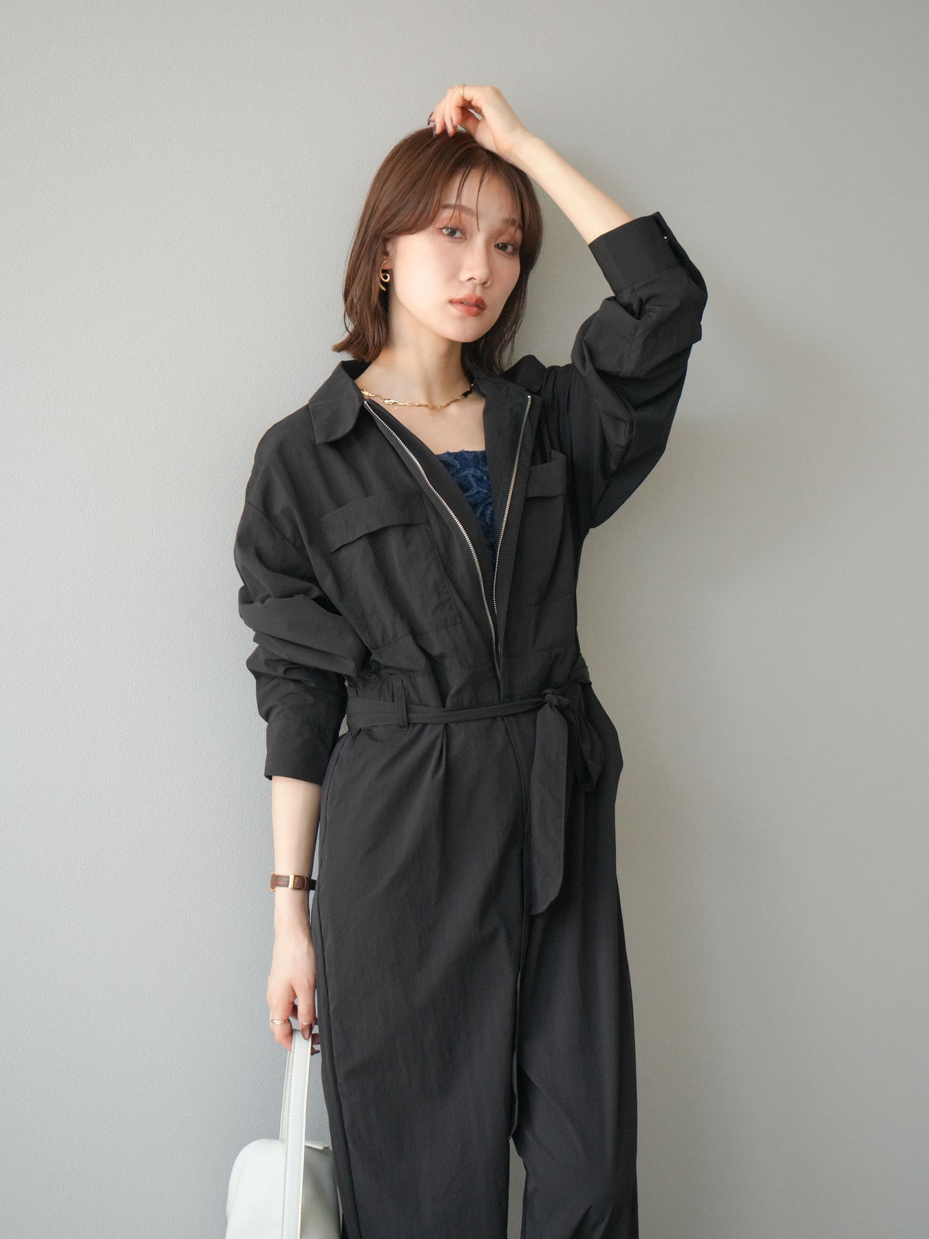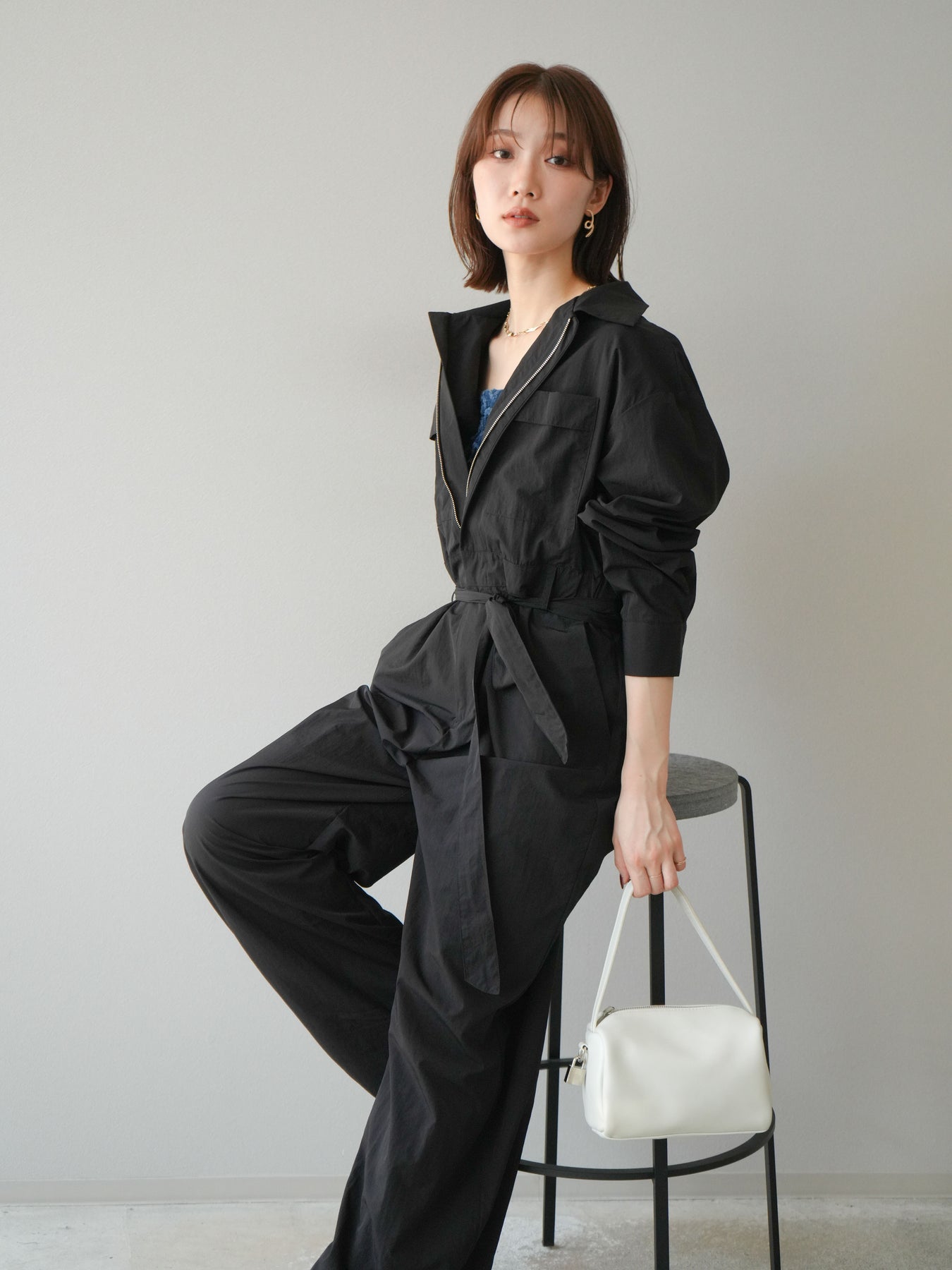 ミニマルなデザインとモード感を兼ね備えたナイロン素材のジャンプスーツ。 軽くしなやかな風合いで、ワイドなシルエットがこなれた印象を与えてくれます。 ウエストの共布ベルトでシルエットの調整も可能。 1枚でサマになる主役アイテムとして、デイリーにも旅行やお出かけにも活躍します。