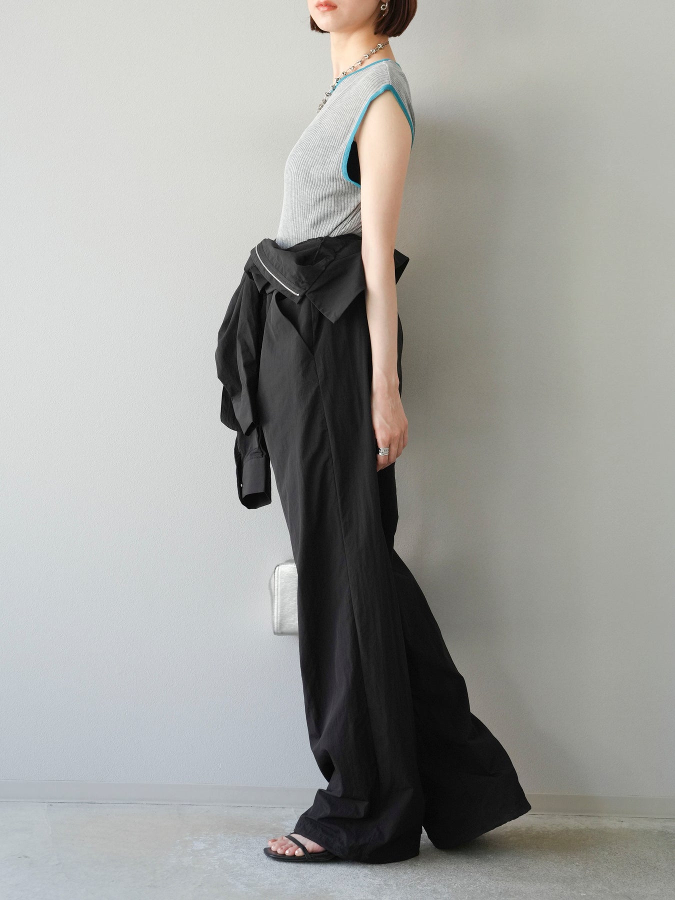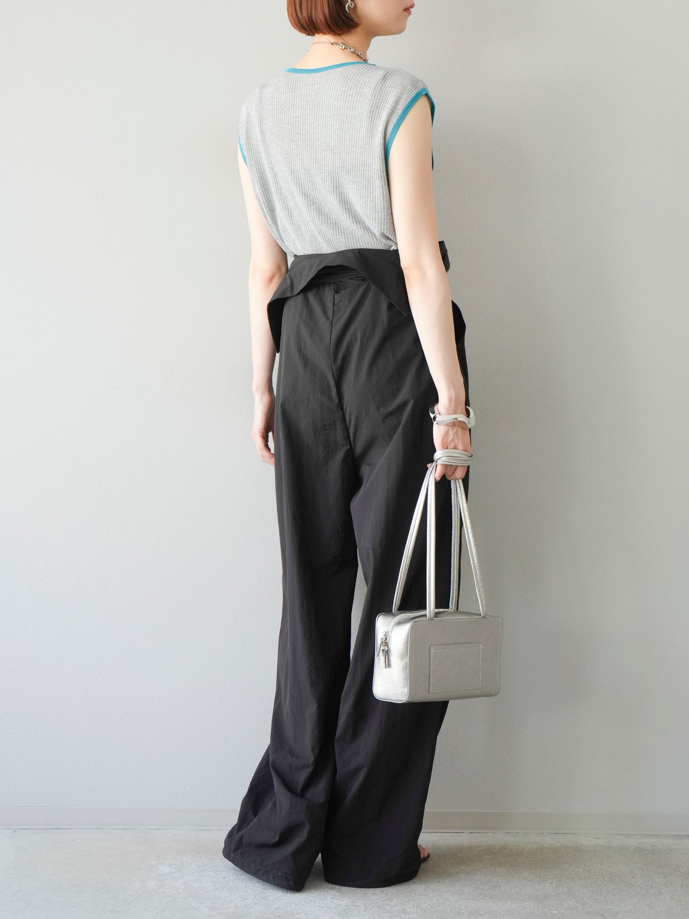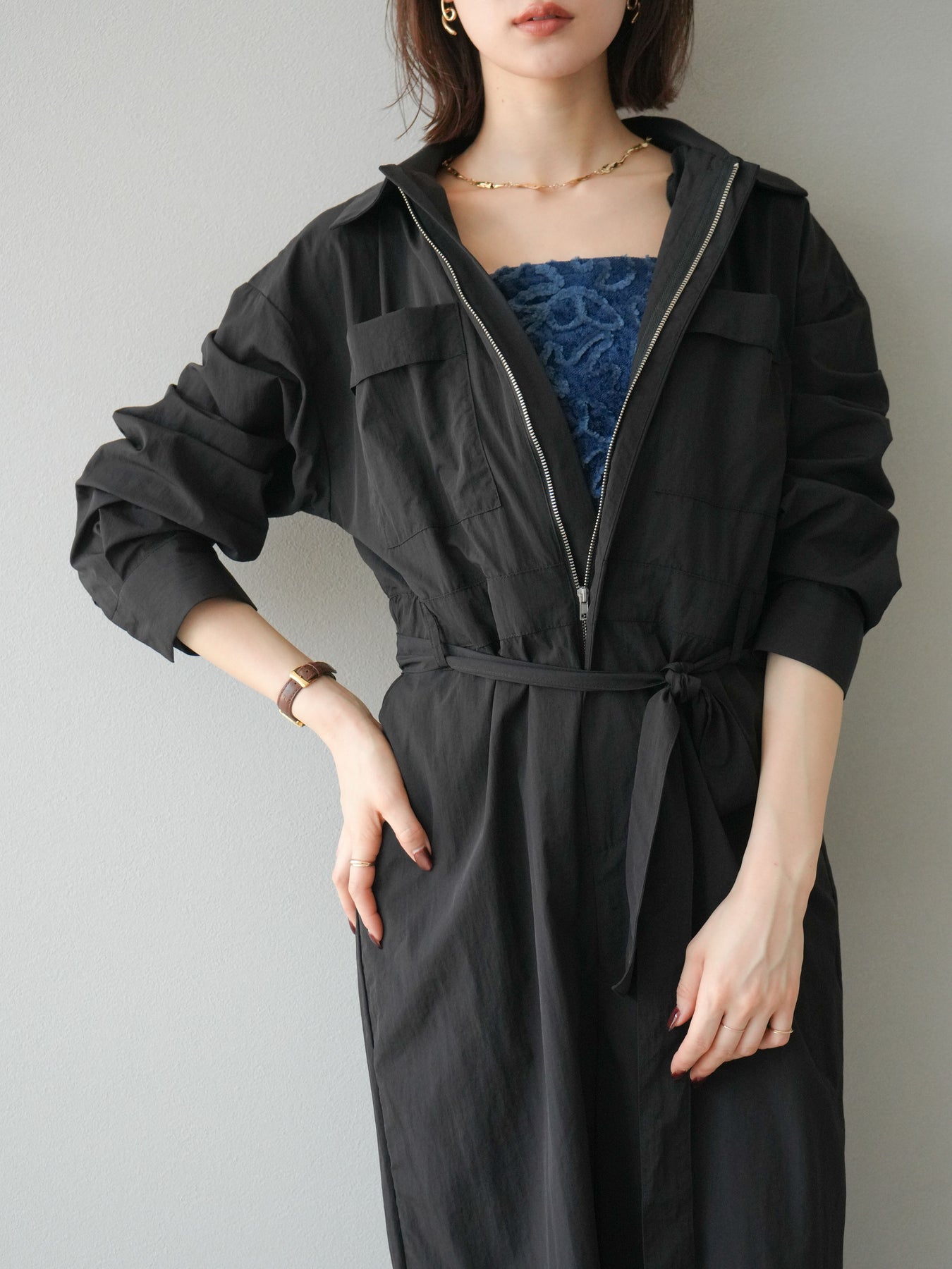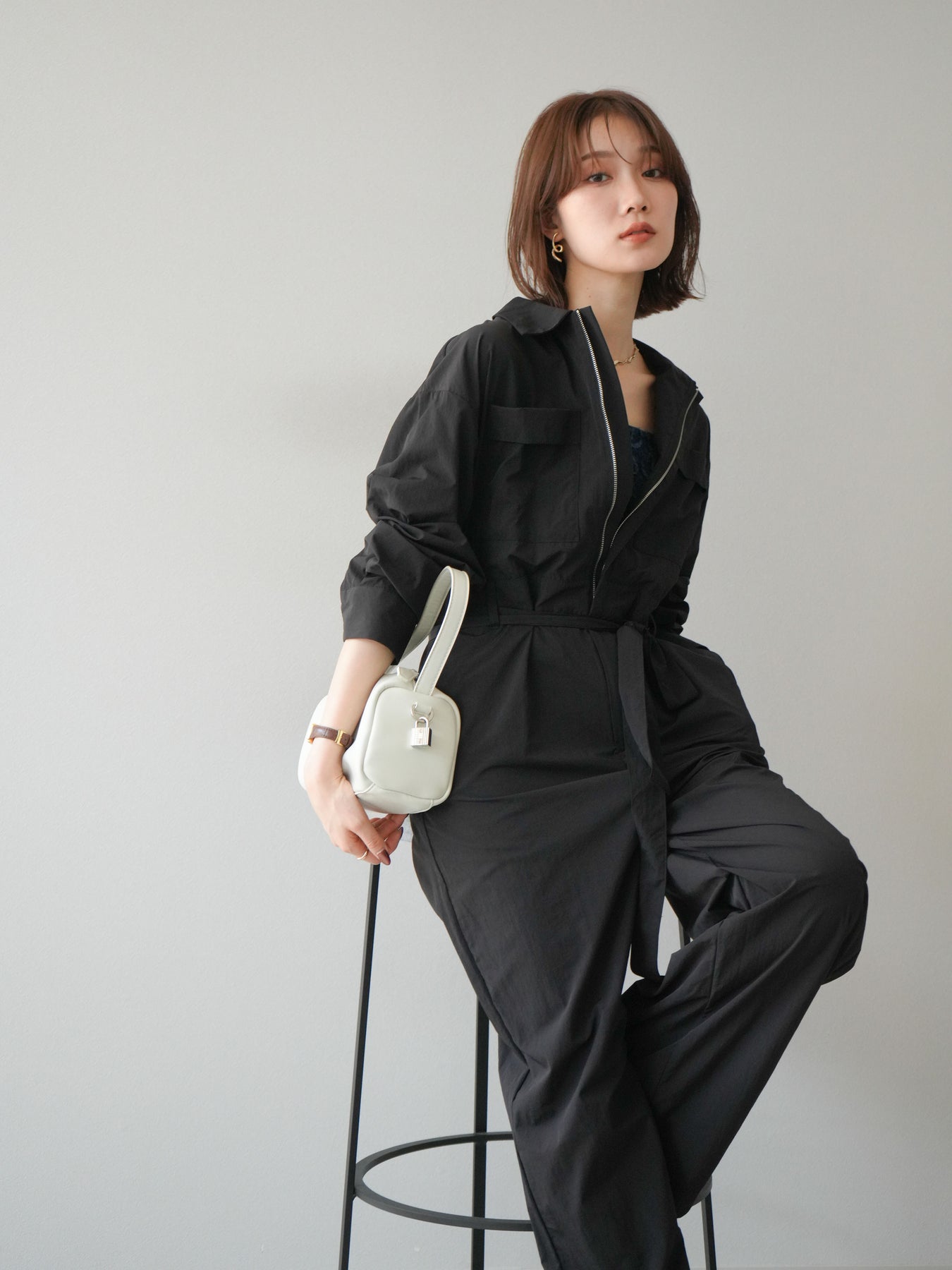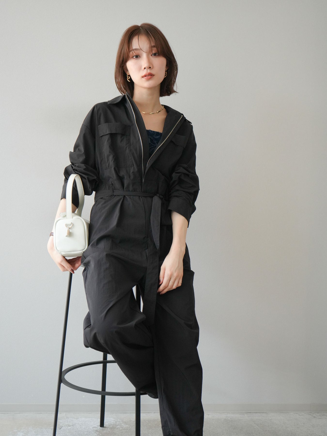 ミニマルなデザインとモード感を兼ね備えたナイロン素材のジャンプスーツ。 軽くしなやかな風合いで、ワイドなシルエットがこなれた印象を与えてくれます。 ウエストの共布ベルトでシルエットの調整も可能。 1枚でサマになる主役アイテムとして、デイリーにも旅行やお出かけにも活躍します。