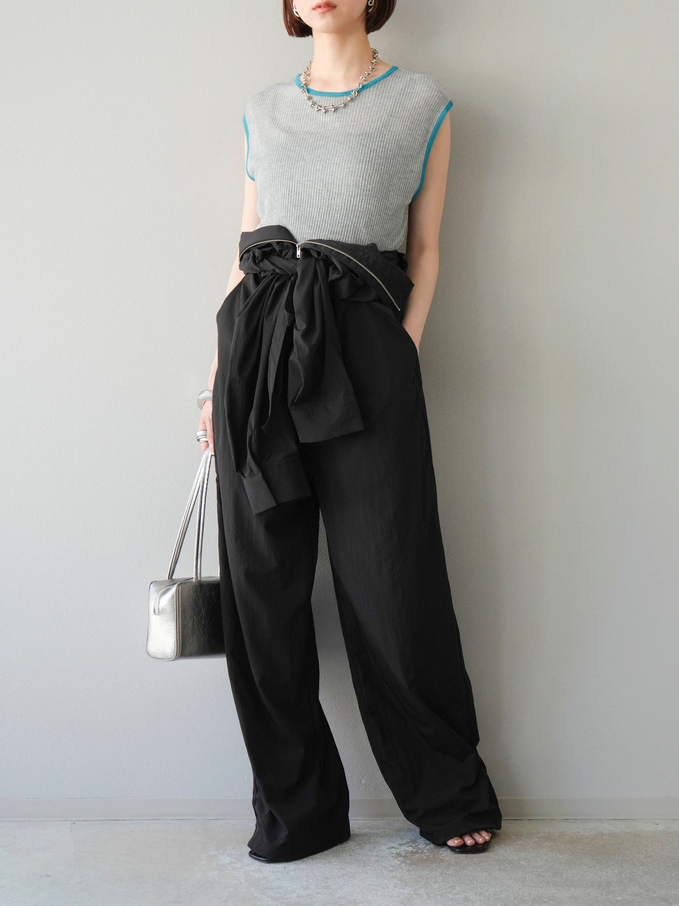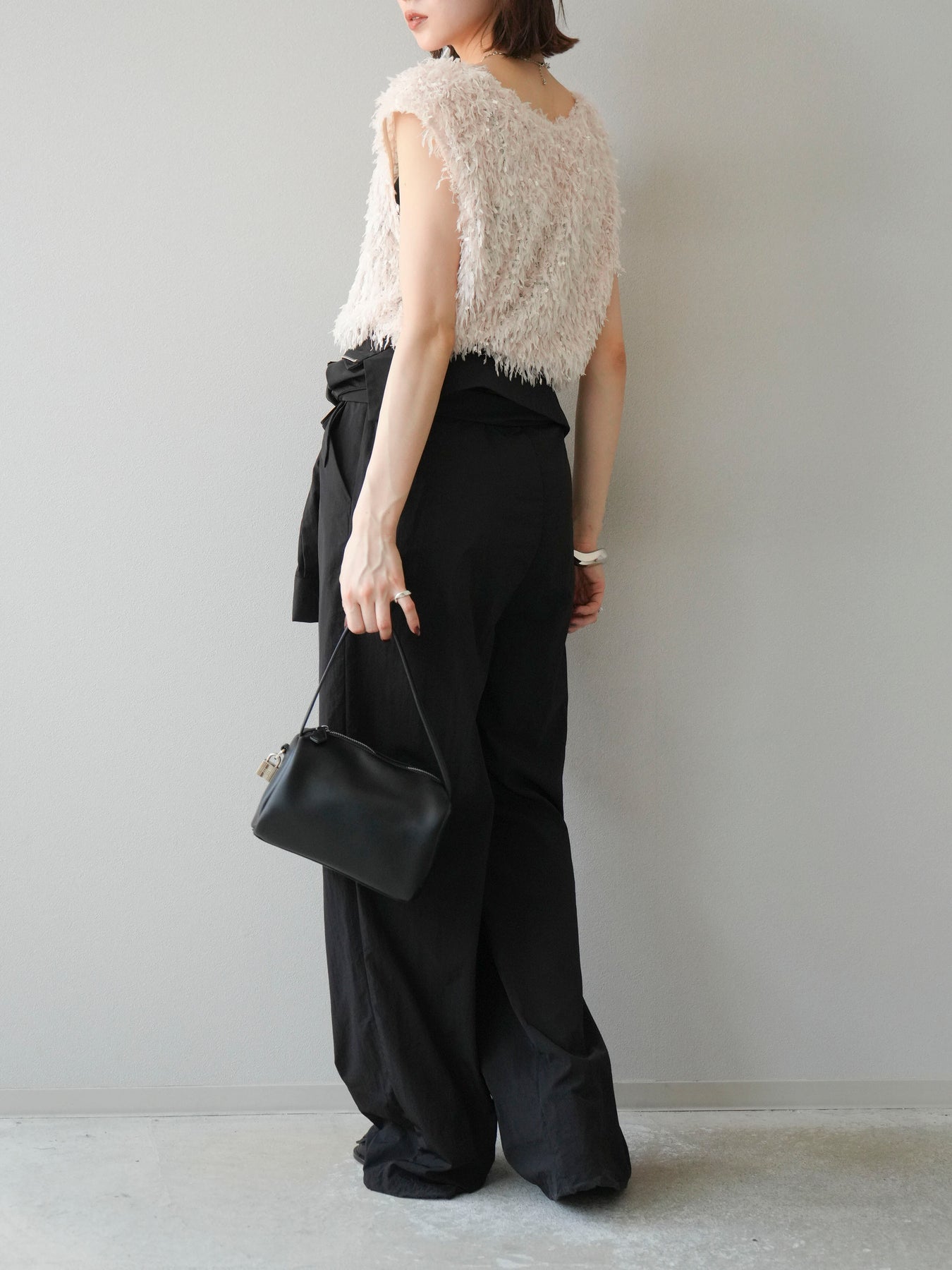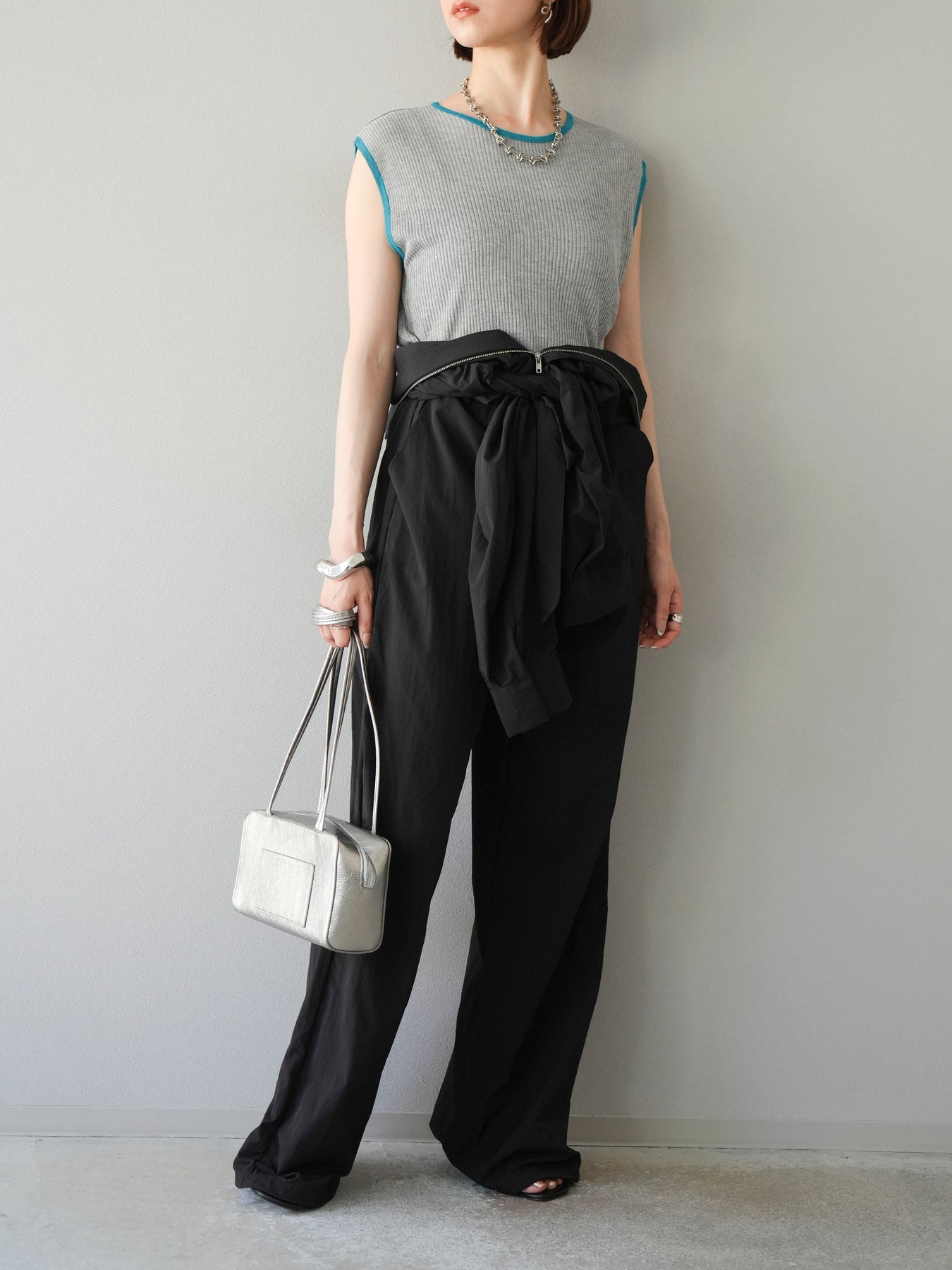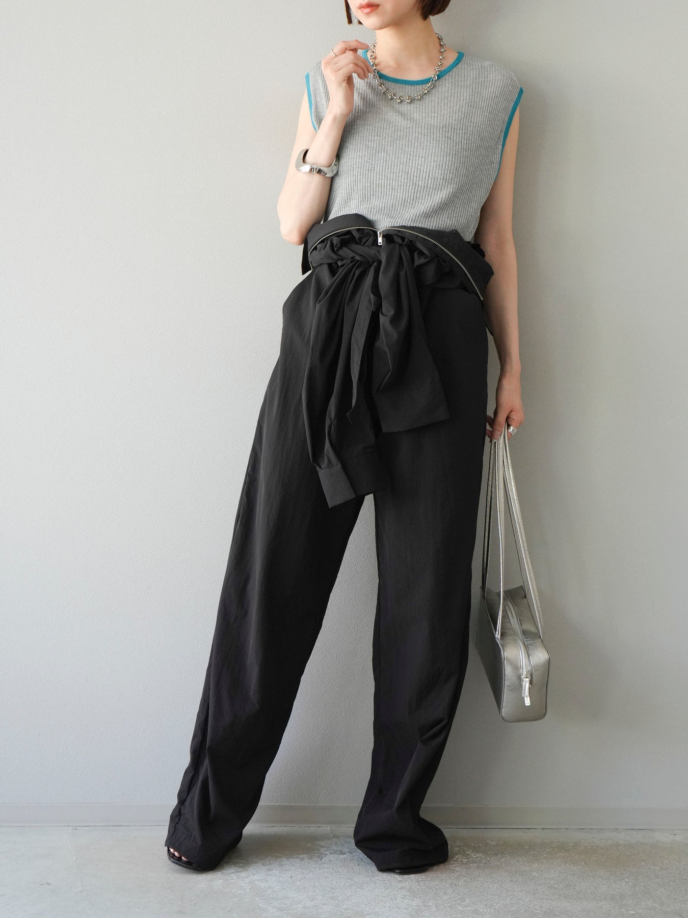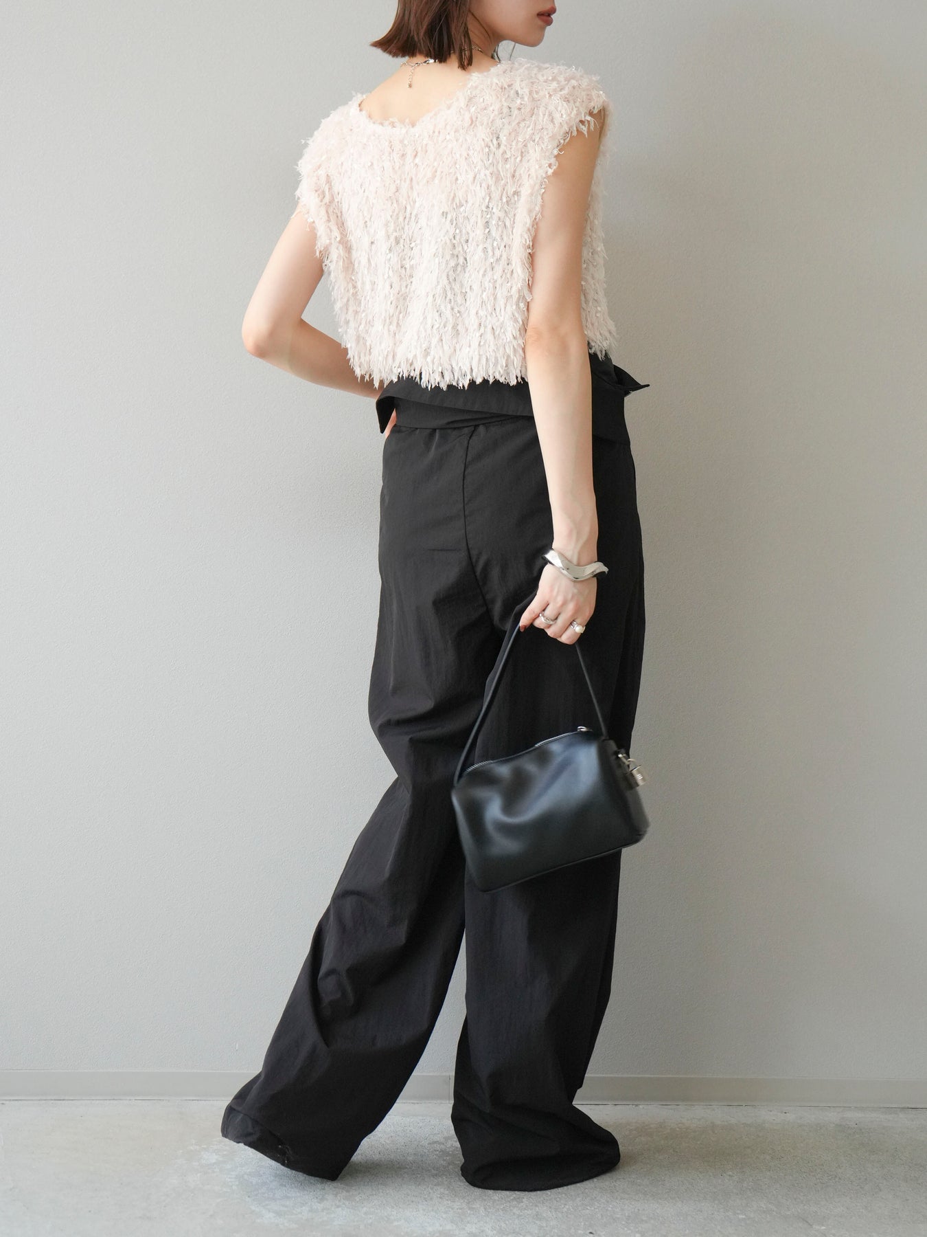 ミニマルなデザインとモード感を兼ね備えたナイロン素材のジャンプスーツ。 軽くしなやかな風合いで、ワイドなシルエットがこなれた印象を与えてくれます。 ウエストの共布ベルトでシルエットの調整も可能。 1枚でサマになる主役アイテムとして、デイリーにも旅行やお出かけにも活躍します。