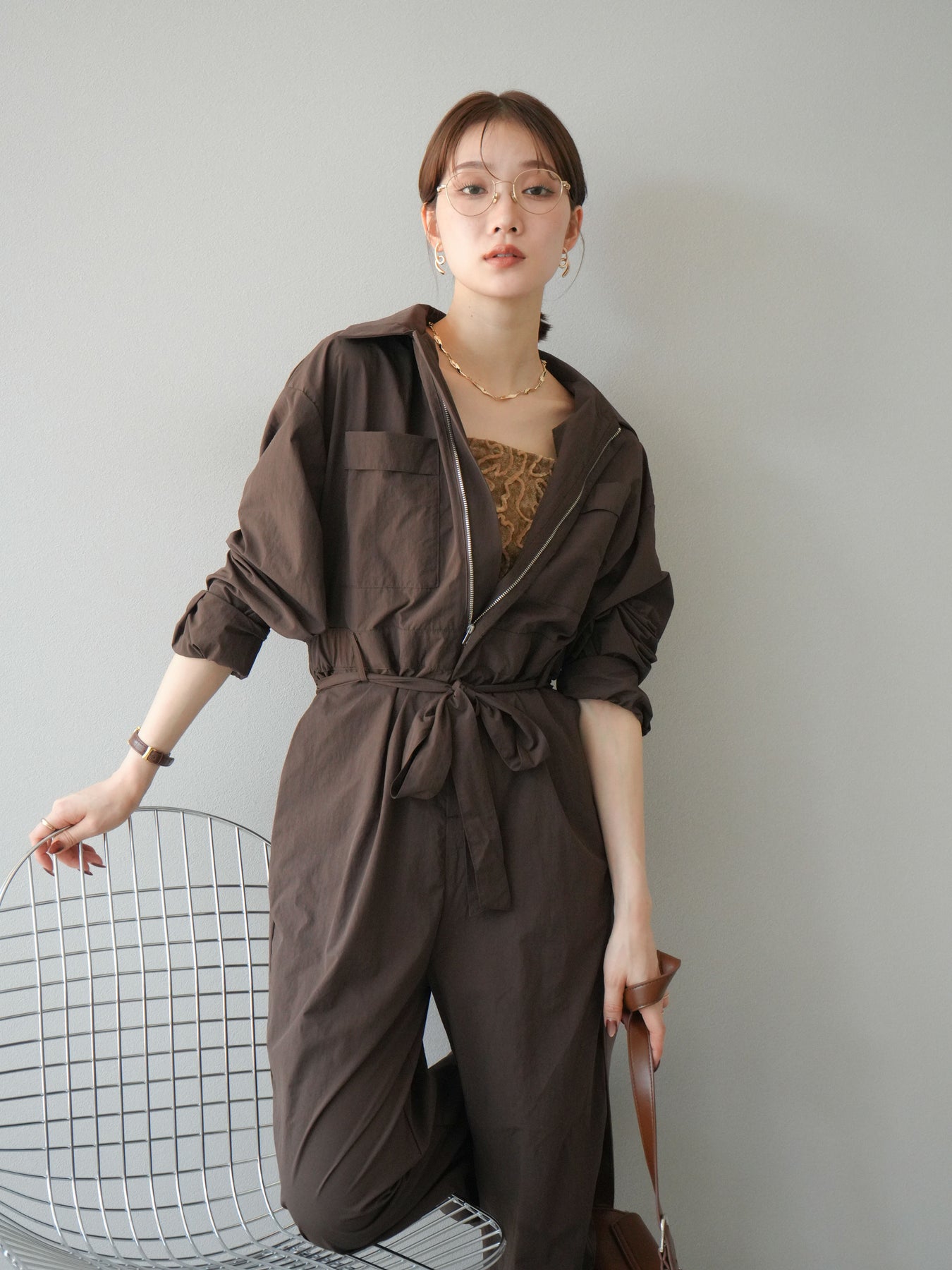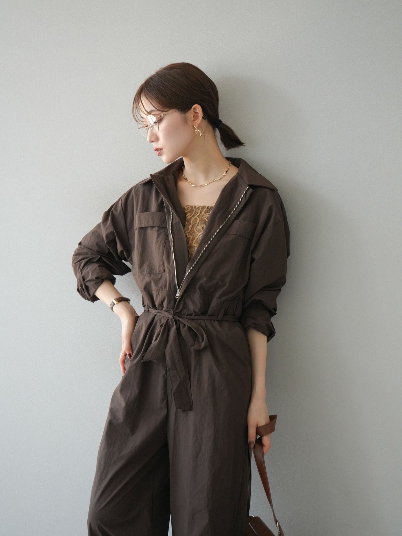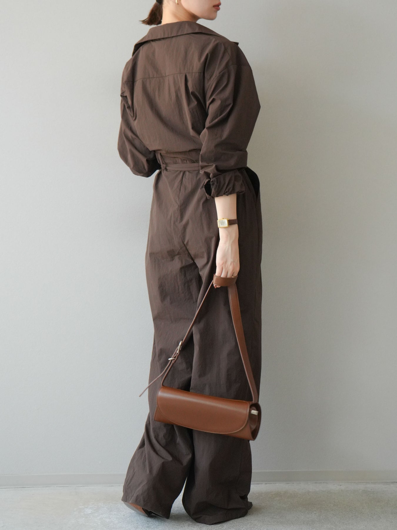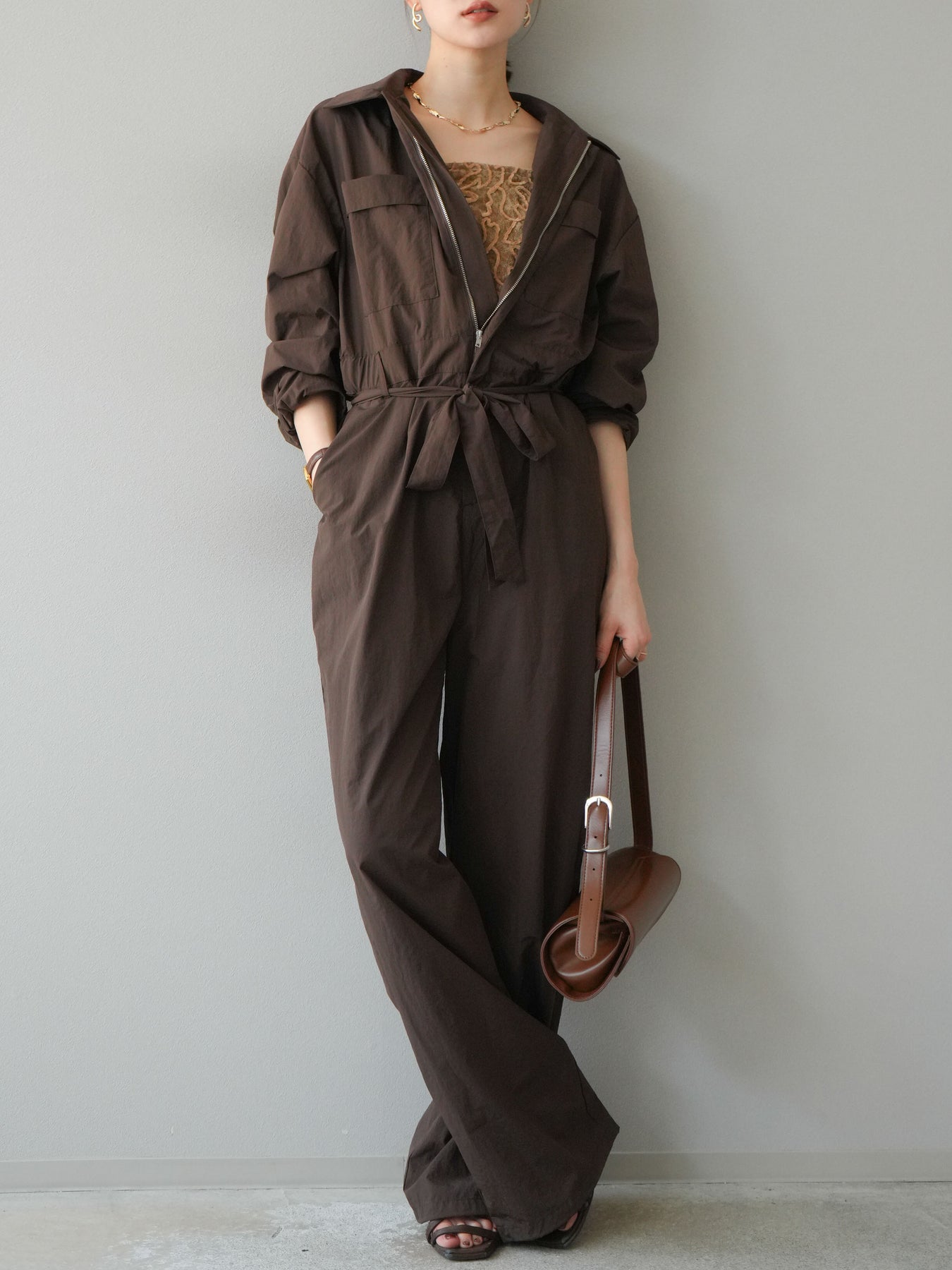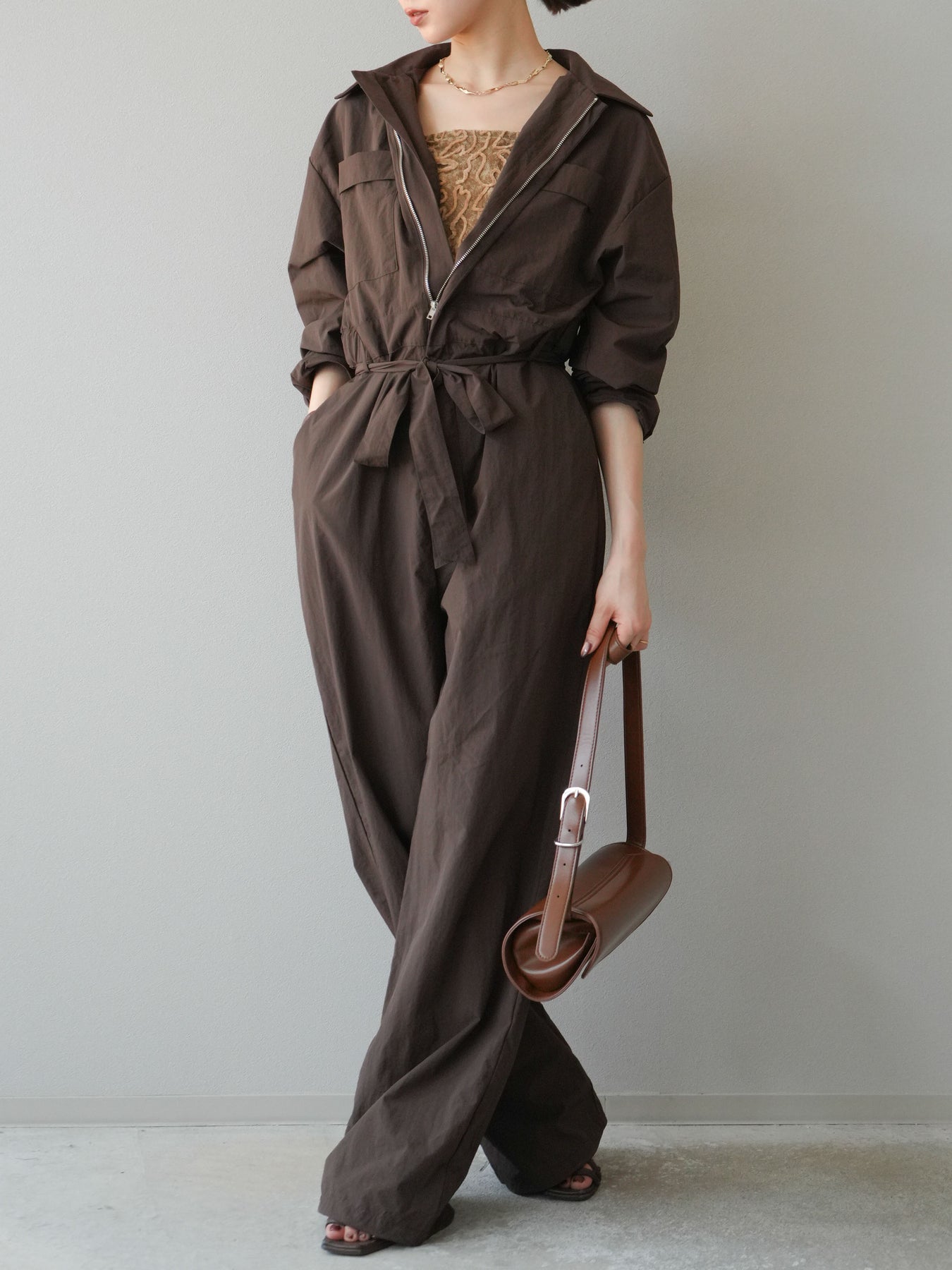 ミニマルなデザインとモード感を兼ね備えたナイロン素材のジャンプスーツ。 軽くしなやかな風合いで、ワイドなシルエットがこなれた印象を与えてくれます。 ウエストの共布ベルトでシルエットの調整も可能。 1枚でサマになる主役アイテムとして、デイリーにも旅行やお出かけにも活躍します。